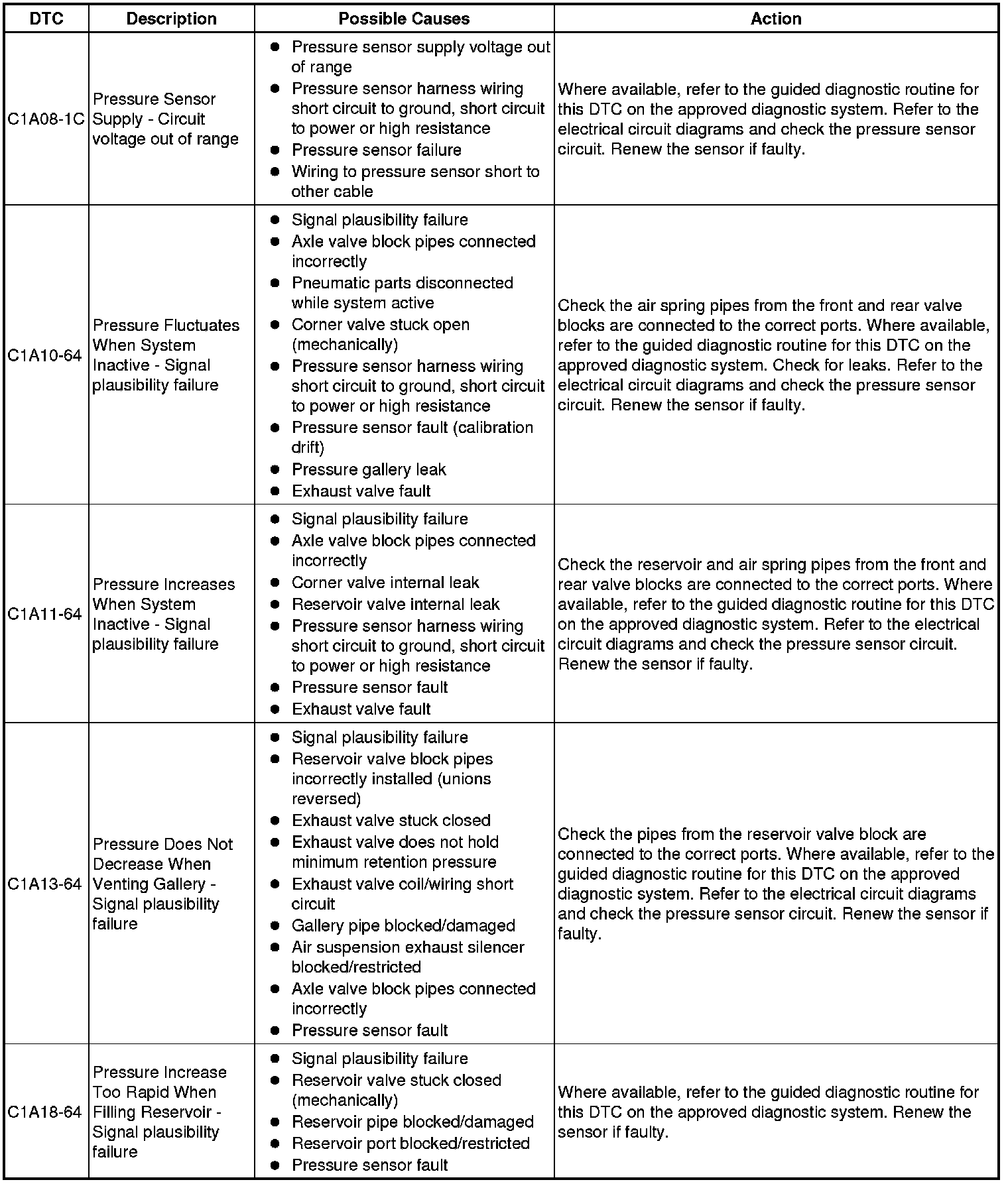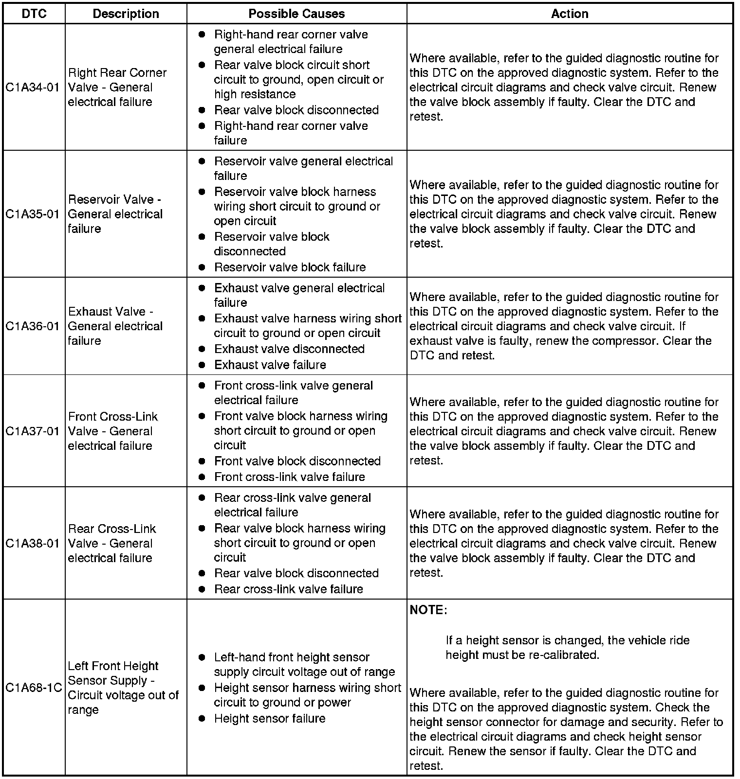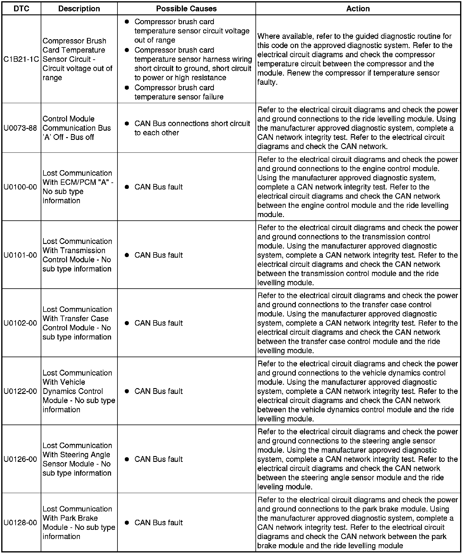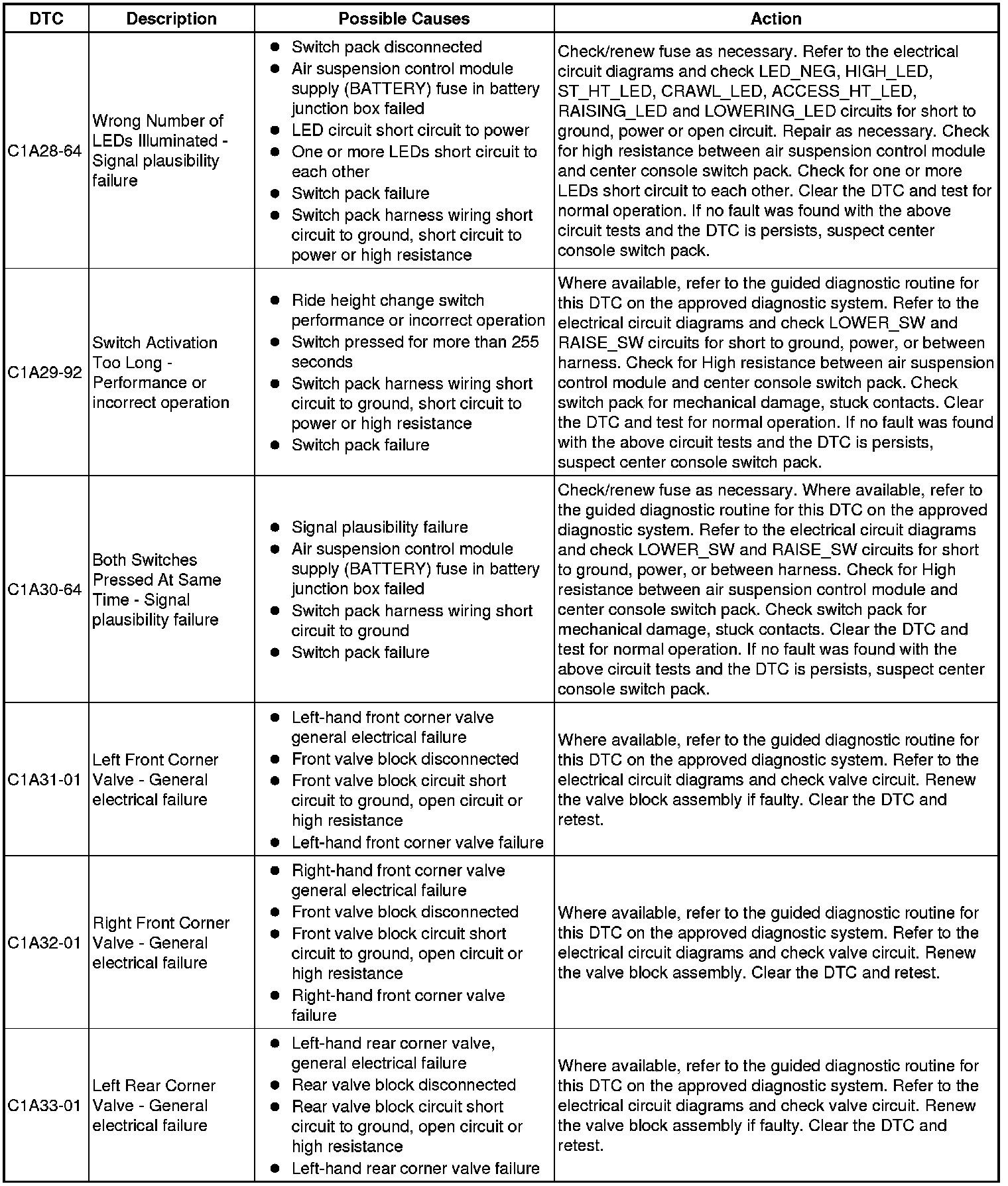The table below lists all Diagnostic Trouble Codes (DTCs) that could be logged in the Air Suspension Control Module, for additional Diagnosis and Testing information refer to the relevant Diagnosis and Testing Section. For additional information, refer to Vehicle Dynamic Suspension