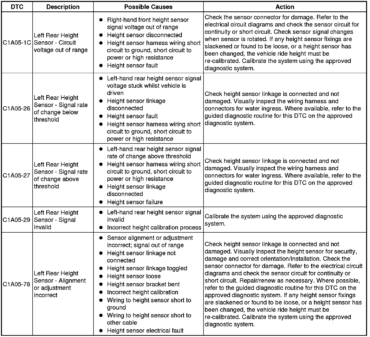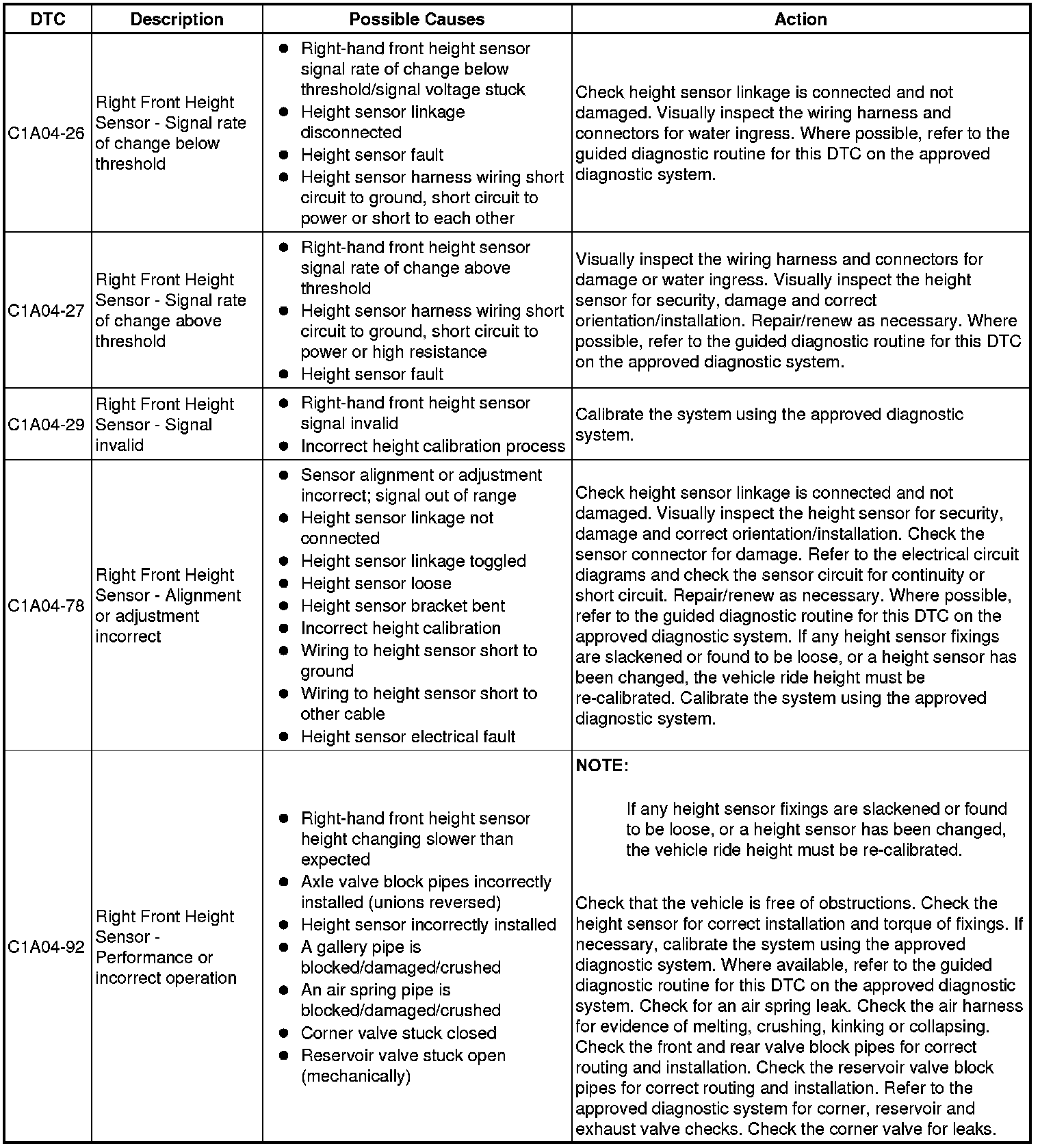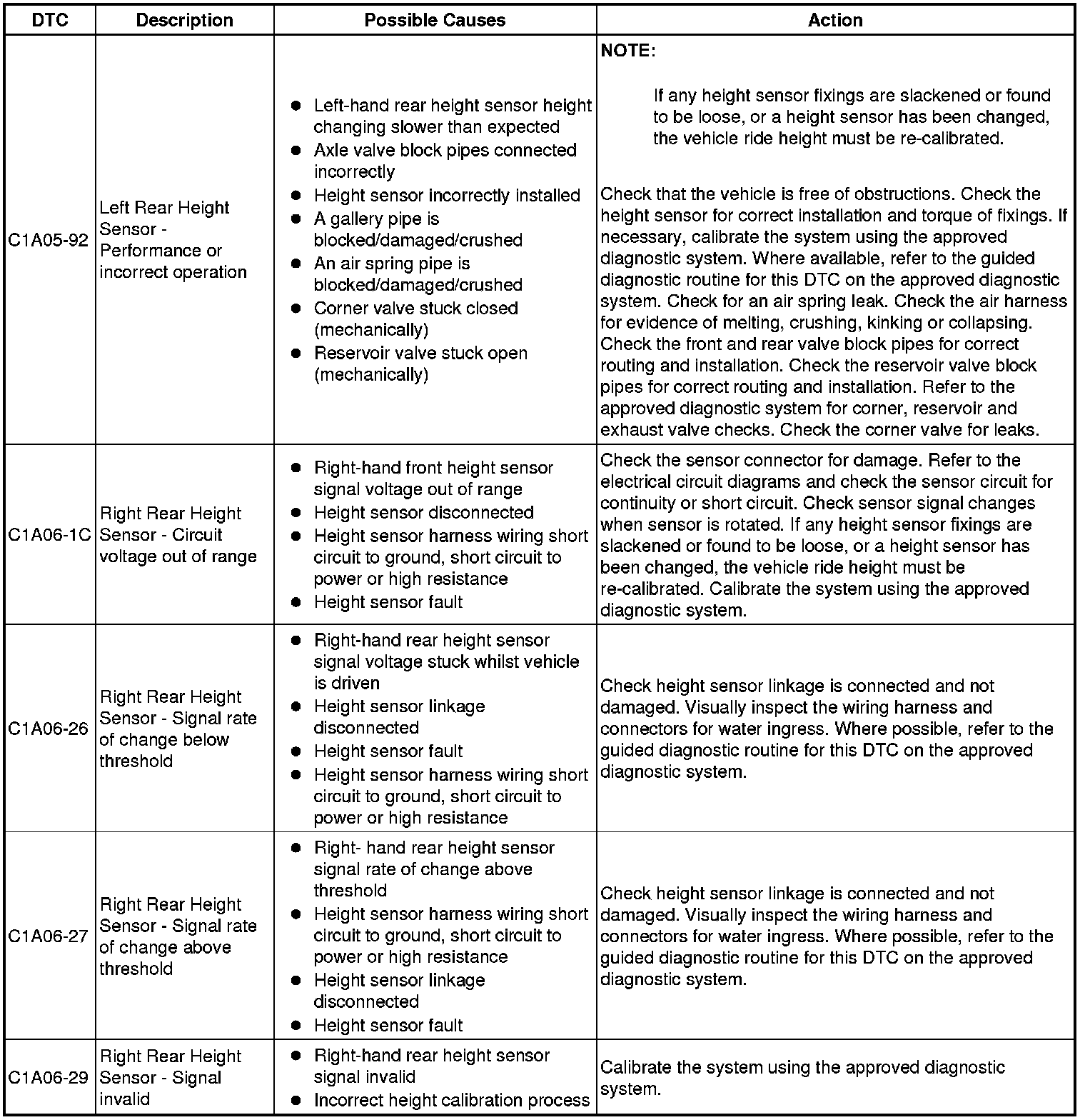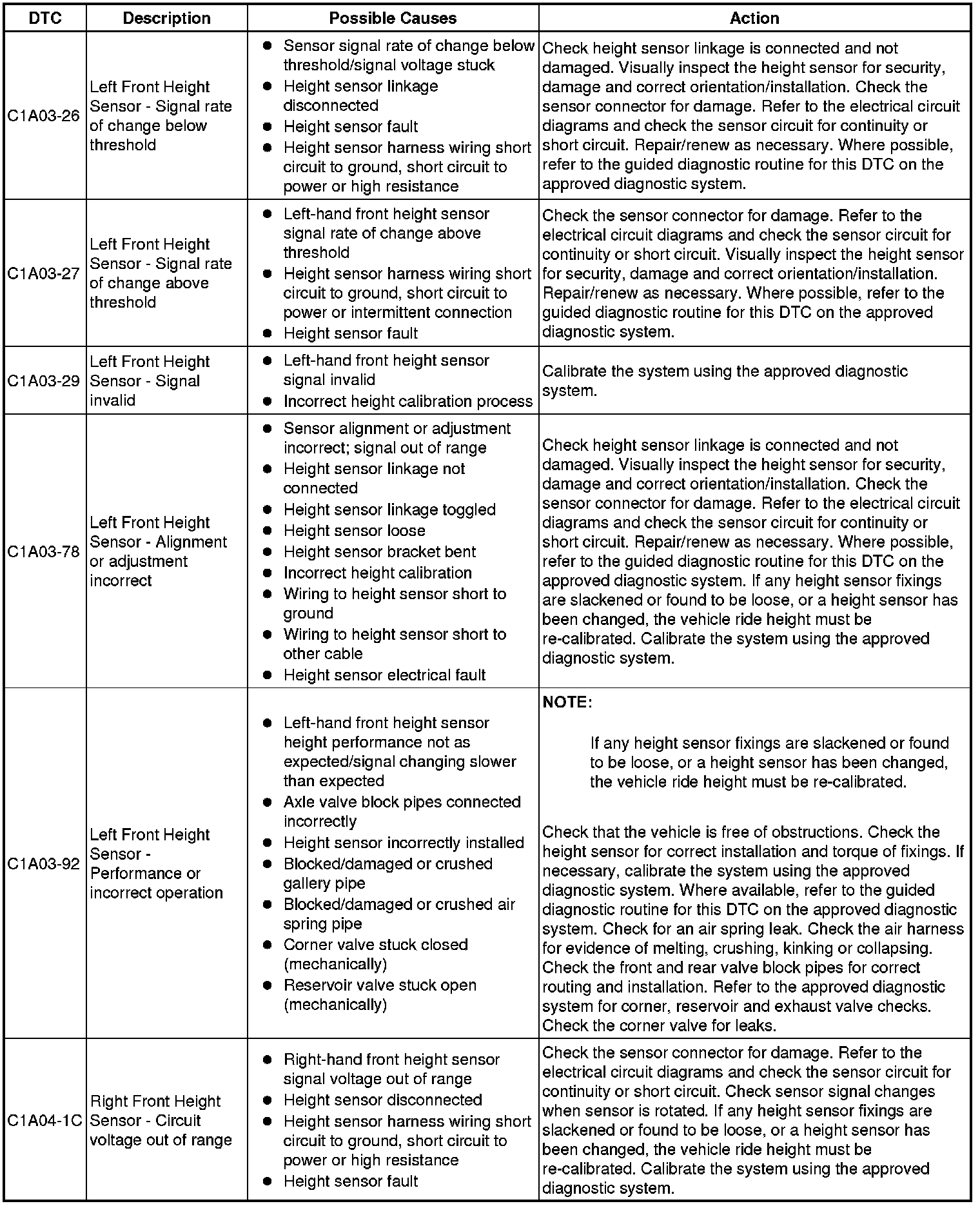 The table below lists all Diagnostic Trouble Codes (DTCs) that could be logged in the Air Suspension Control Module, for additional Diagnosis and Testing information refer to the relevant Diagnosis and Testing Section. For additional information, refer to Vehicle Dynamic Suspension