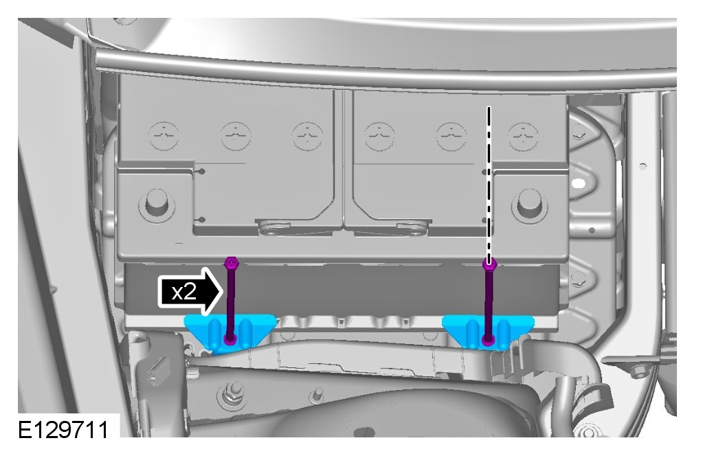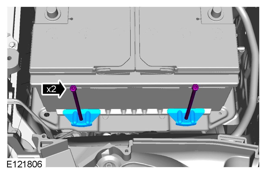 CAUTION: Make sure that the battery is positioned fully outboard on the battery tray and that no harnesses or hoses are trapped before securing the battery with the bolts.