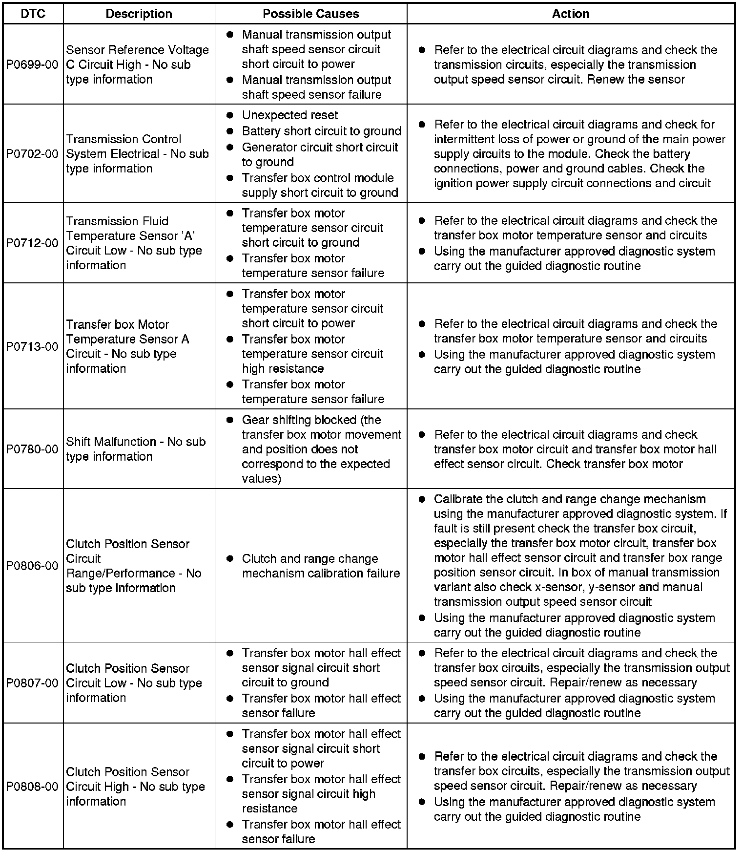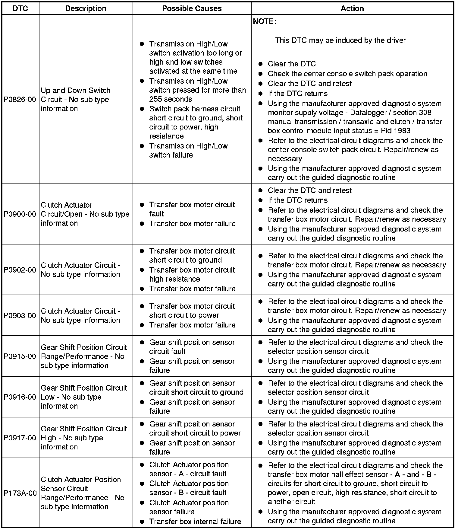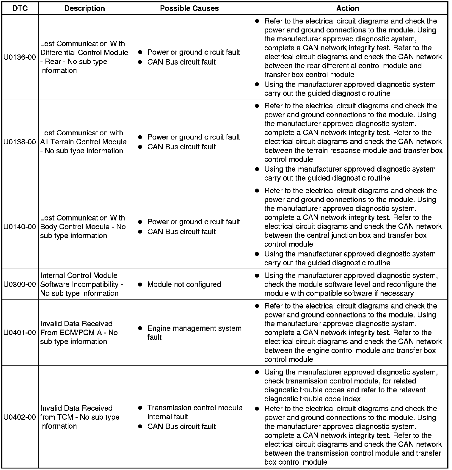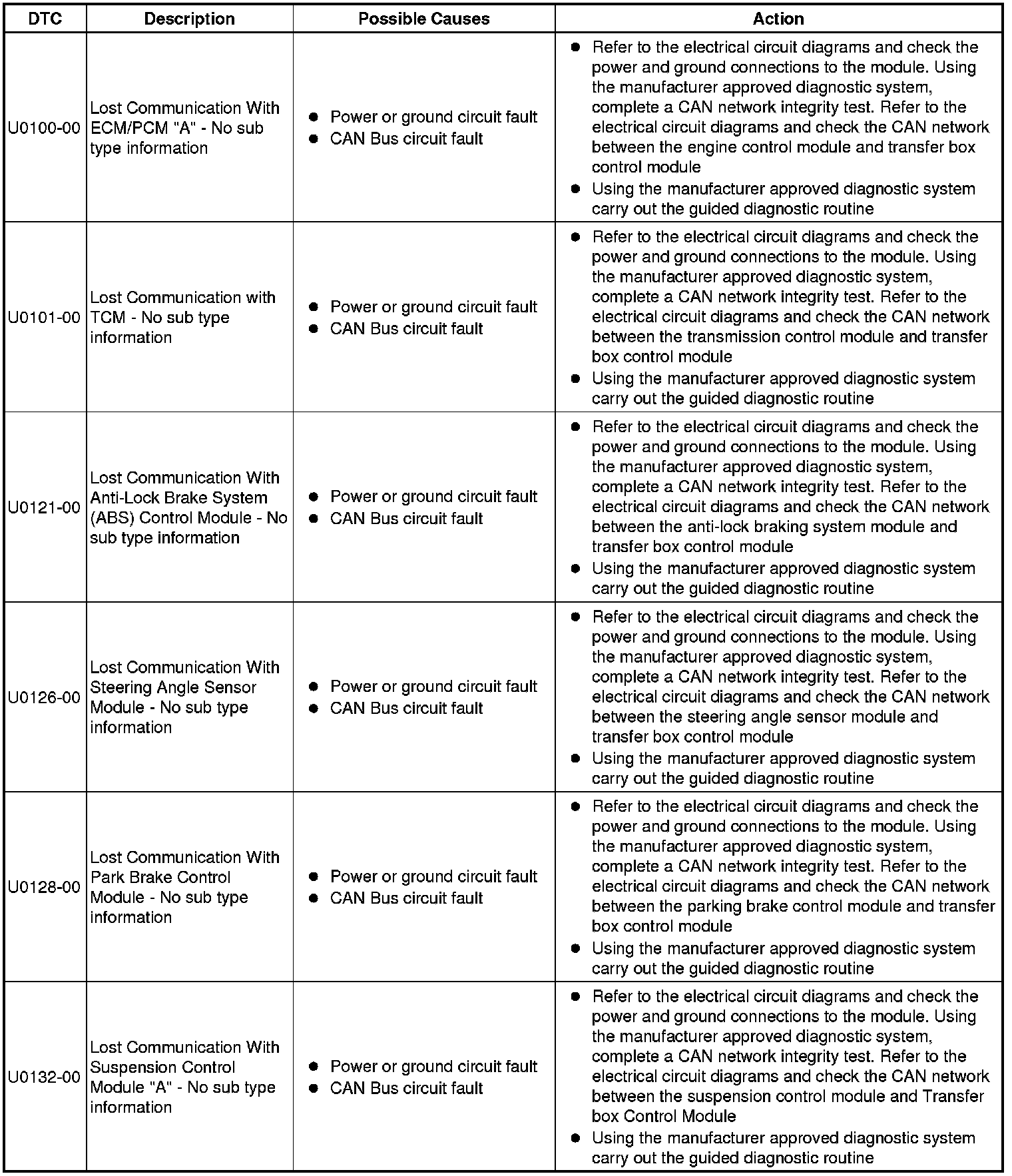 The table below lists all Diagnostic Trouble Codes (DTCs) that could be logged in the Transfer Case Control Module, for additional Diagnosis and Testing information refer to the relevant Diagnosis and Testing Section. For additional information, refer to Transfer Case