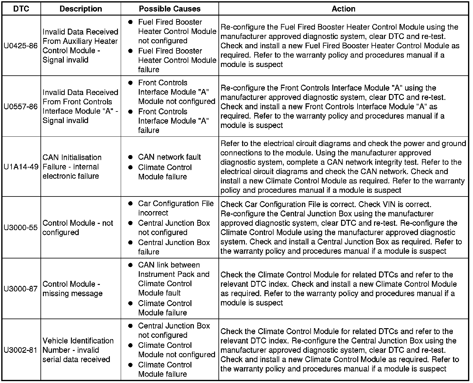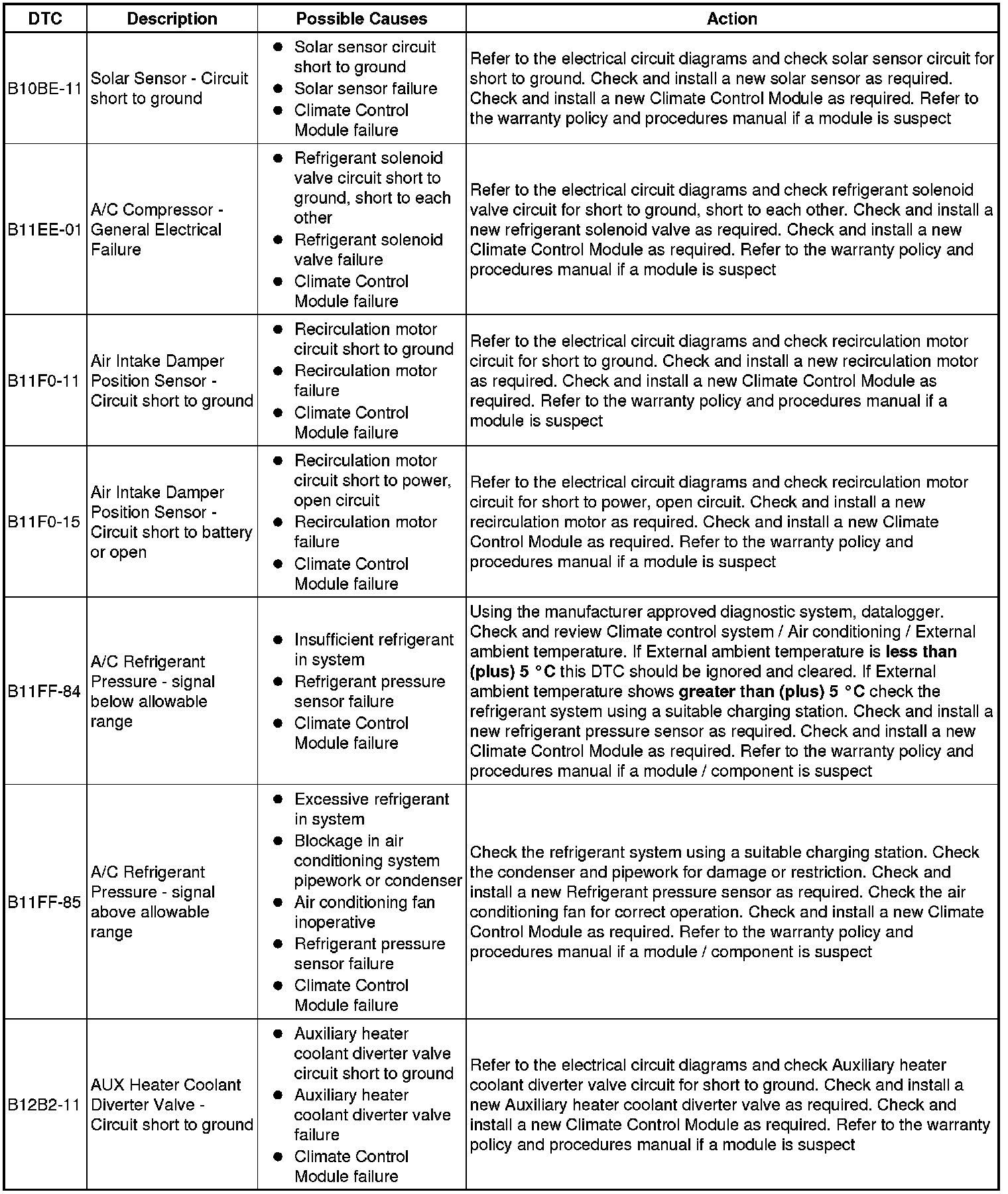 The table below lists all Diagnostic Trouble Codes (DTCs) that could be logged in the Climate Control Module, for additional Diagnosis and Testing information refer to the relevant Diagnosis and Testing Section. For additional information, refer to Climate Control System Climate Control System
