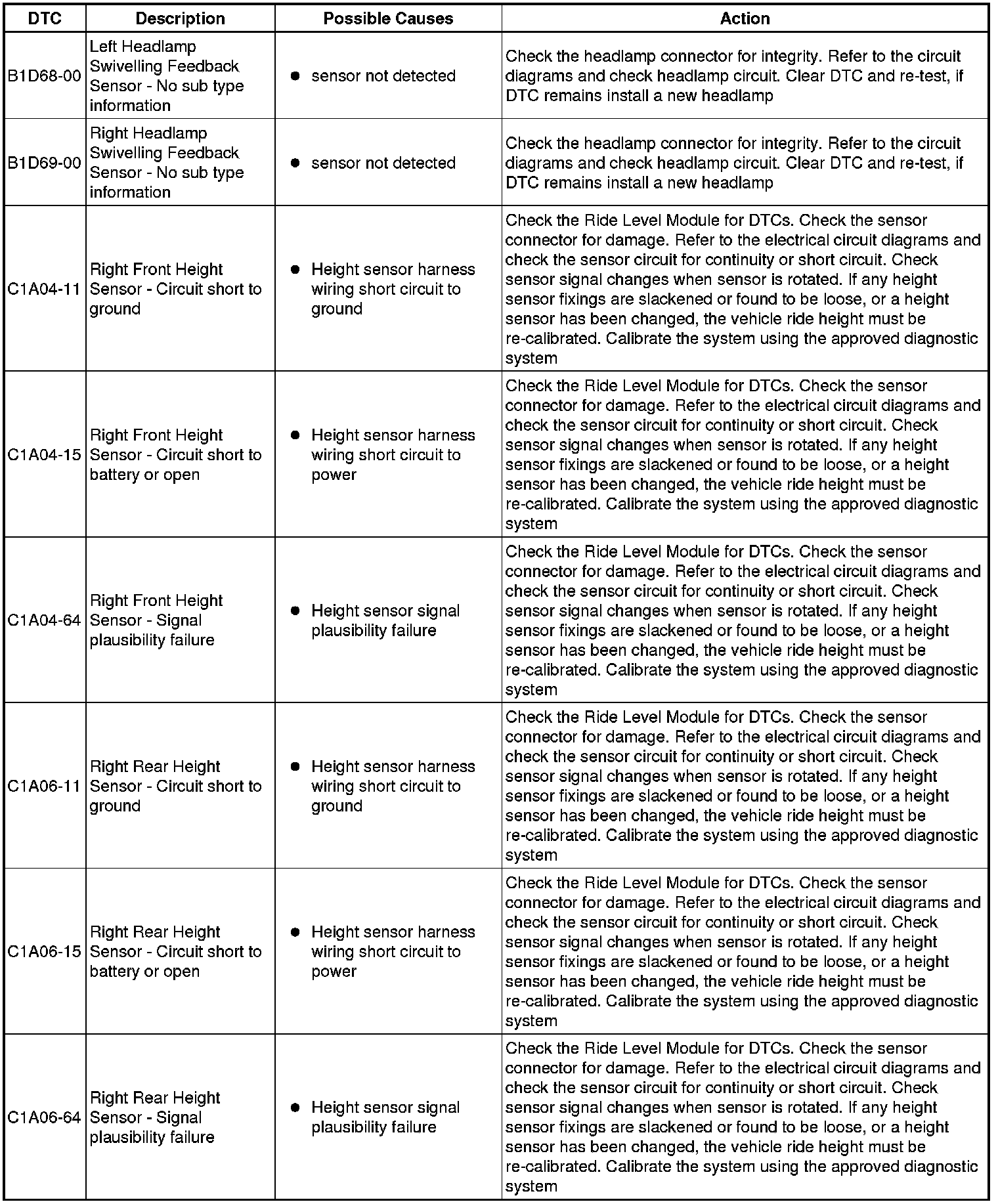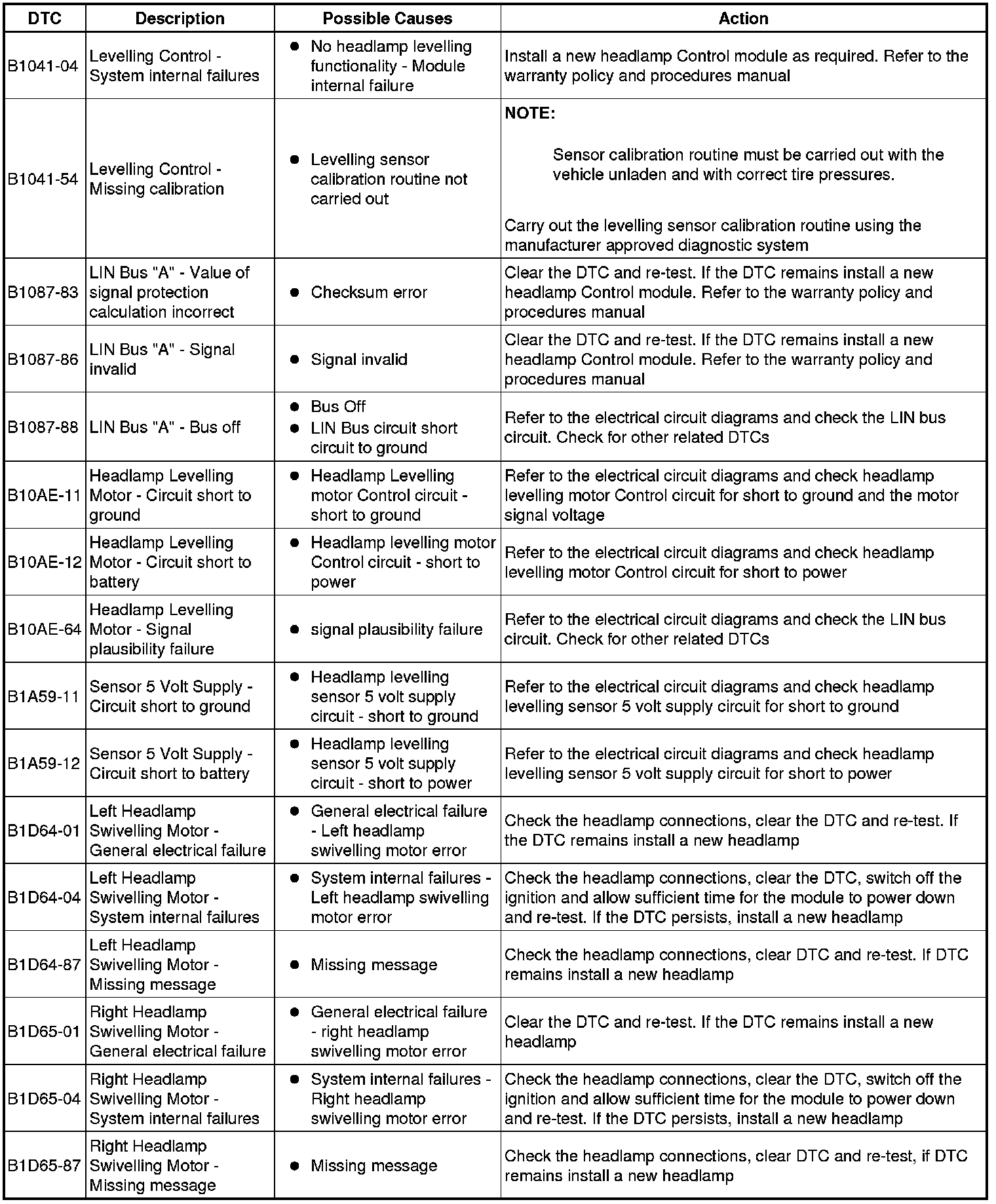 The table below lists all Diagnostic Trouble Codes (DTCs) that could be logged in the Headlamp Control Module, for additional Diagnosis and Testing information refer to the relevant Diagnosis and Testing Section. For additional information, refer to Headlamps Headlamps