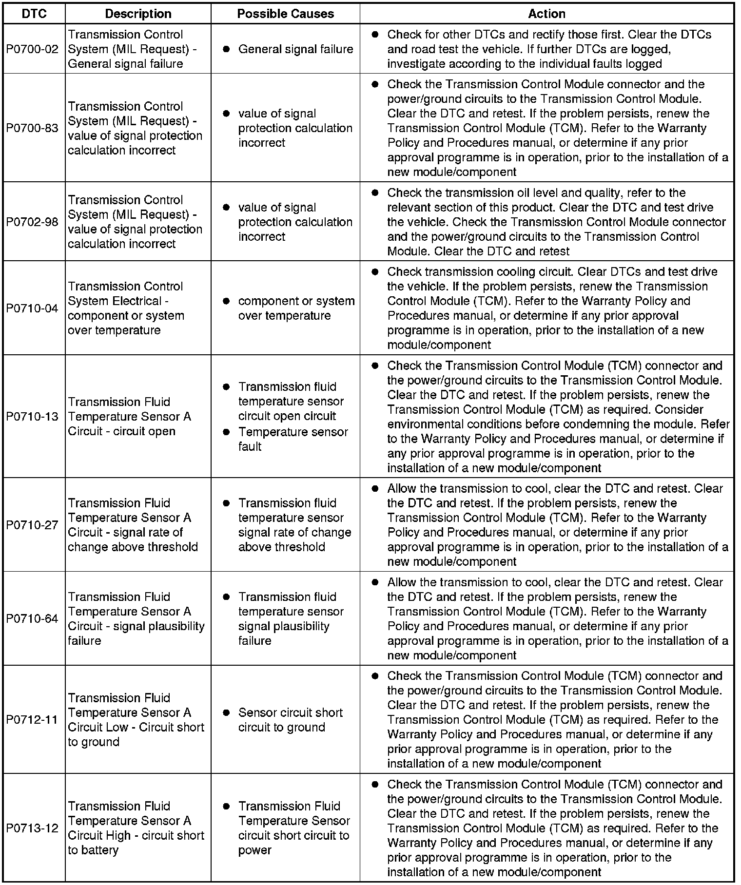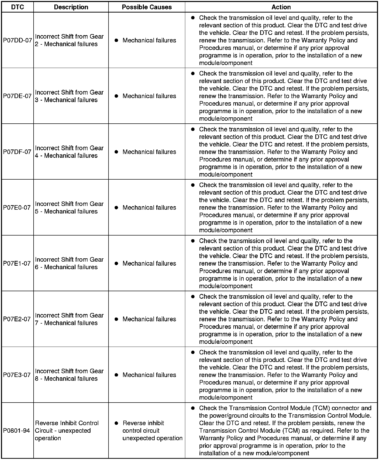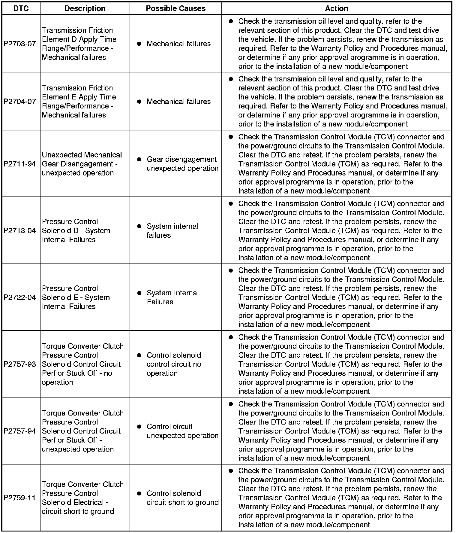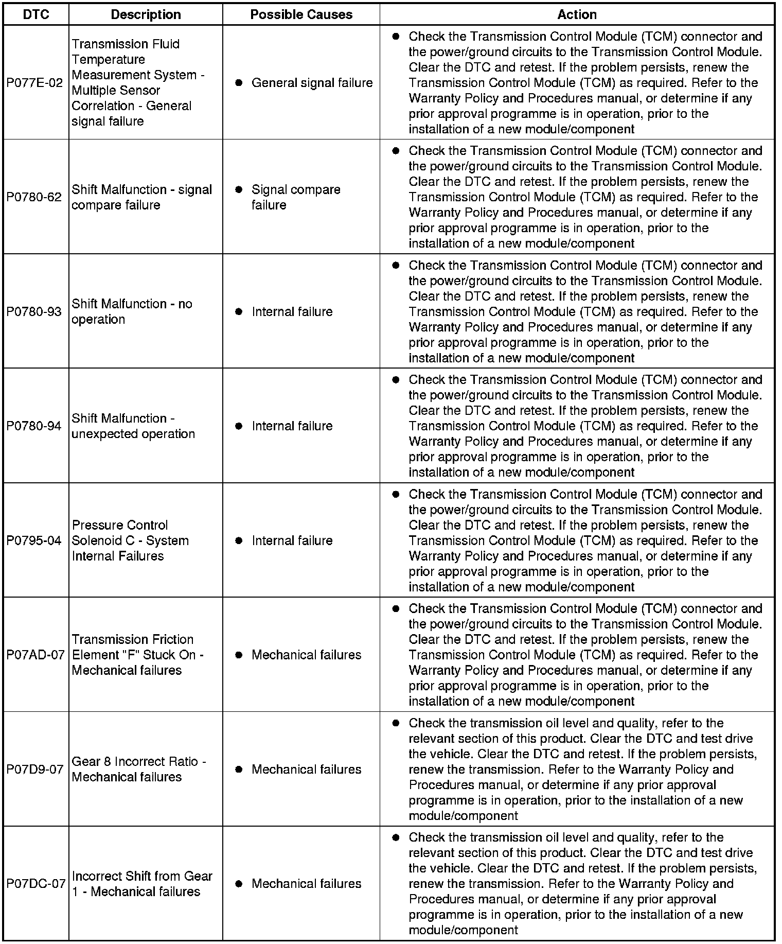 The table below lists all diagnostic trouble codes (DTCs) that could be logged in the transmission control module, for additional diagnosis and testing information refer to the relevant diagnosis and testing section For additional information, refer to Diagnostics - TDV6 3.0L Diesel, Vehicles With: 8HP70 8-Speed Automatic Transmission AWD