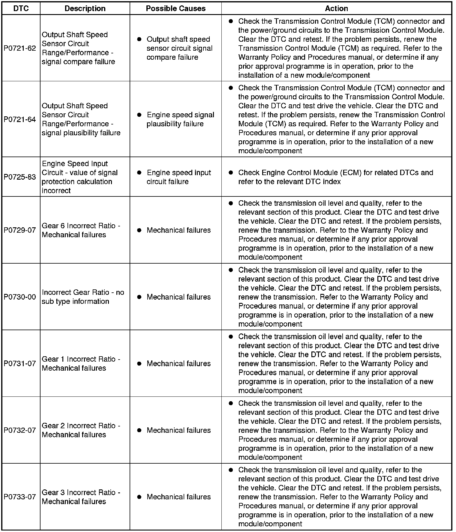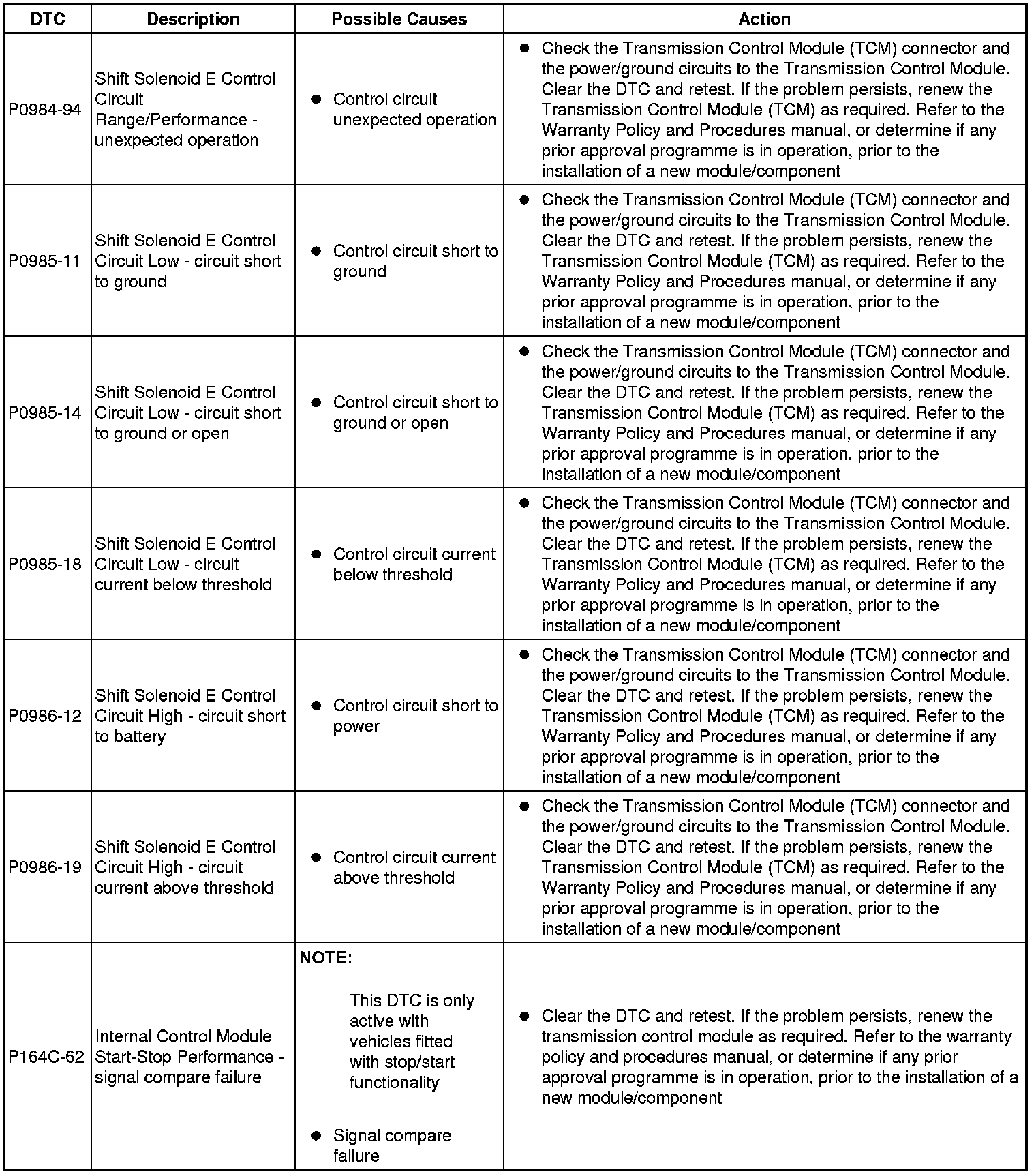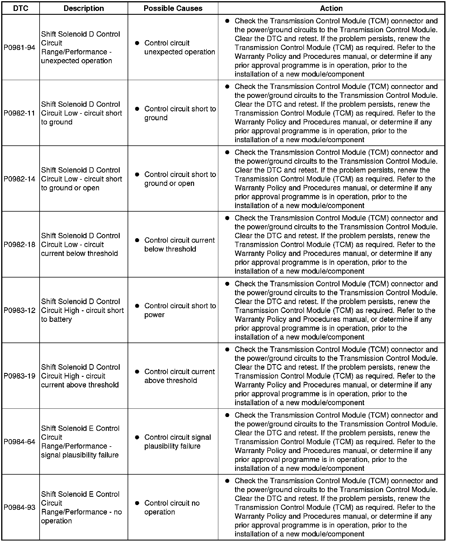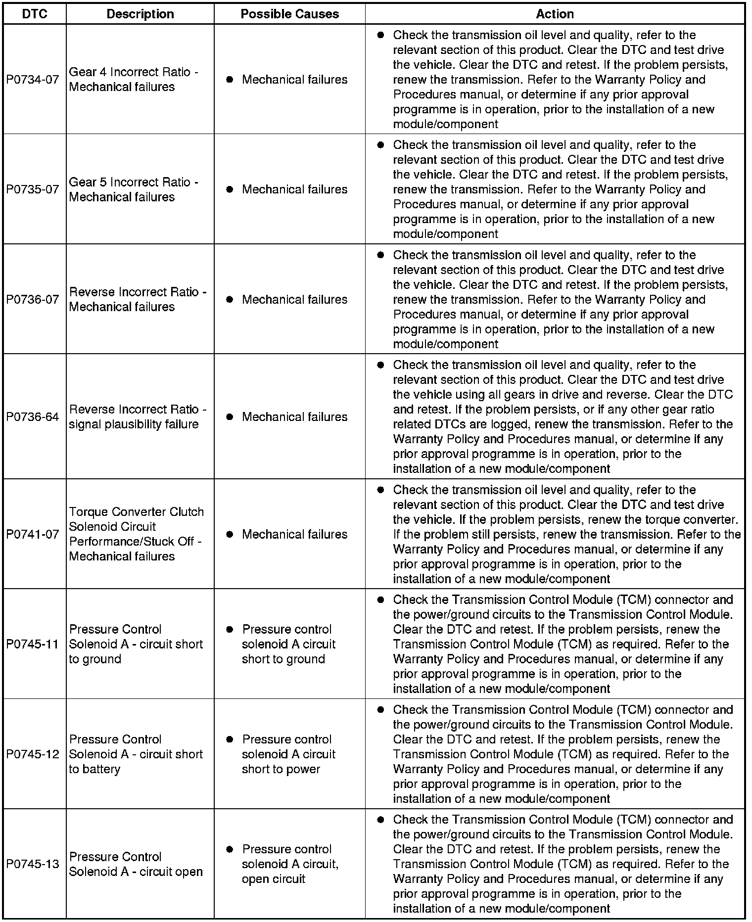The table below lists all diagnostic trouble codes (DTCs) that could be logged in the transmission control module, for additional diagnosis and testing information refer to the relevant diagnosis and testing section For additional information, refer to Diagnostics - TDV6 3.0L Diesel, Vehicles With: 8HP70 8-Speed Automatic Transmission AWD