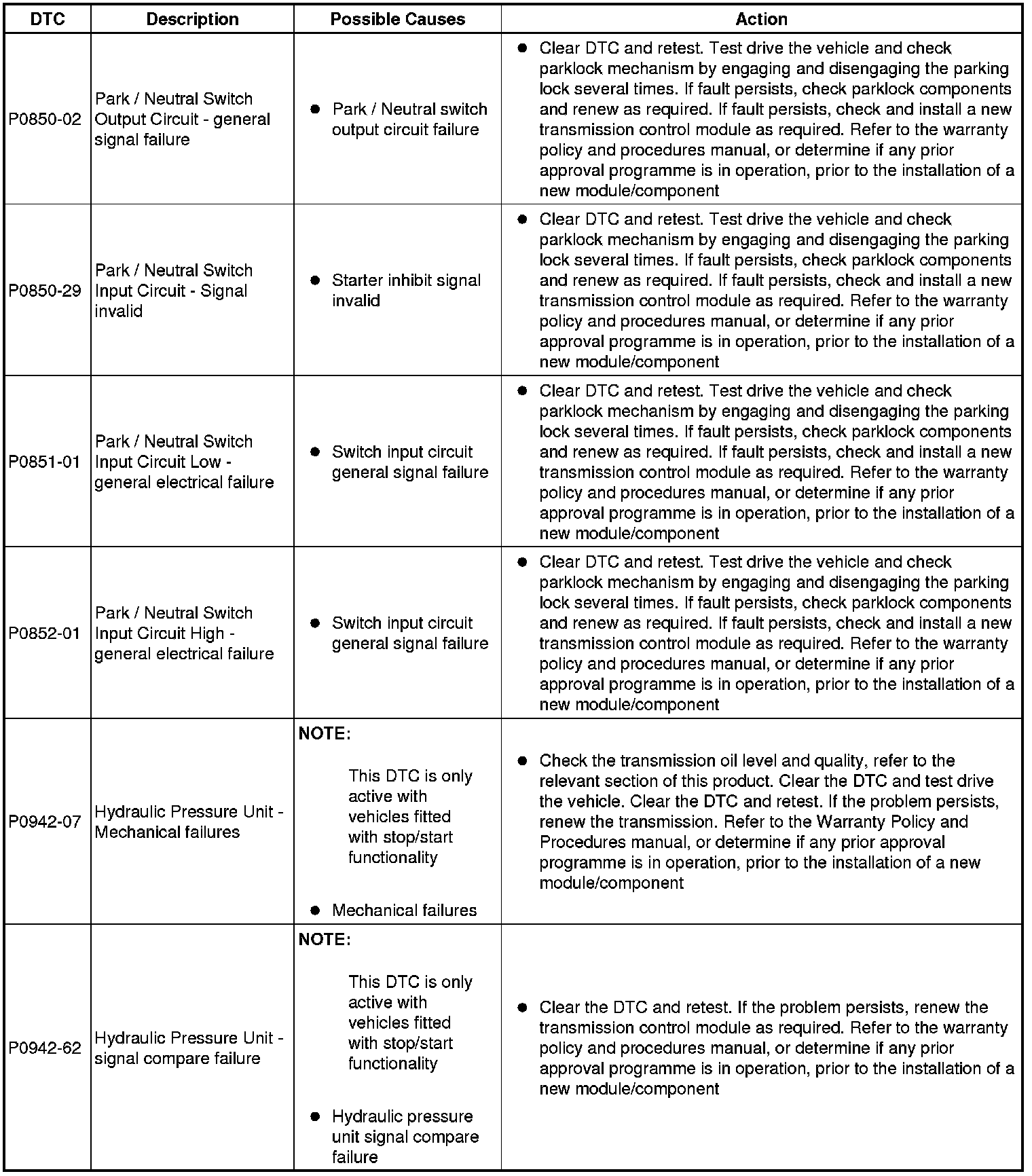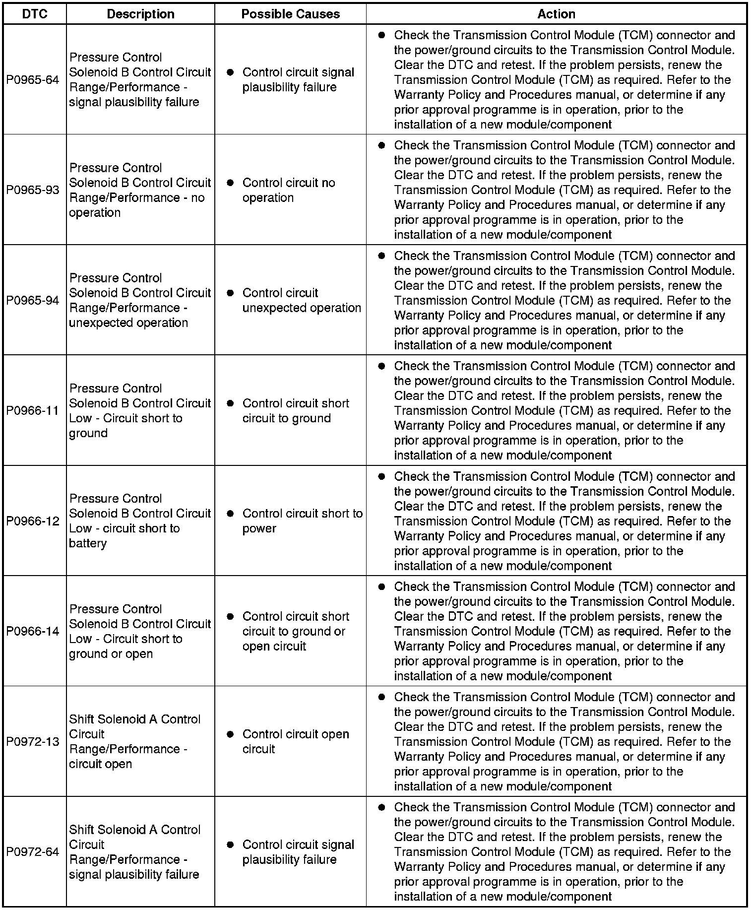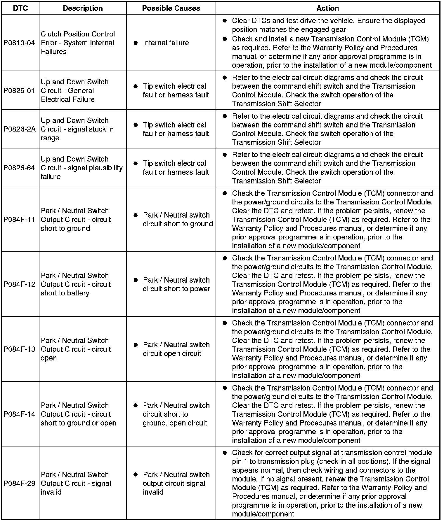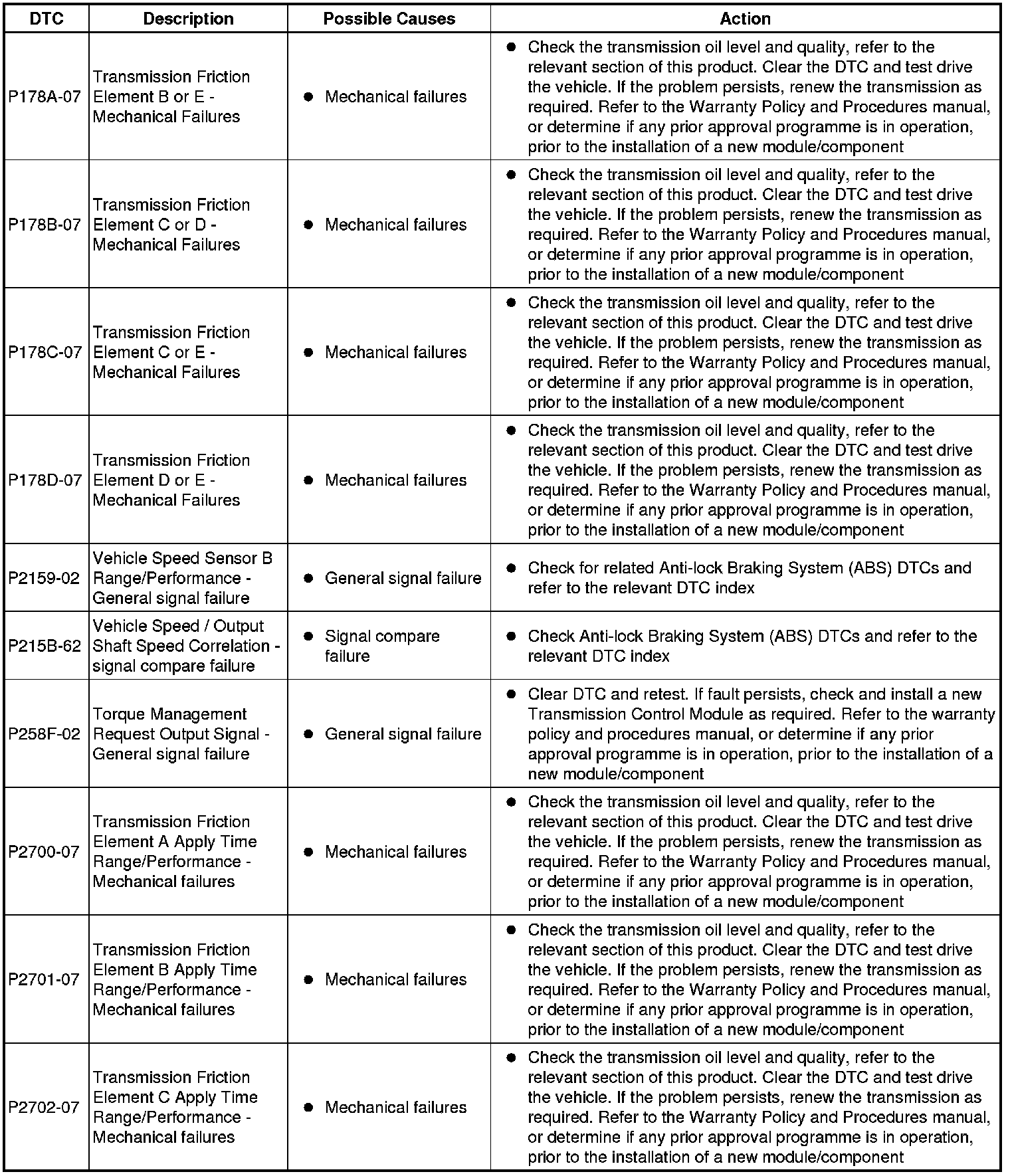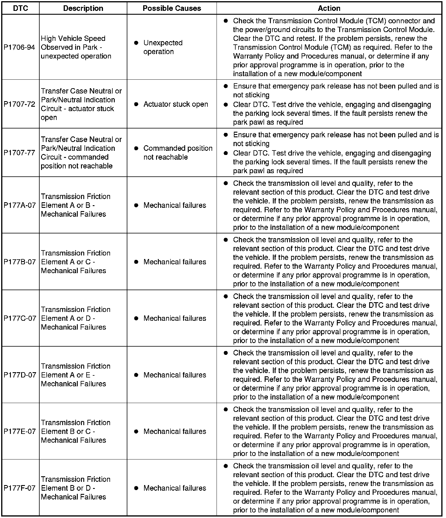 The table below lists all diagnostic trouble codes (DTCs) that could be logged in the transmission control module, for additional diagnosis and testing information refer to the relevant diagnosis and testing section For additional information, refer to Diagnostics - TDV6 3.0L Diesel, Vehicles With: 8HP70 8-Speed Automatic Transmission AWD