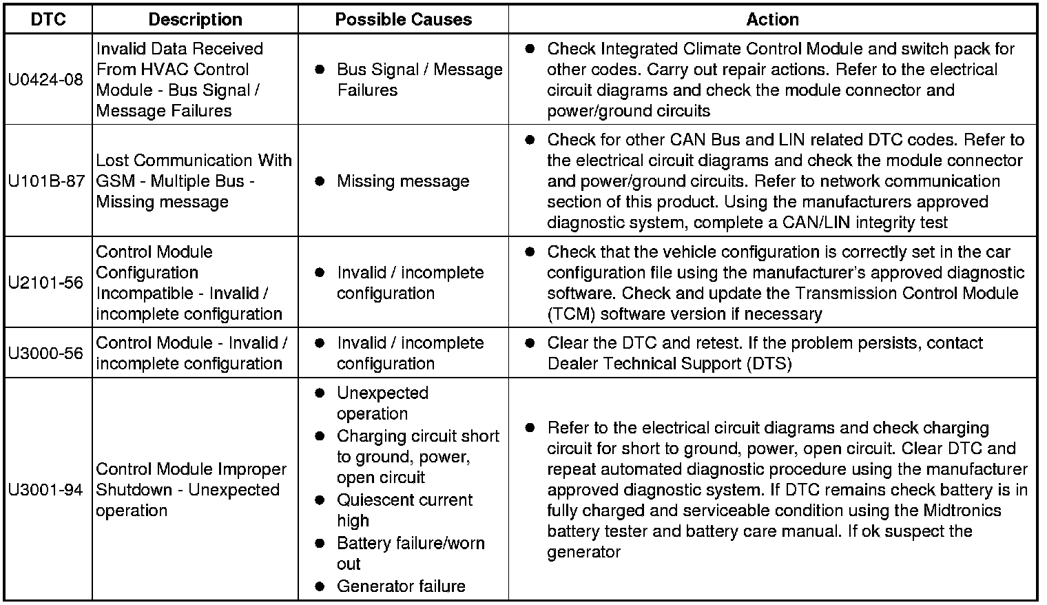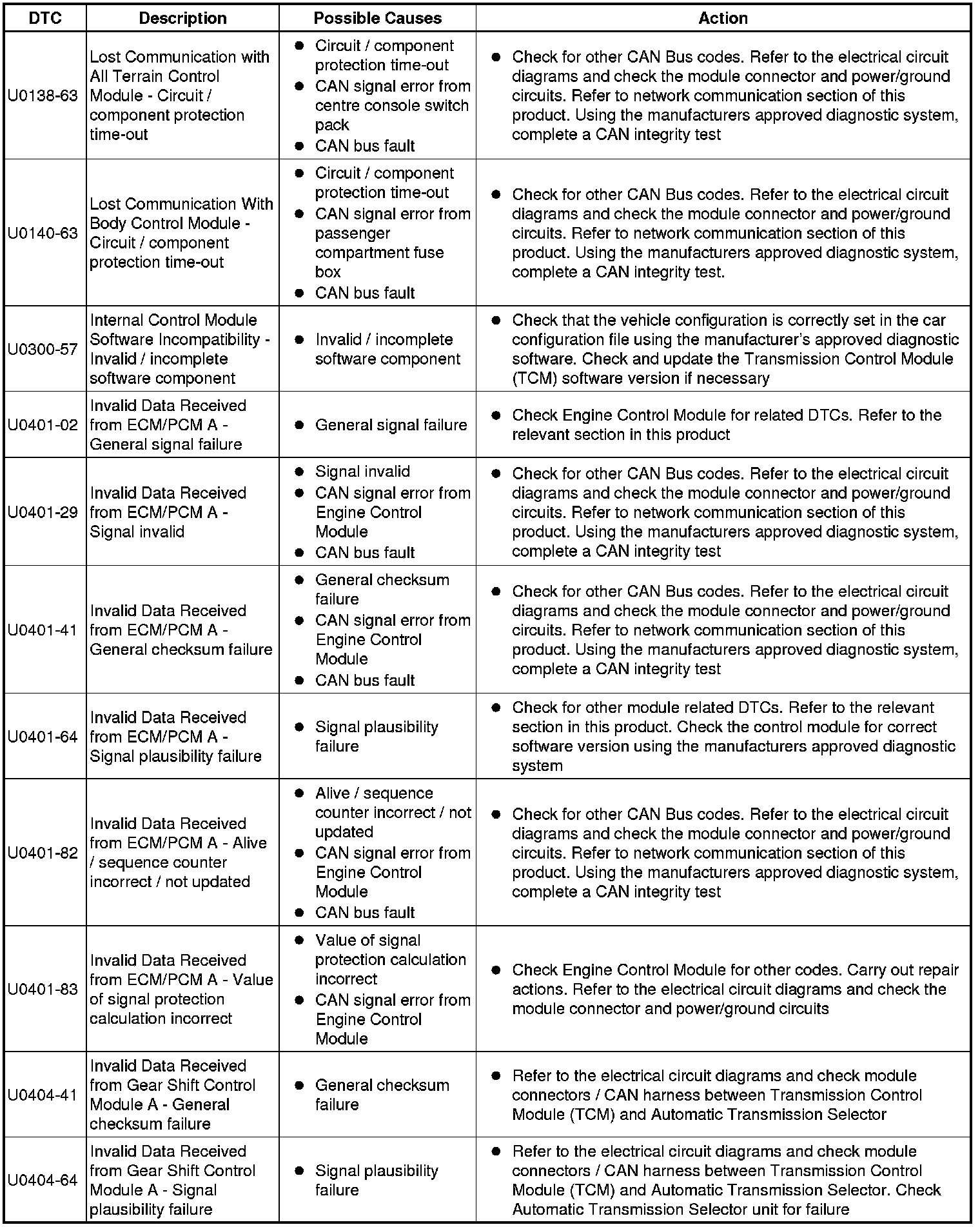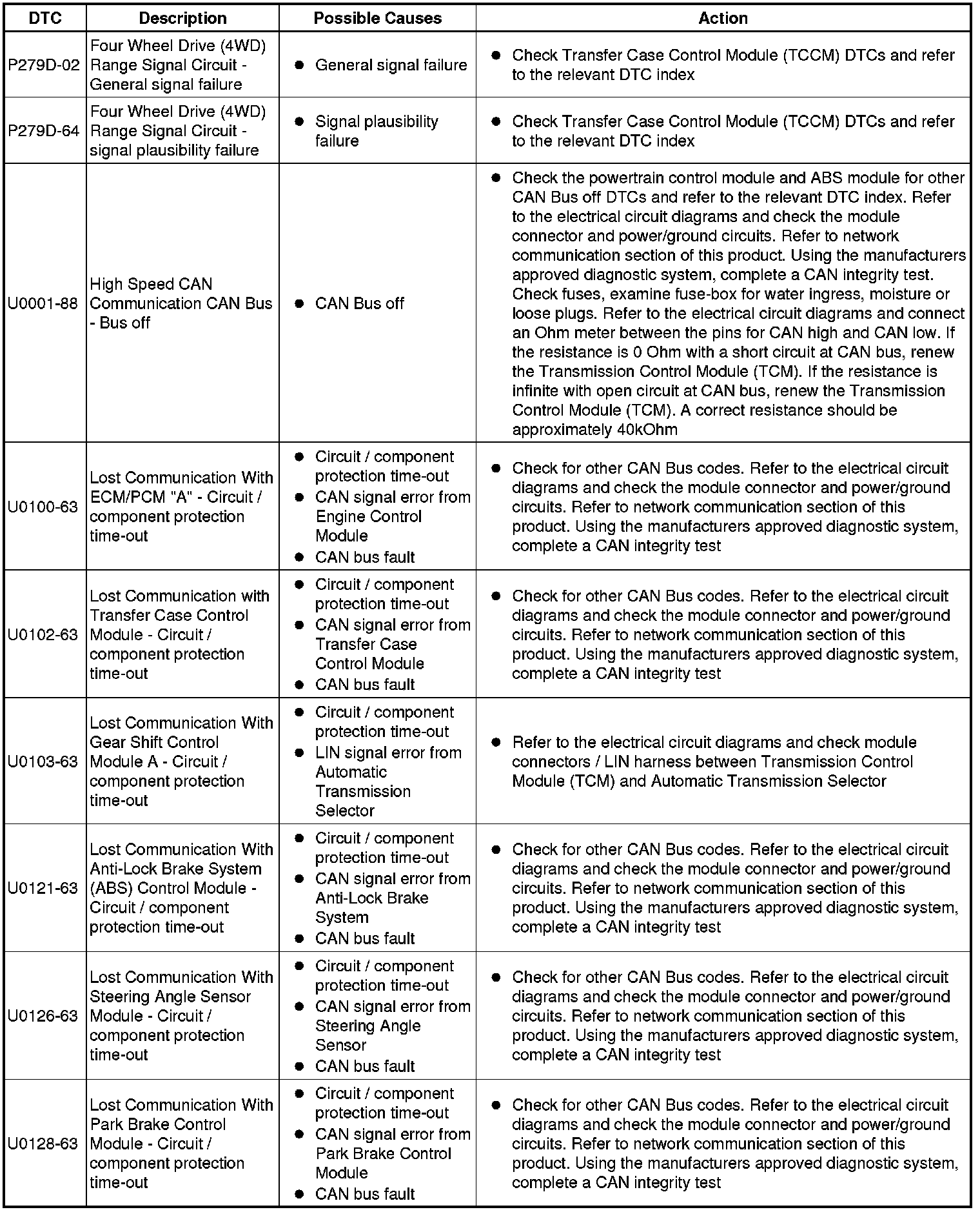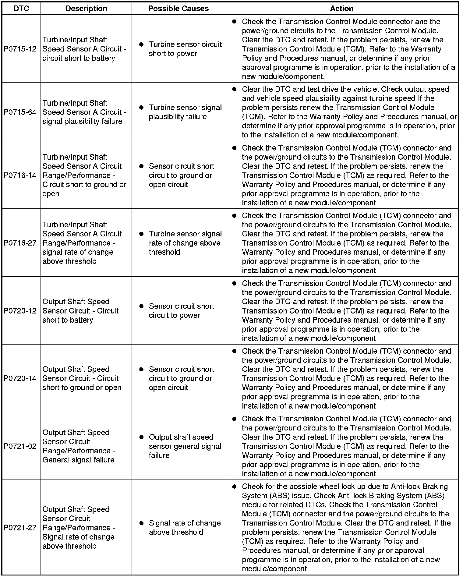 The table below lists all diagnostic trouble codes (DTCs) that could be logged in the transmission control module, for additional diagnosis and testing information refer to the relevant diagnosis and testing section For additional information, refer to Diagnostics - TDV6 3.0L Diesel, Vehicles With: 8HP70 8-Speed Automatic Transmission AWD