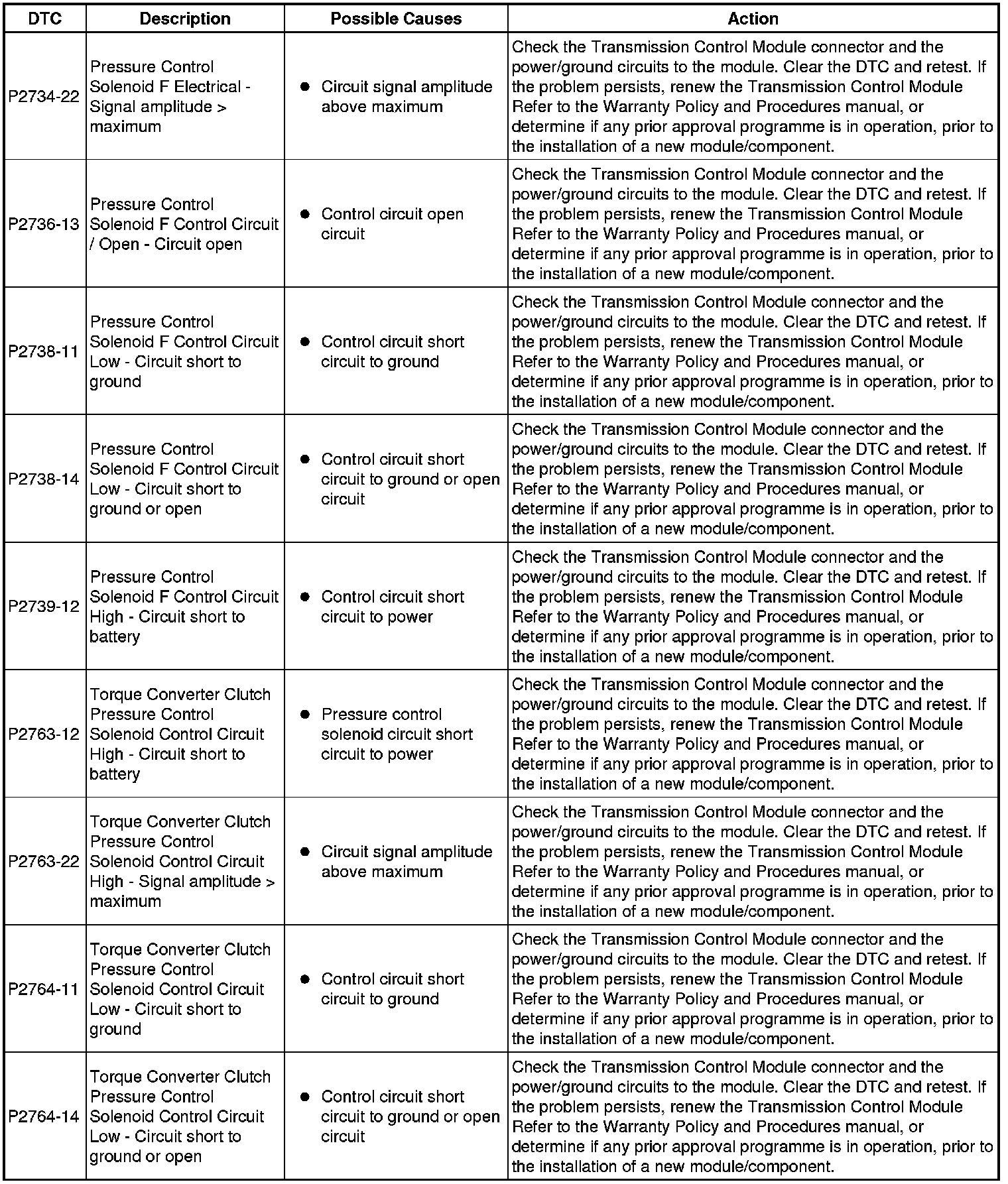 The table below lists all Diagnostic Trouble Codes (DTCs) that could be logged in the Transmission Control Module, for additional Diagnosis and Testing information refer to the relevant Diagnosis and Testing Section. For additional information, refer to Diagnostics Testing and Inspection