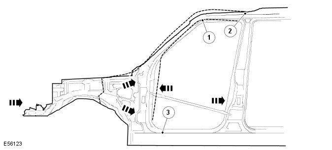 A body is always straightened in the opposite direction to that of the impact. Always carry out straightening repairs with the complete body shell assembled (do not cut out any parts beforehand). Carry out the straightening work in several stages. This prevents the risk of over stretching or of welded joints tearing out. During the individual straightening steps, relieve tension by striking with an aluminium hammer while the part is subjected to a tensile load (in the area of pre-determined folding points, dents, welded joins etc.).