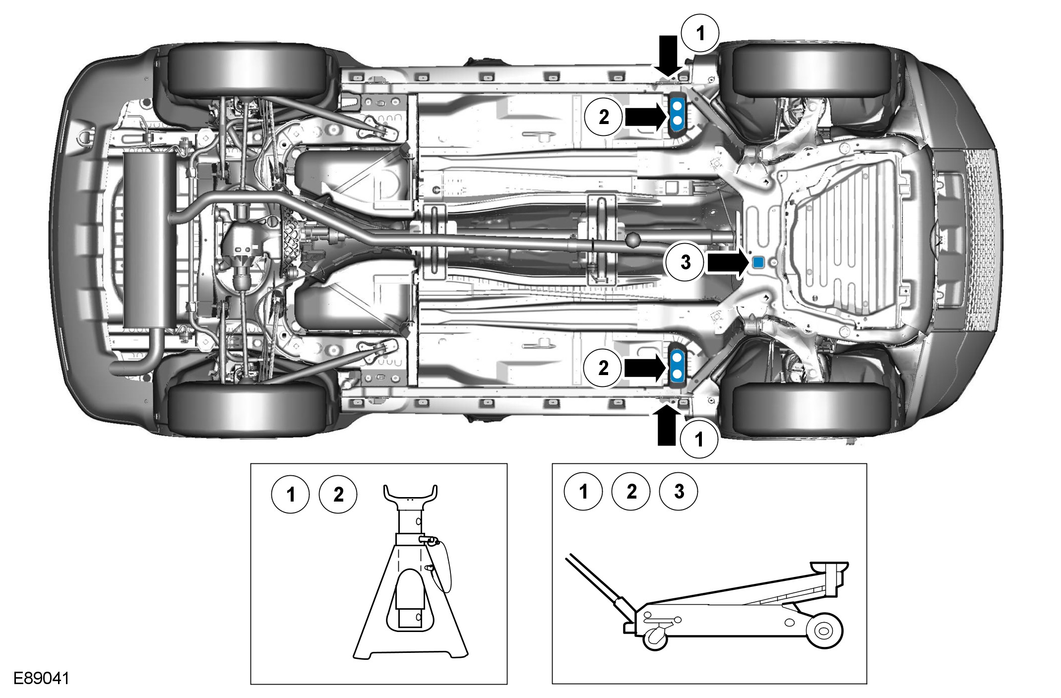 A hydraulic jack with a minimum lifting capacity of 1500 kg, (3,300 lbs) must be used.