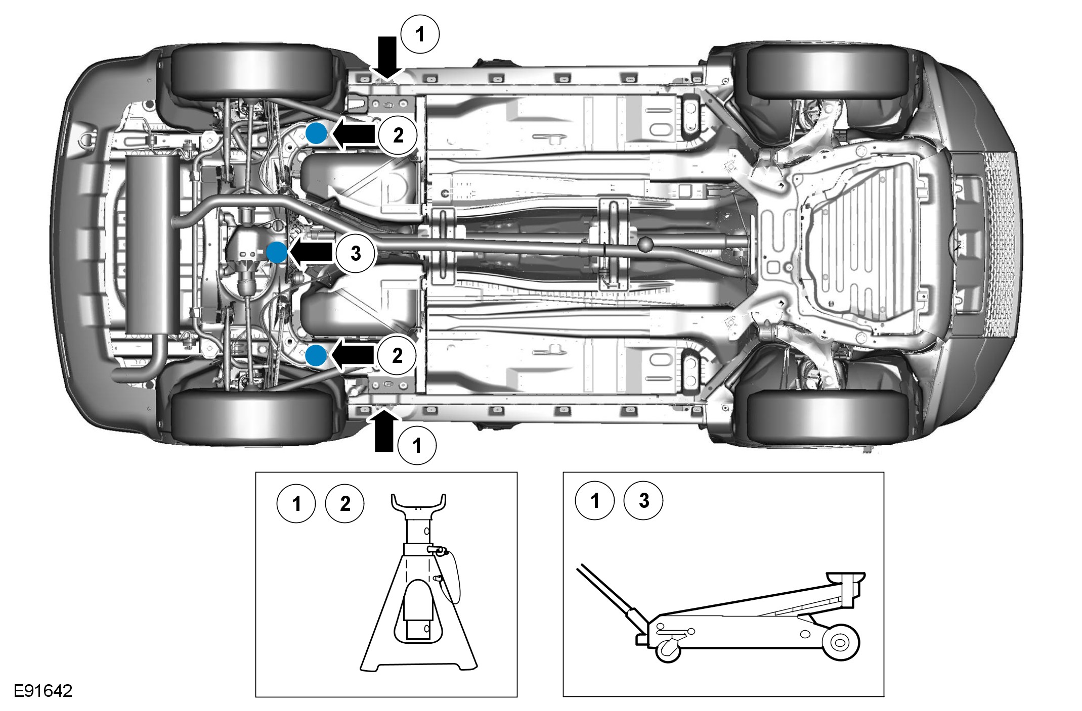 With vehicle at desired height, position axle stand(s) as illustration and carefully lower jack until vehicle rests on axle stand(s), position 1 or 2.