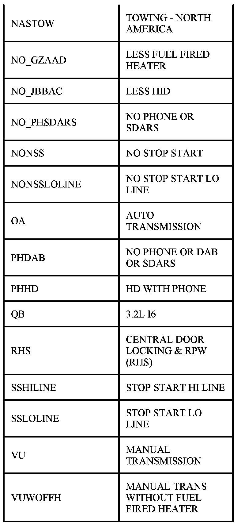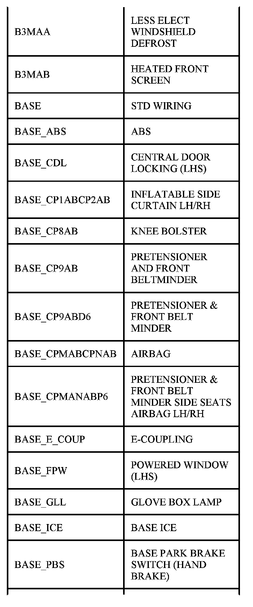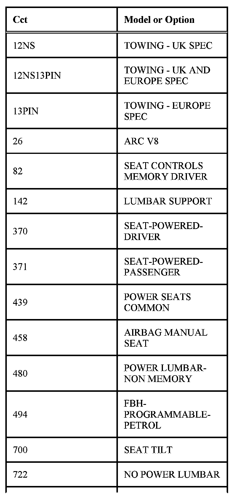 The following table contains a list of circuit (Cct) reference numbers against a description of the applicable model or option. This information should be used in conjunction with the connector pin-out tables to determine the wire configuration of the vehicle under test.