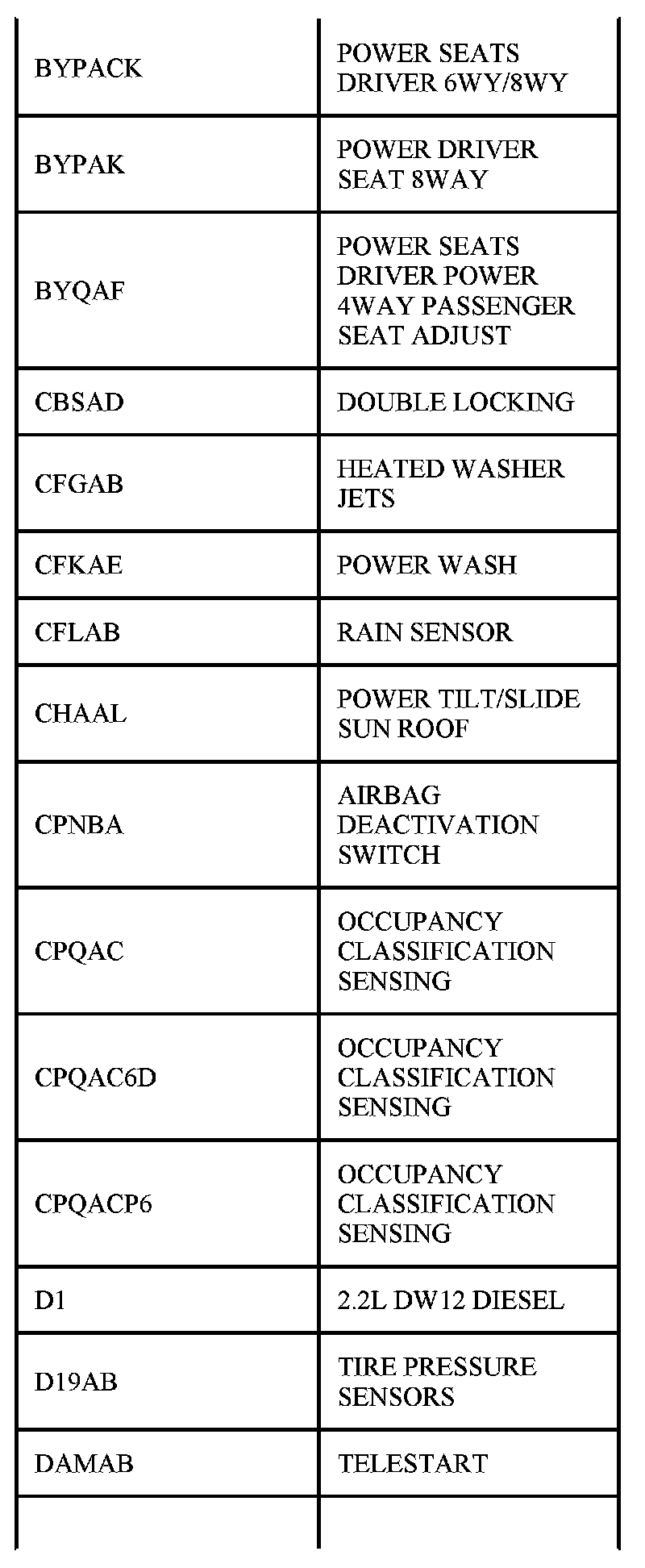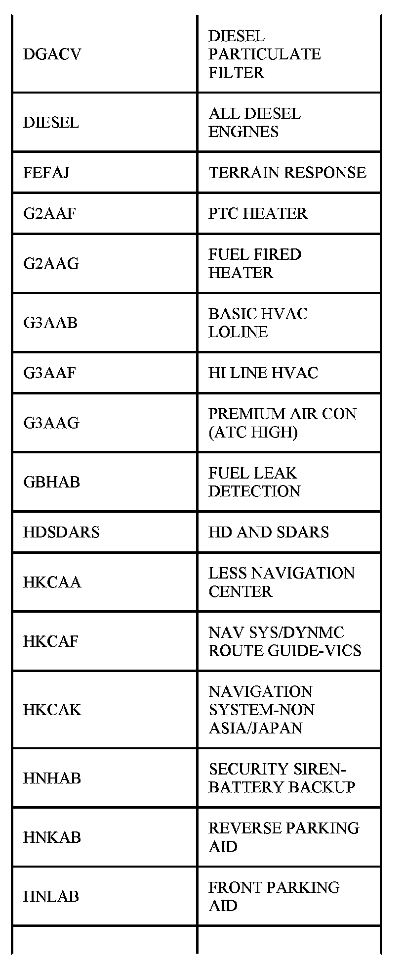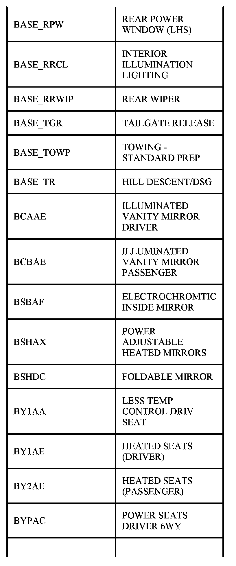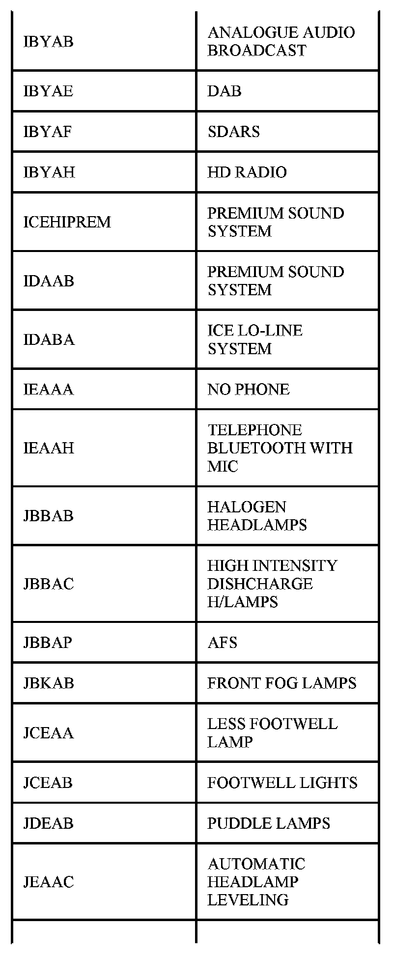Table Of Circuit Option Codes