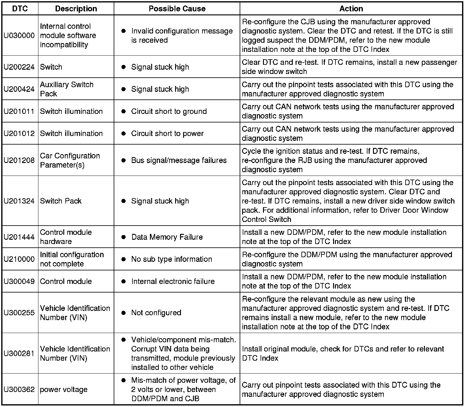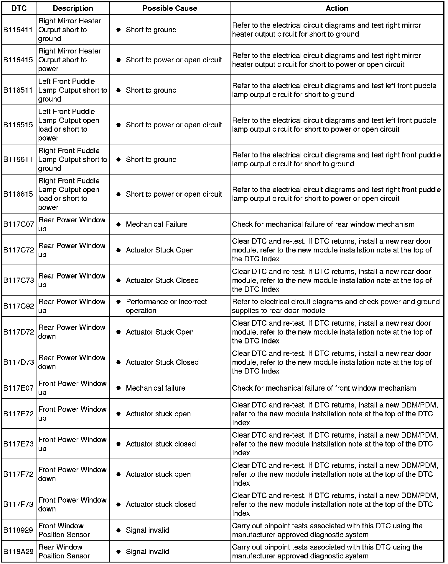 The DTC Index in this section shows information for DTCs that could be logged in the Driver Door Module (DDM) or Passenger Door Module (PDM). For diagnosis and testing information for: Driver Seat module. For additional information, refer to Seats Testing and Inspection Information and Entertainment module. For additional information, refer to Information and Entertainment System