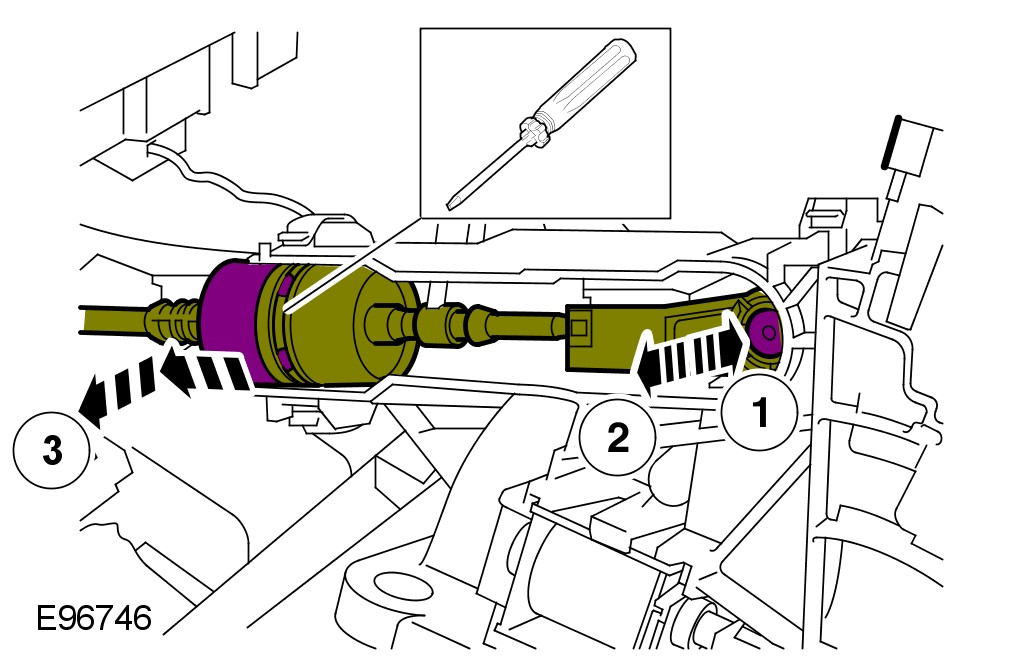 Depress and hold the selector cable ball joint release button, using a lever carefully disconnect the cable.
