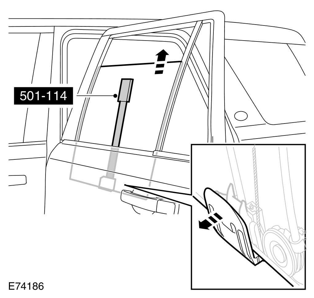 Release the door window glass from the window lift mechanism. Raise the glass and secure it to the top of the door frame.