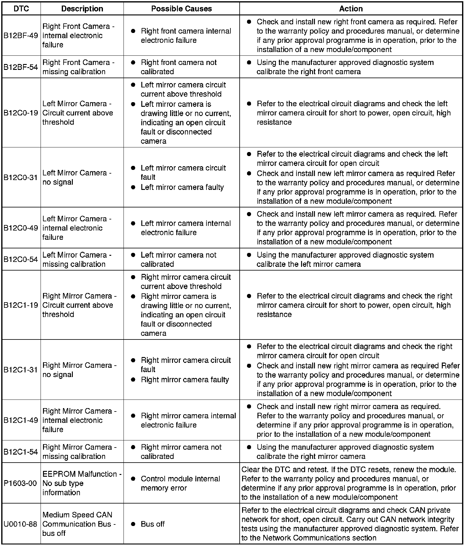 The table below lists all Diagnostic Trouble Codes (DTCs) that could be logged in the Image Processing Module, for additional Diagnosis and Testing information refer to the relevant Diagnosis and Testing Section. For additional information, refer to Video System Testing and Inspection