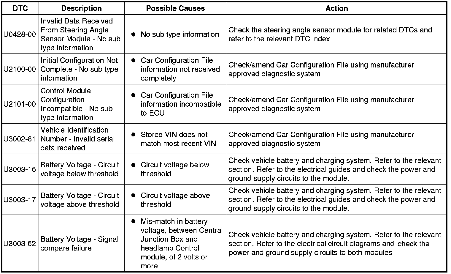 The table below lists all Diagnostic Trouble Codes (DTCs) that could be logged in the Headlamp Control Module, for additional Diagnosis and Testing information refer to the relevant Diagnosis and Testing Section. For additional information, refer to Headlamps Testing and Inspection