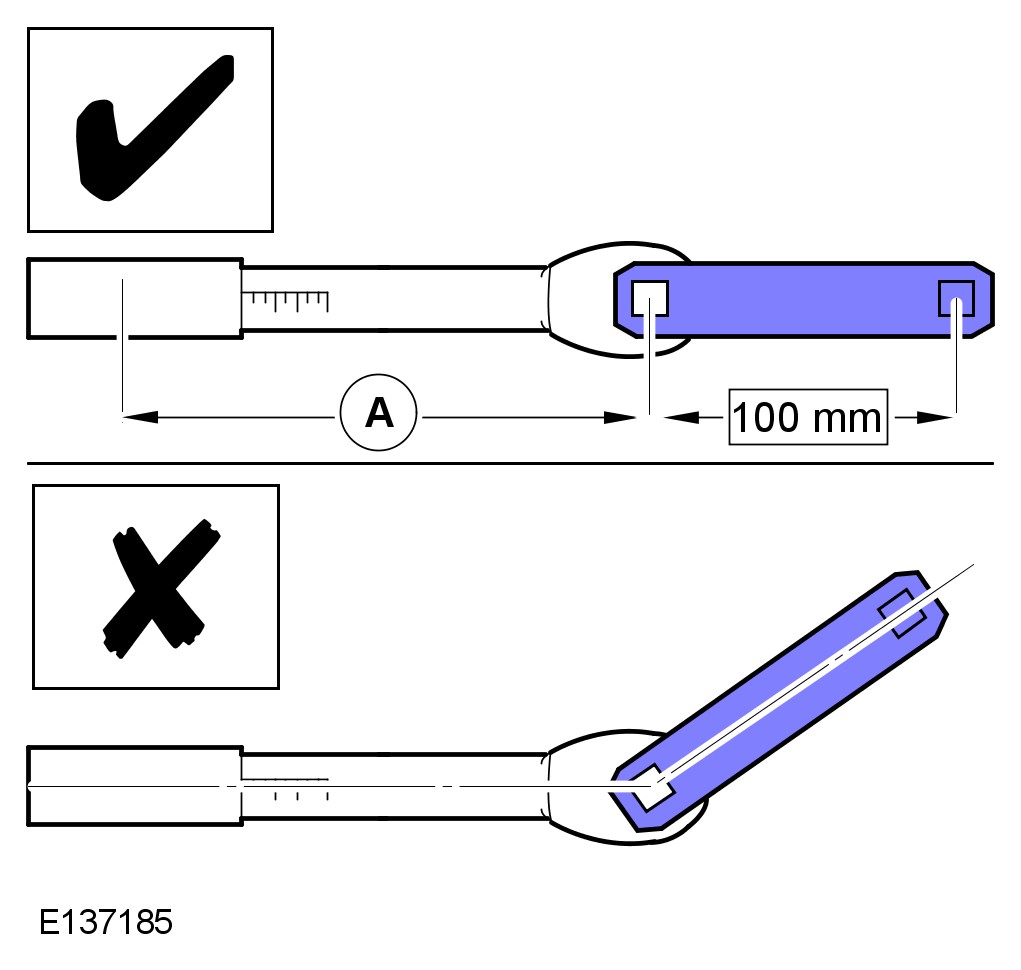 The torque wrench must be installed in a direct line with the special tool, as shown.