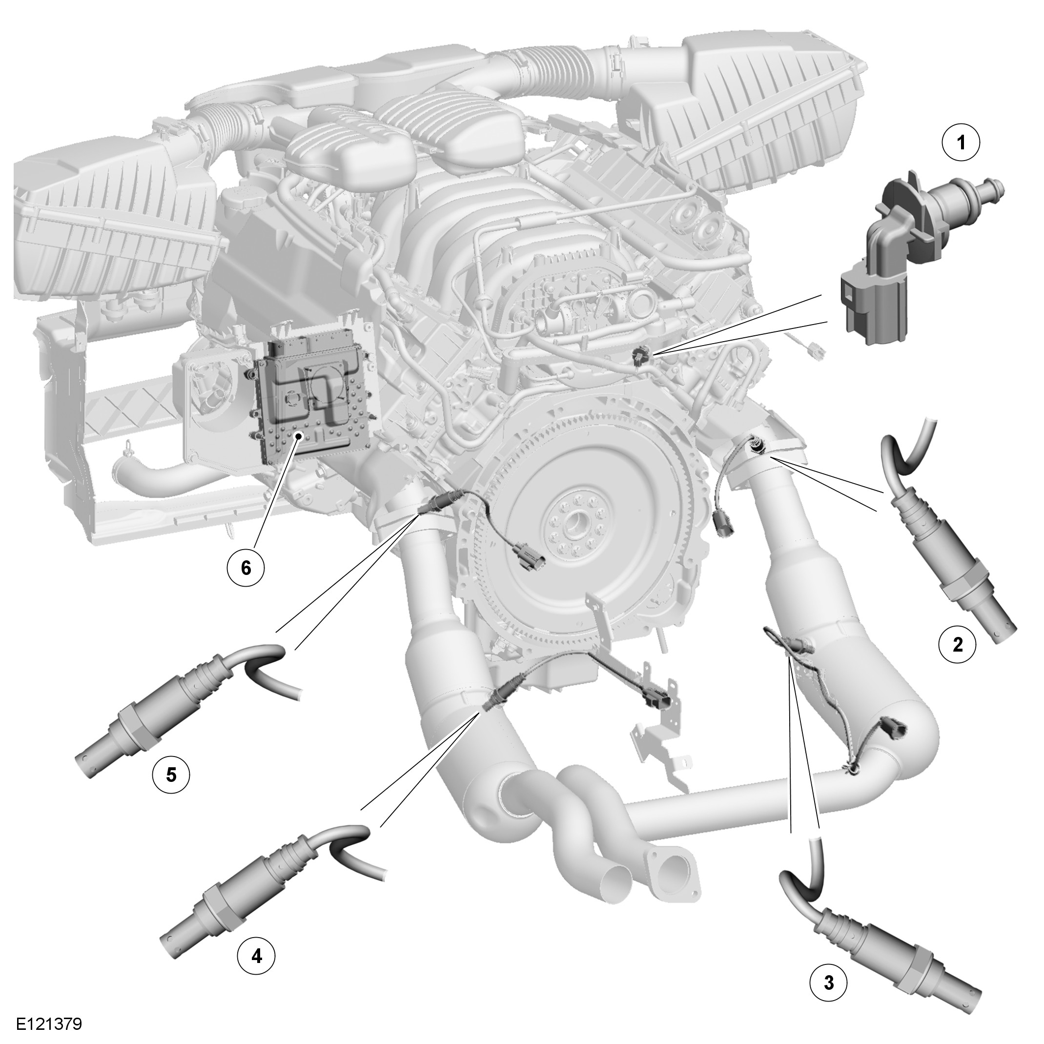 An upstream heated oxygen sensor is installed in the outlet of each exhaust manifold, which enables independent control of the fuel:air mixture for each cylinder bank. A downstream heated oxygen sensor is installed in each catalytic converter, which enables the performance of the catalytic converters to be optimized and monitored.