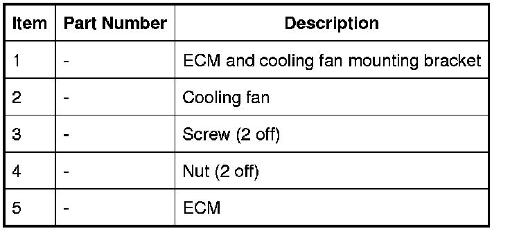 The ECM (engine control module) is installed in the passenger side protective box in the engine compartment, on a bracket attached to the engine bulkhead. The bracket also contains an electric cooling fan. The ECM (engine control module), which has an internal temperature sensor, controls the operation of the cooling fan. While the ignition is on, the cooling fan receives a power supply from the ECM (engine control module) relay in the EJB (engine junction box). When cooling is required, the ECM (engine control module) connects the cooling fan to ground.