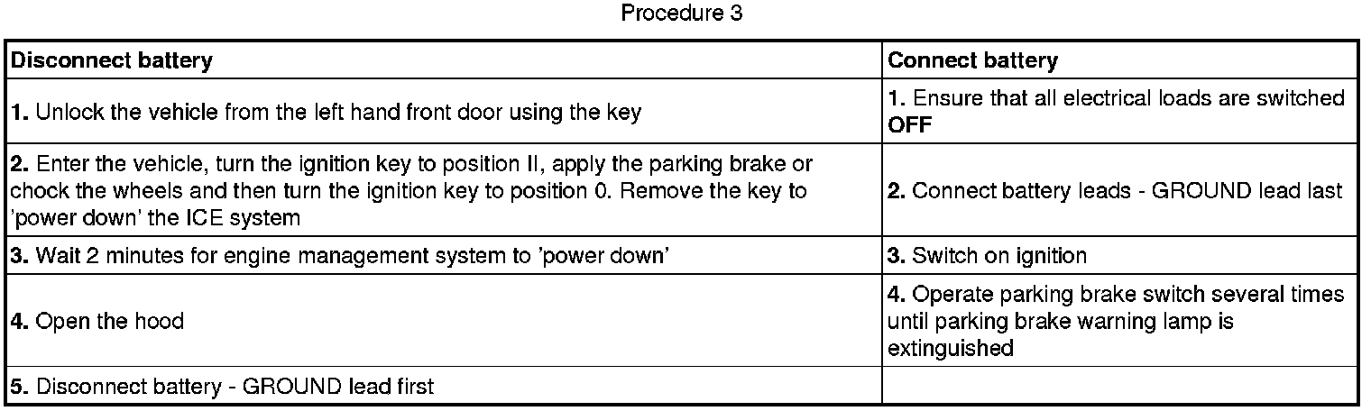 CAUTION: The vehicle status and battery condition must be established before attempting battery disconnect/connect. Reference must be then made to the following table to establish the relevant procedure to be followed.