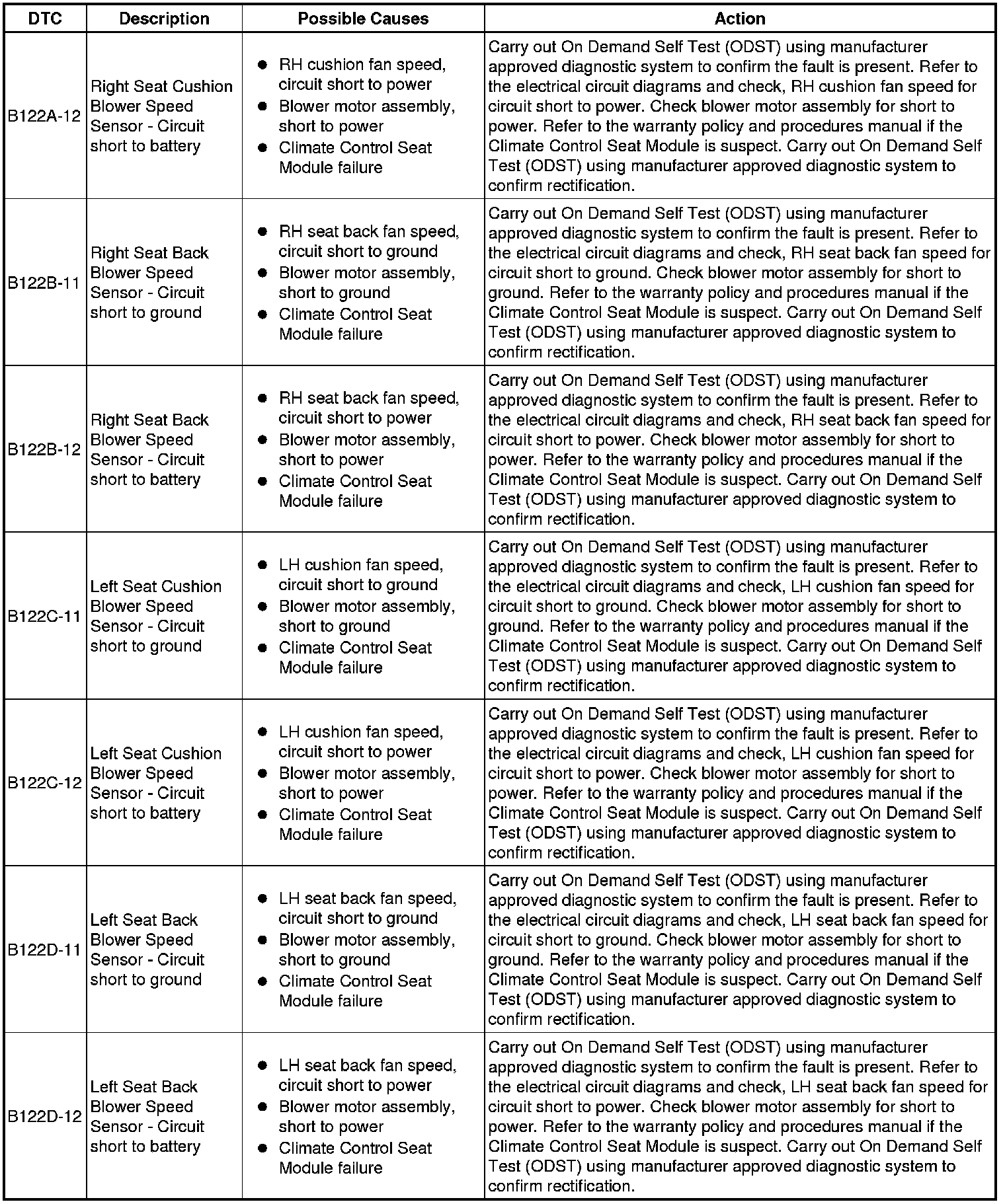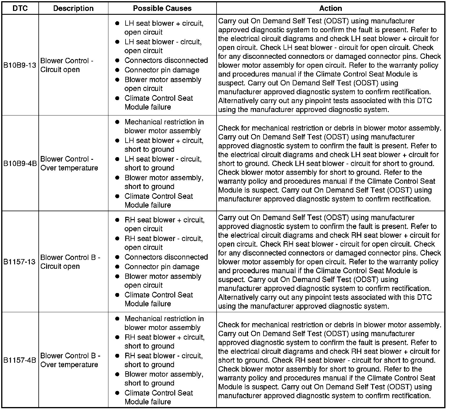 The table below lists all Diagnostic Trouble Codes (DTCs) that could be logged in the Climate Controlled Seat Module - Front/Rear (SCME/SCMF), for additional Diagnosis and Testing information refer to the relevant Diagnosis and Testing Section. For additional information, refer to Seats Testing and Inspection