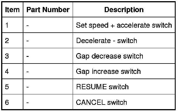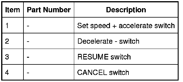 - Press and hold the set speed accelerate + switch which will cause the vehicle to accelerate. When the switch is released the attained speed will be set as the cruise speed.