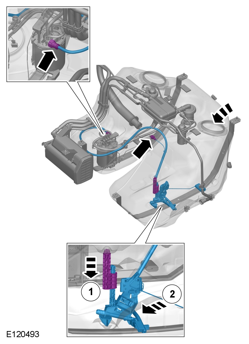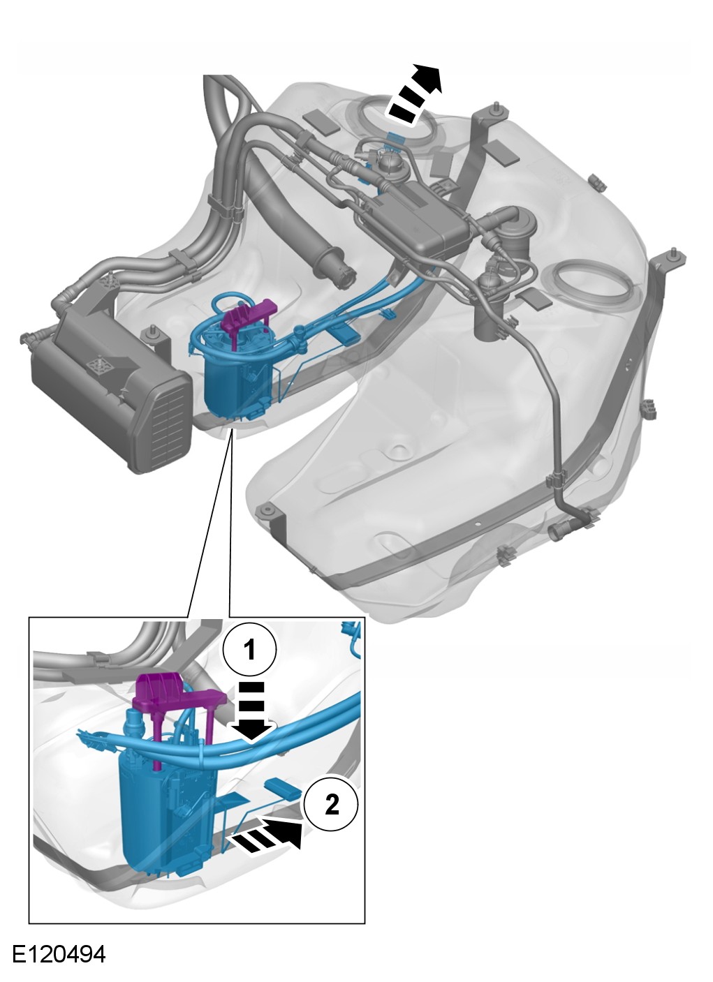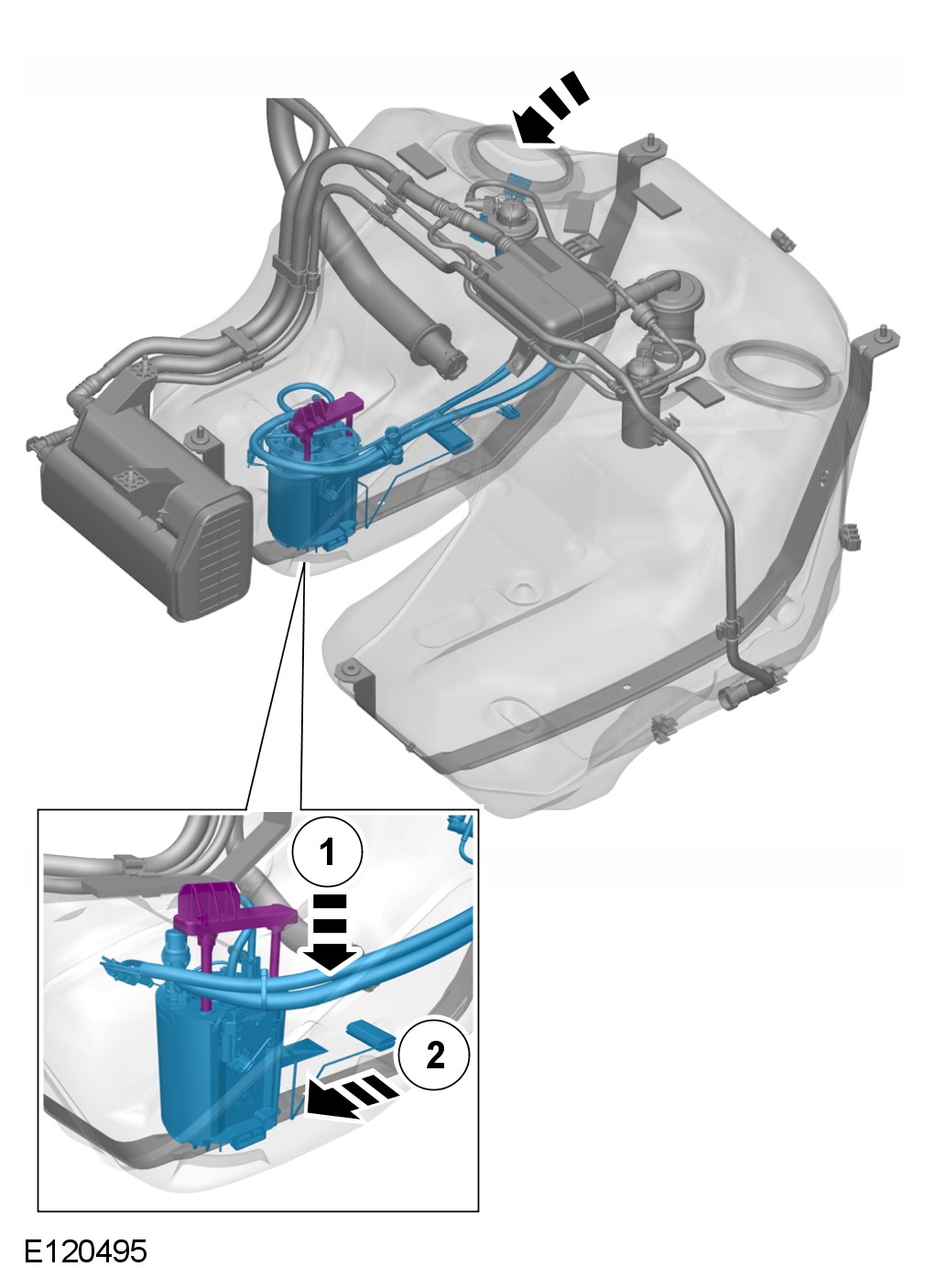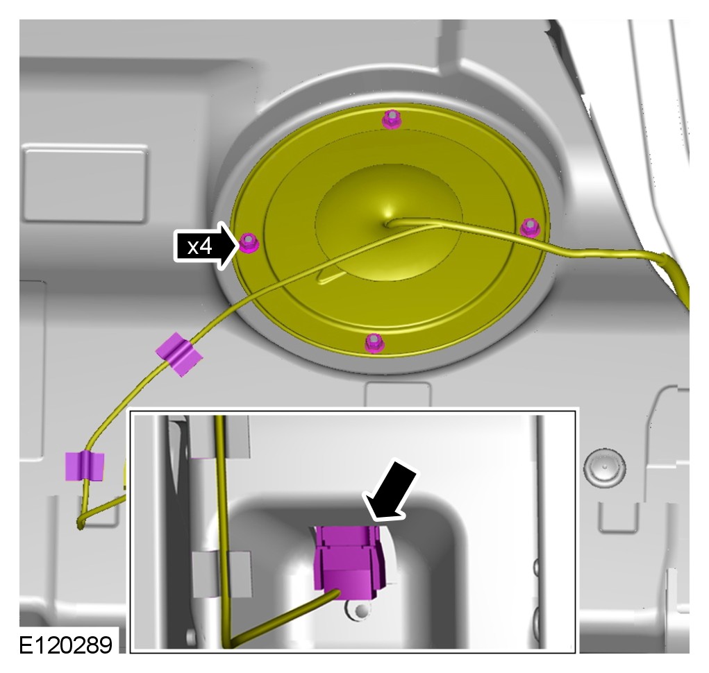 - Depress the clips and release the lower part of the pump and sender unit rearward.