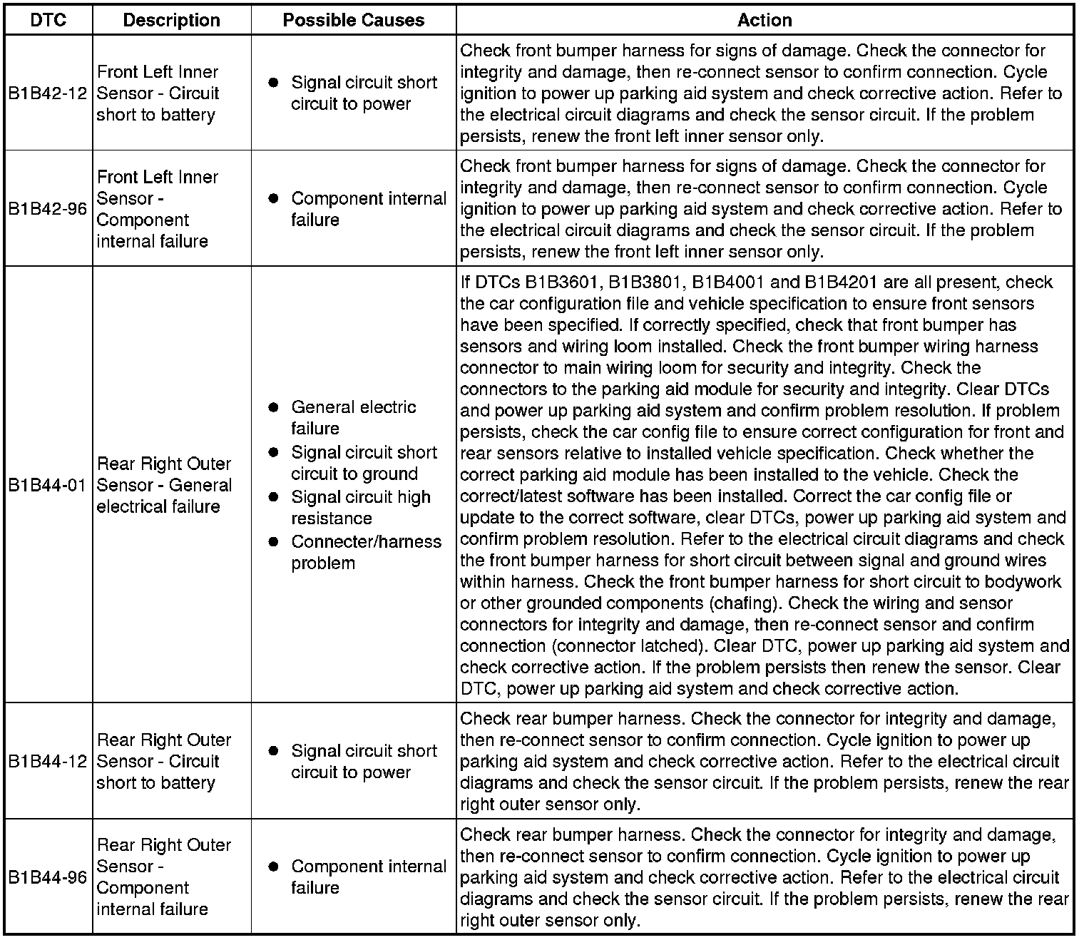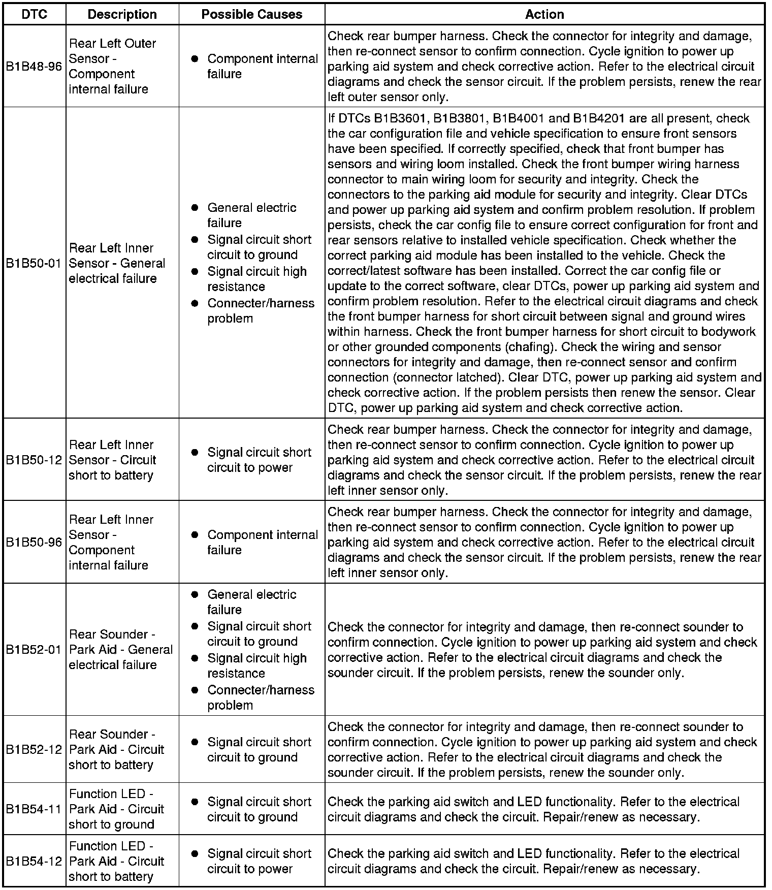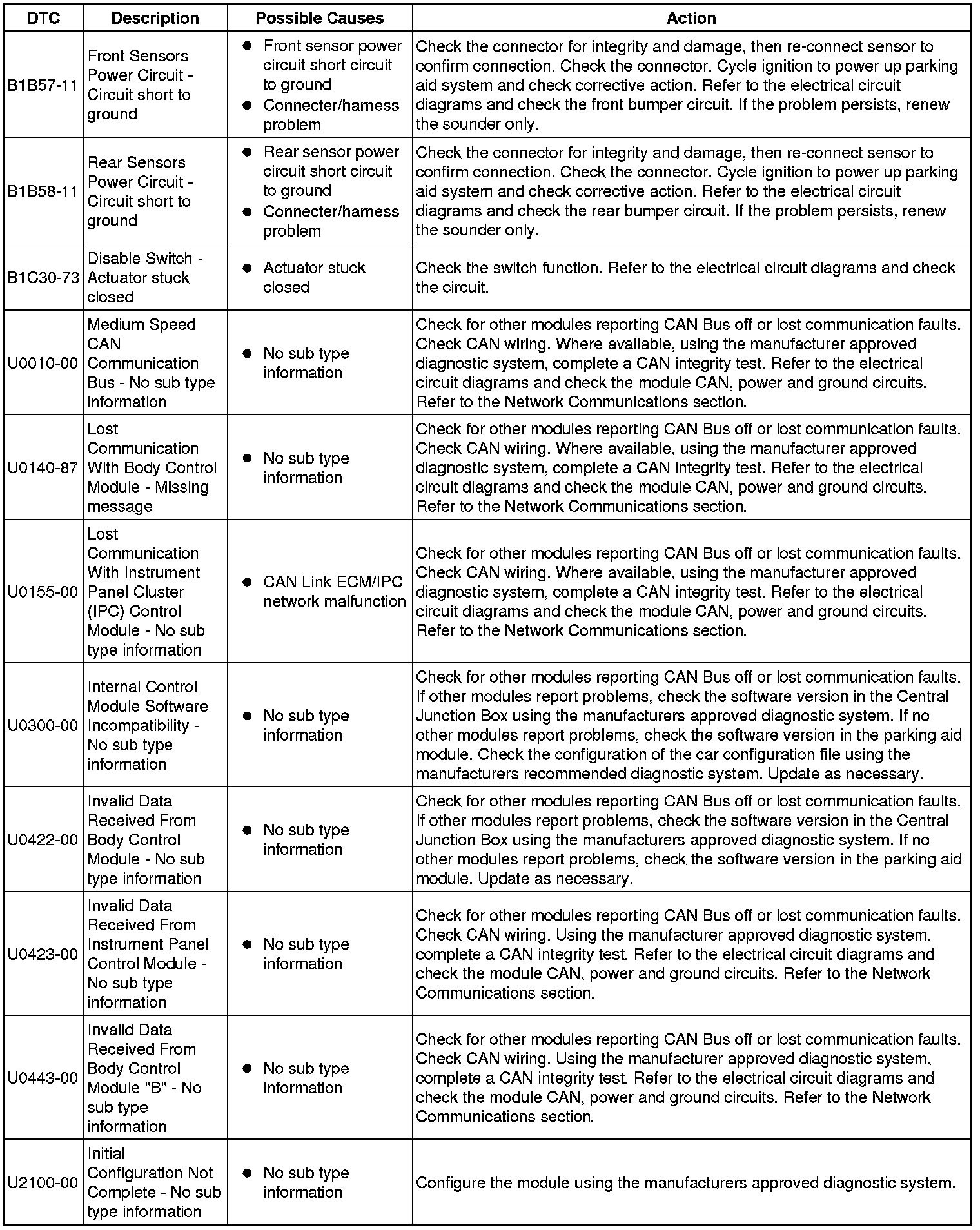 The table below lists all Diagnostic Trouble Codes (DTCs) that could be logged in the Parking Aid Module, for additional Diagnosis and Testing information refer to the relevant Diagnosis and Testing Section. For additional information, refer to Parking Aid Testing and Inspection