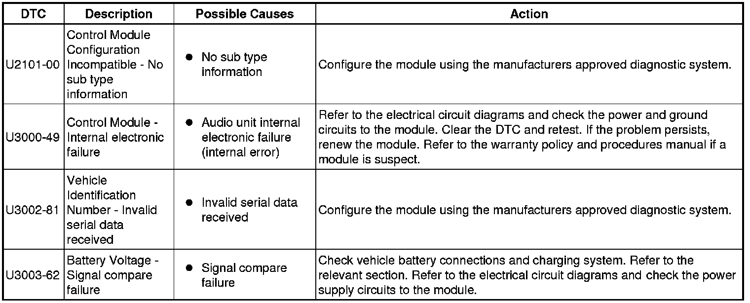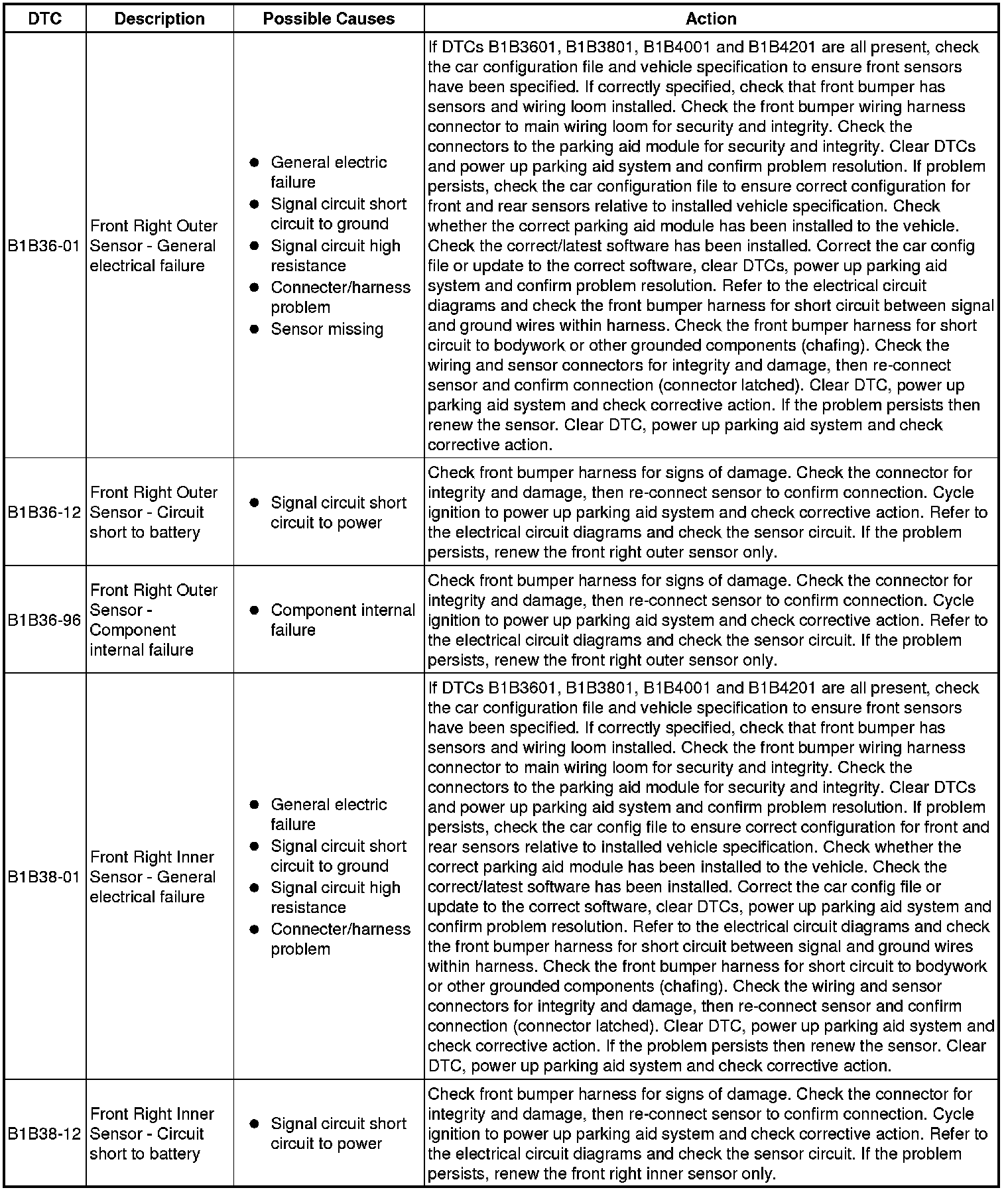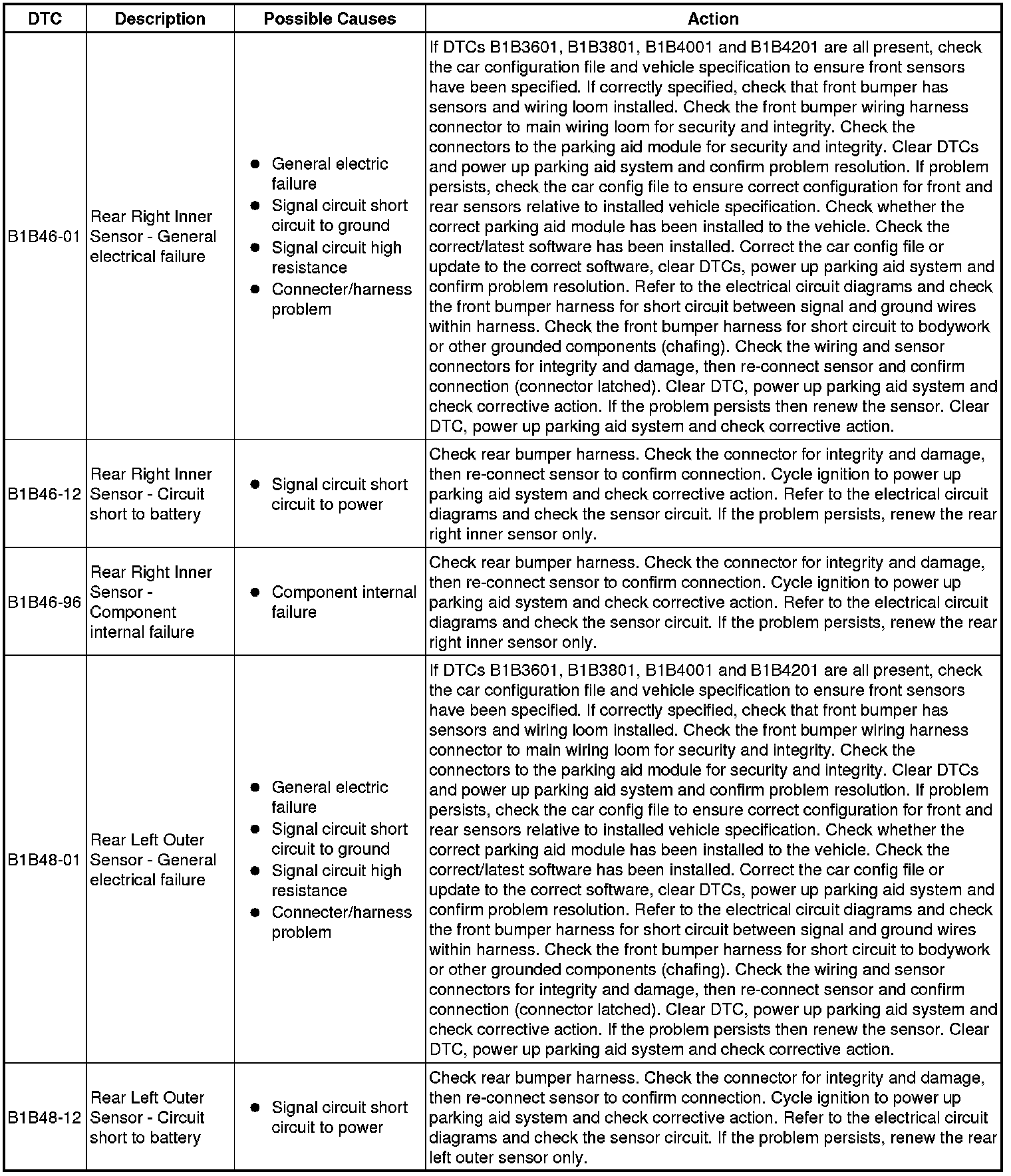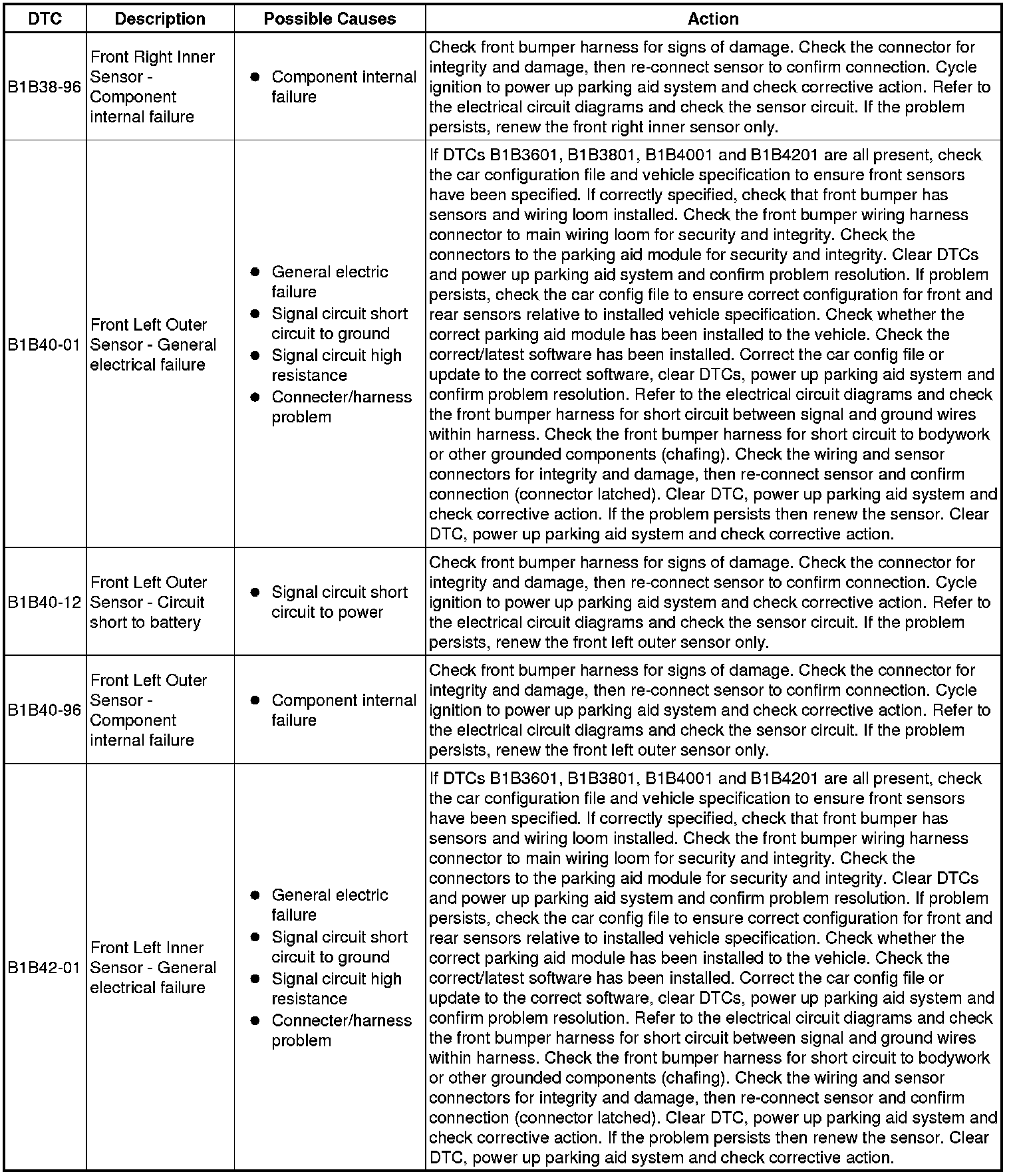 The table below lists all Diagnostic Trouble Codes (DTCs) that could be logged in the Parking Aid Module, for additional Diagnosis and Testing information refer to the relevant Diagnosis and Testing Section. For additional information, refer to Parking Aid Testing and Inspection