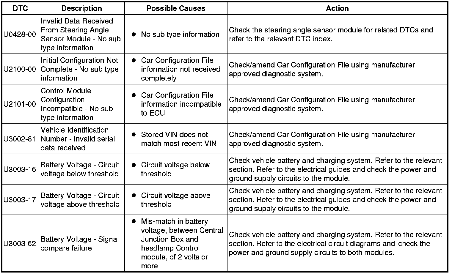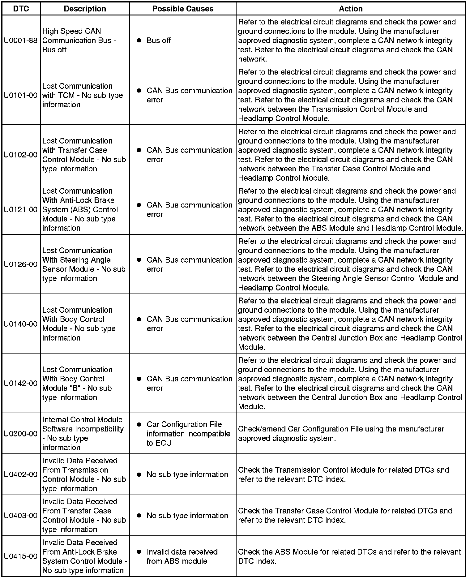The table below lists all Diagnostic Trouble Codes (DTCs) that could be logged in the Headlamp Control Module A, for additional Diagnosis and Testing information refer to the relevant Diagnosis and Testing Section. For additional information, refer to Headlamp Leveling Testing and Inspection