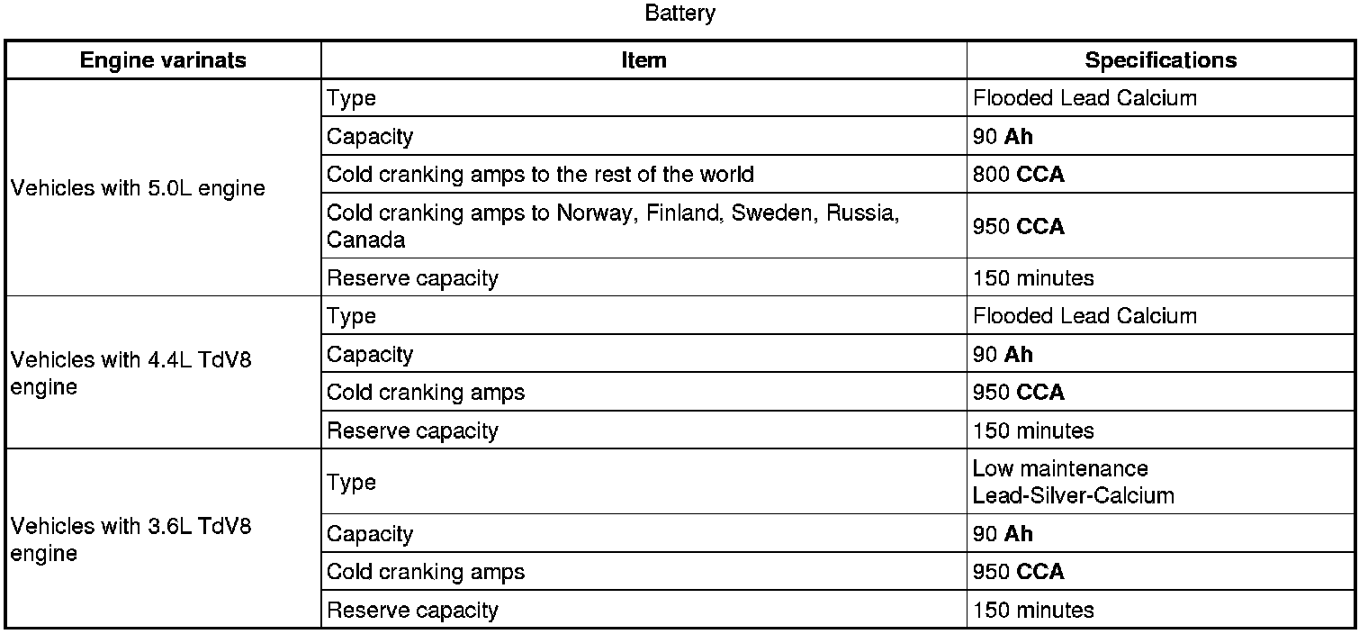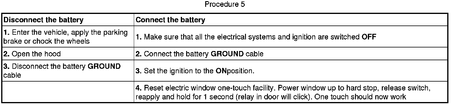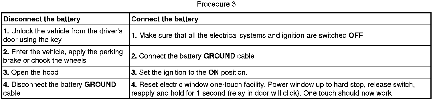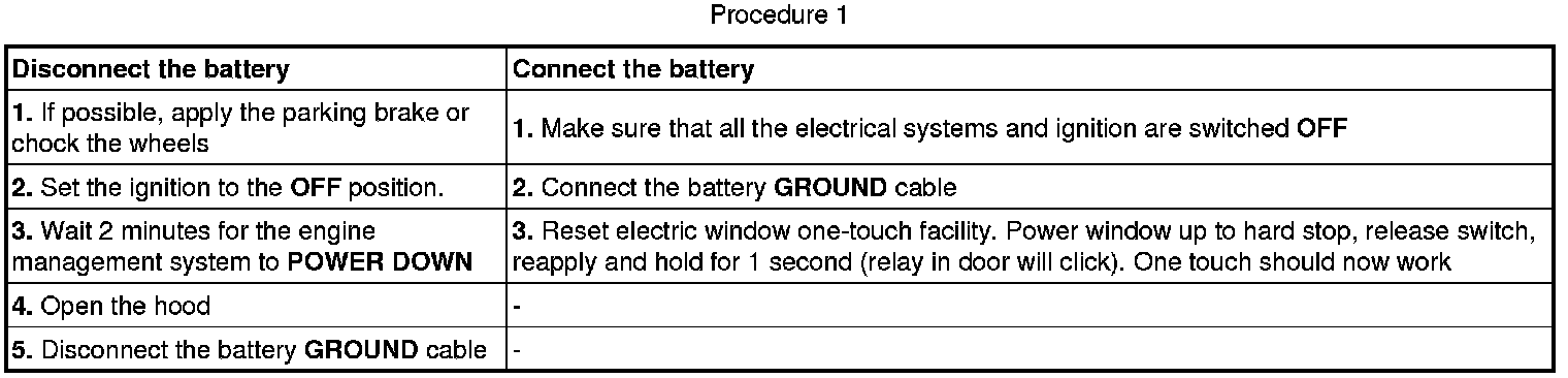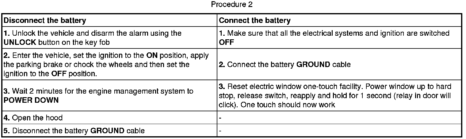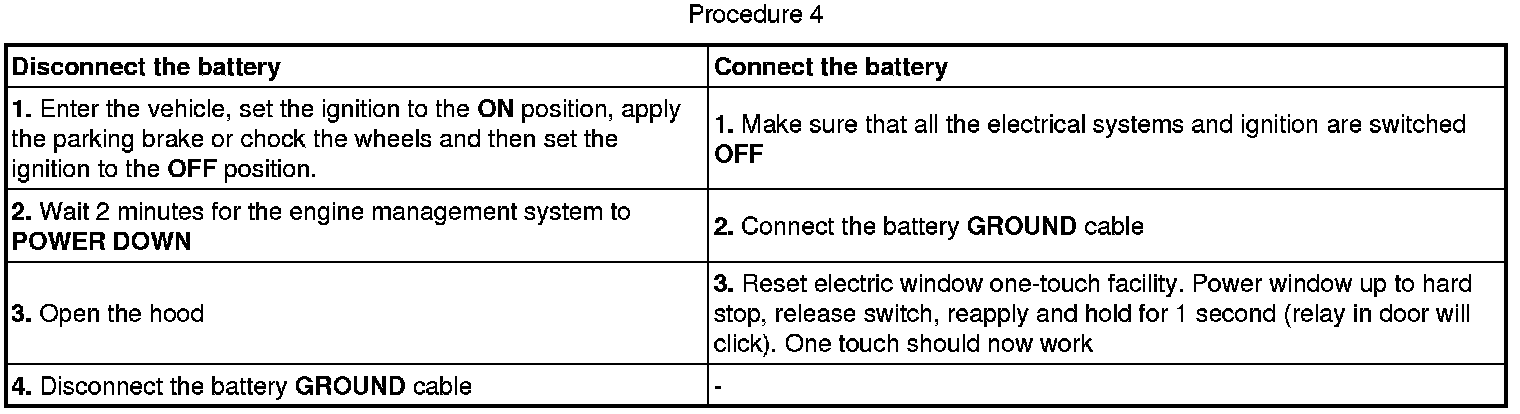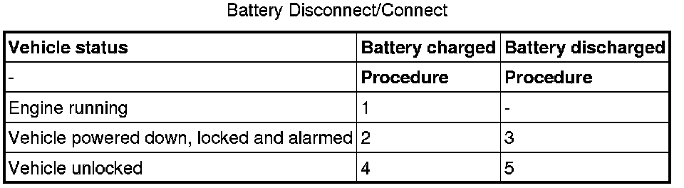 CAUTION: The vehicle status and battery condition must be established before attempting battery disconnect/connect. Reference must then be made to the following table to establish the relevant procedure to be followed.