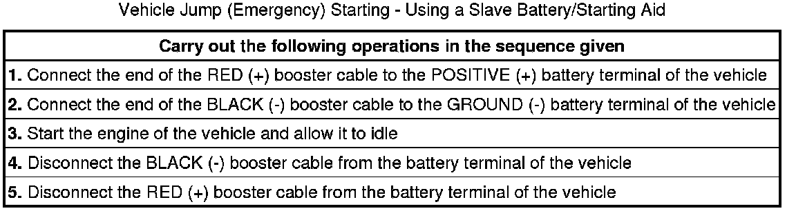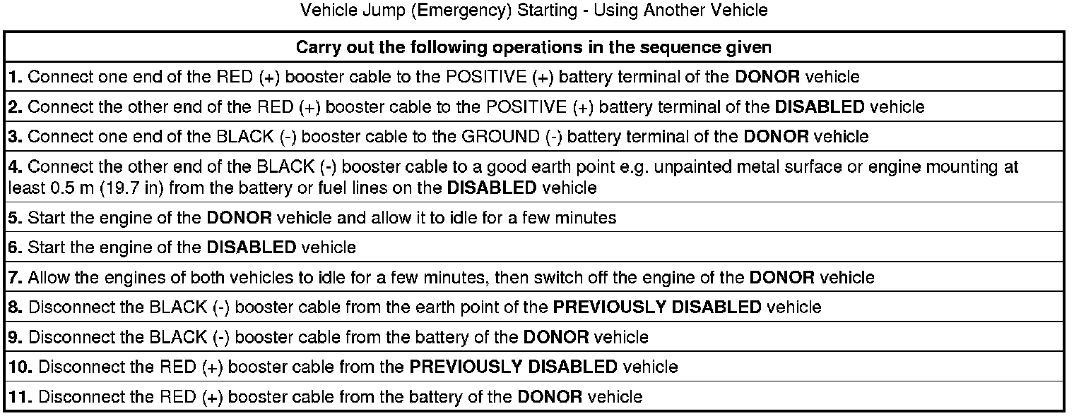 WARNING: Prior to attempting to start the disabled vehicle, make sure that the parking brake is applied or suitably chock the wheels. Make sure that 'P' - PARK - Automatic Gearbox or NEUTRAL - Manual Gearbox is selected.
