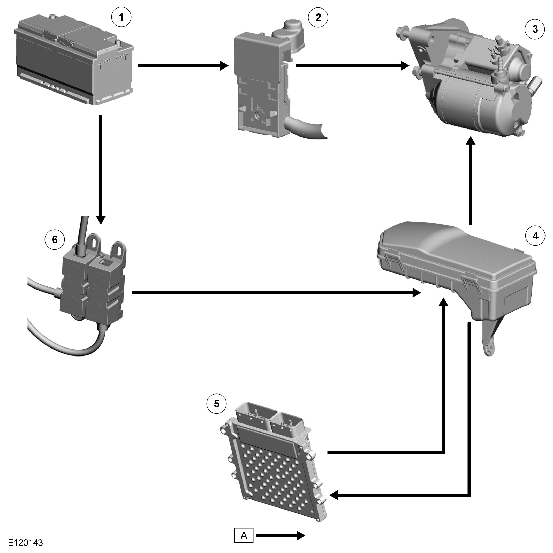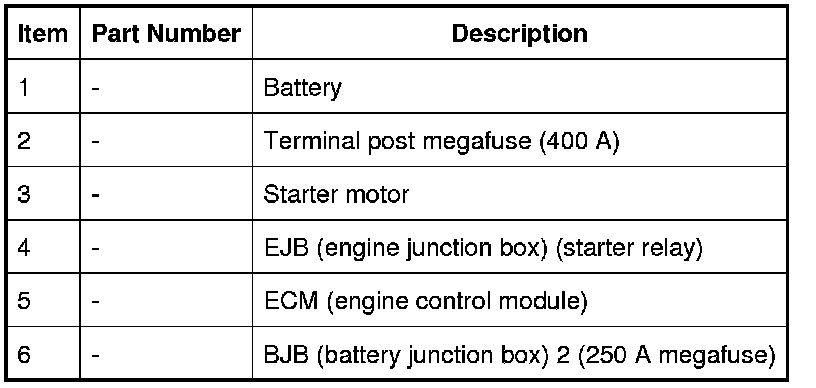 When the ECM (engine control module) receives a crank request, it energizes the starter relay in the EJB (engine junction box). The energized starter relay supplies 12 V power (fed via the 250 A megafuse in BJB (battery junction box) 2 to energize the pull-in coil of the starter solenoid. Once activated, the pull-in coil engages the solenoid plunger, which engages the pinion gear with the ring gear. The plunger then closes the solenoid circuit, feeding power from the 400 A megafuse on the battery positive terminal to the starter motor.