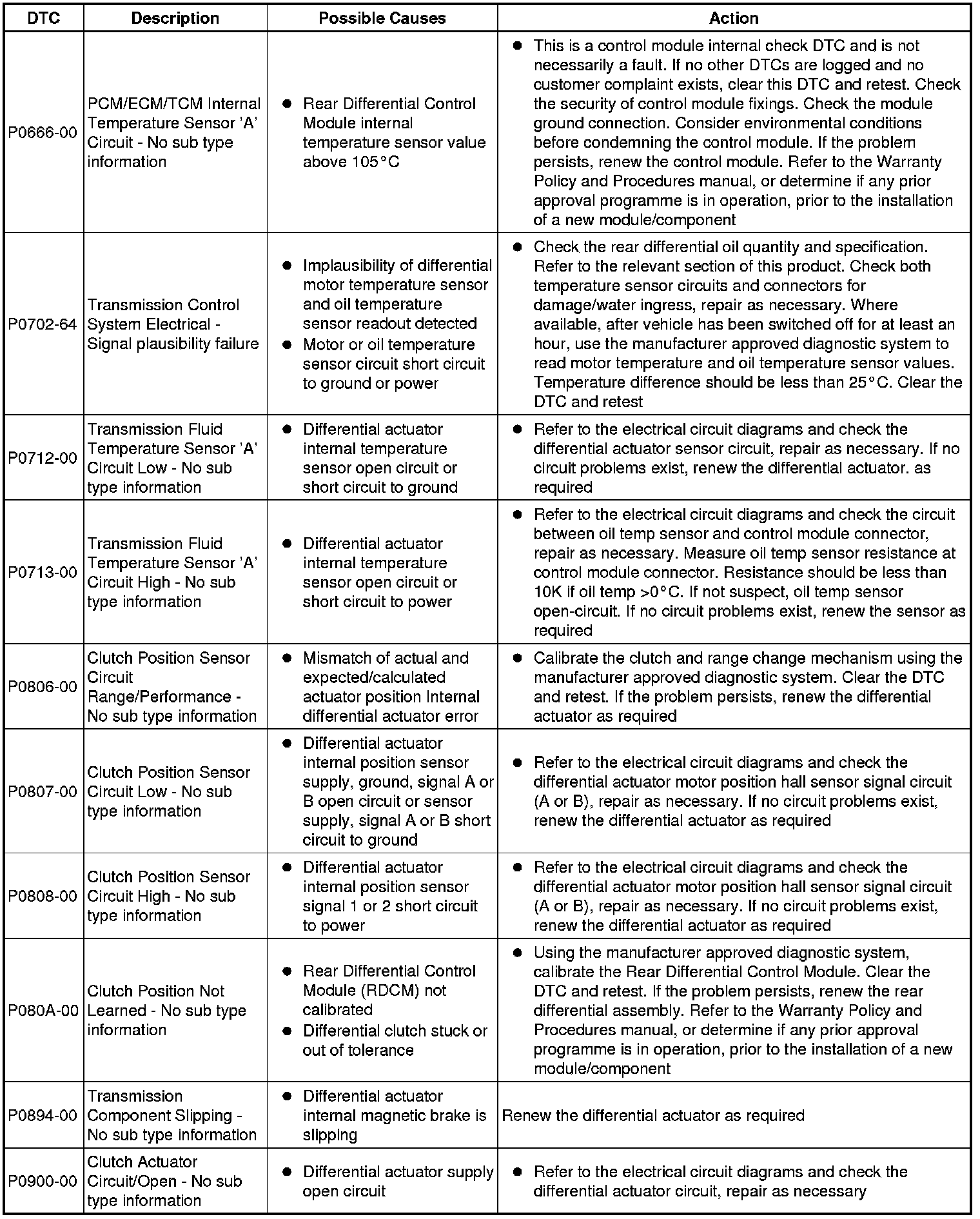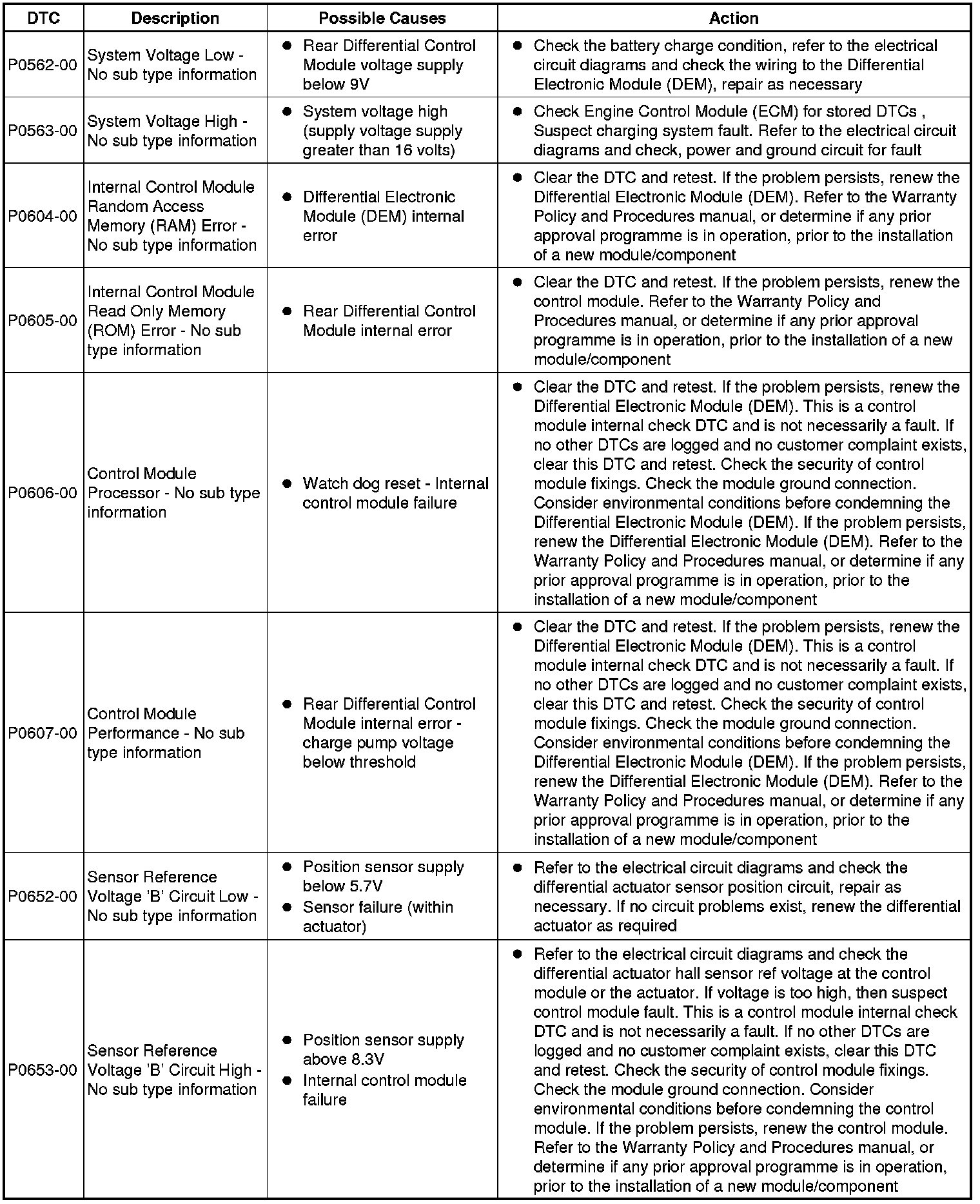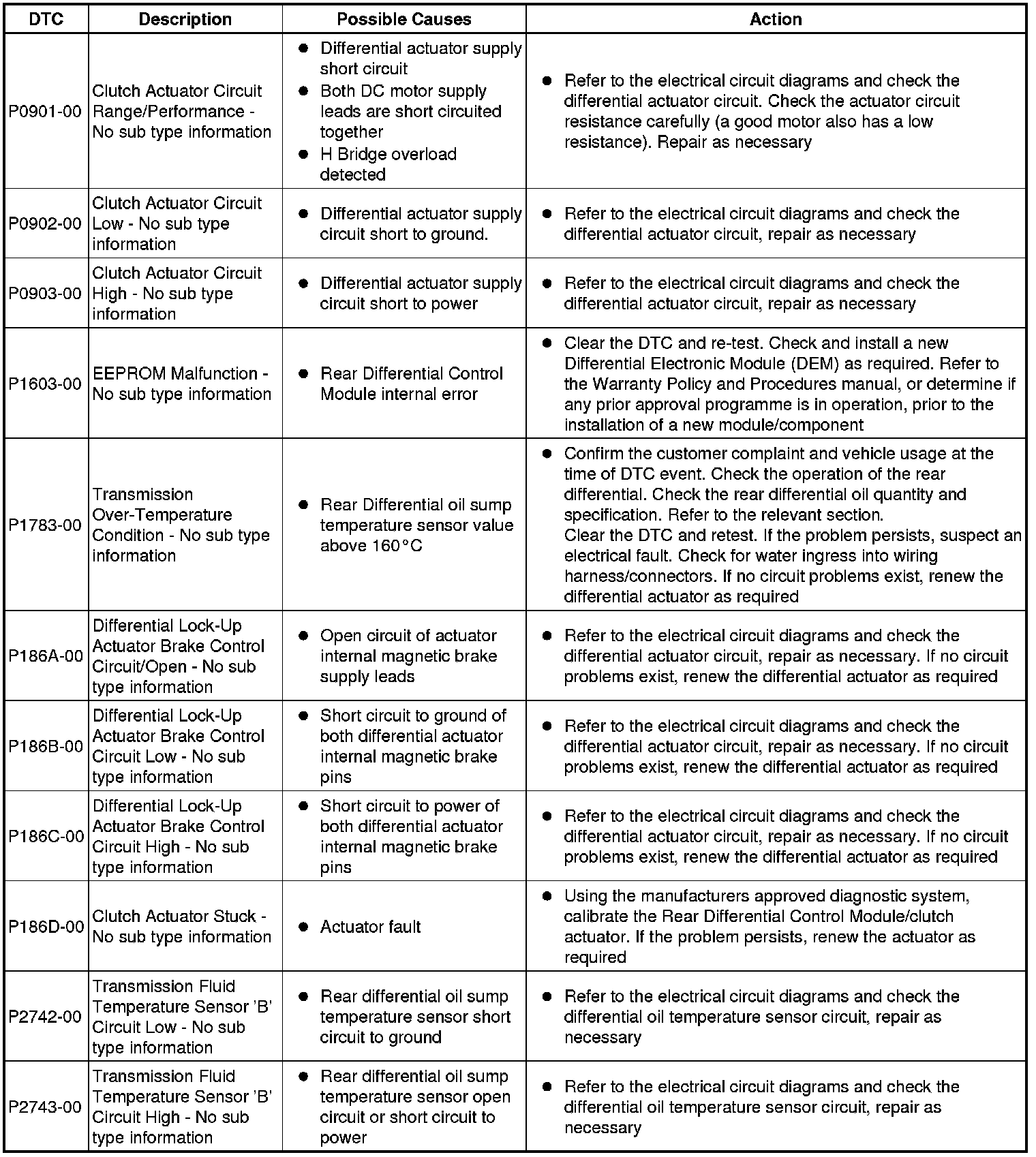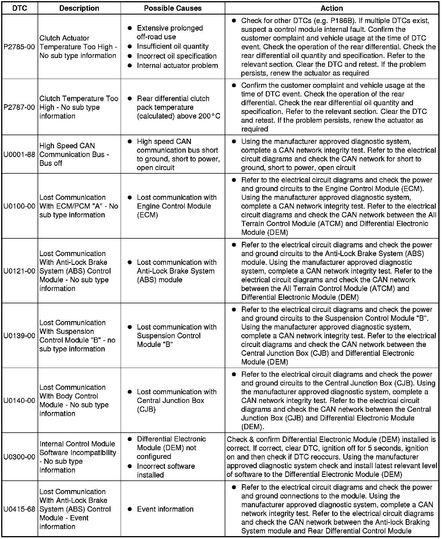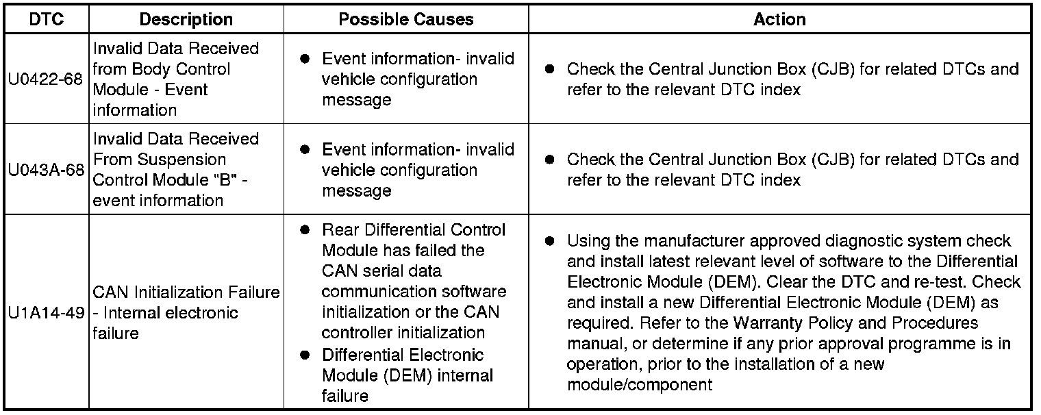 The table below lists all Diagnostic Trouble Codes (DTCs) that could be logged in the Rear Differential Control Module, for additional Diagnosis and Testing information refer to the relevant Diagnosis and Testing Section. For additional information, refer to Rear Drive Axle and Differential Initial Inspection and Diagnostic Overview Symptom Related Diagnostic Procedures