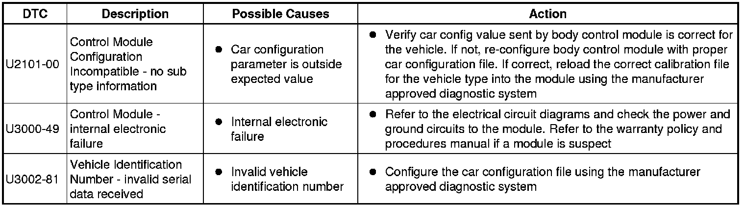The table below lists all Diagnostic Trouble Codes (DTCs) that could be logged in the Remote Keyless Entry Module, for additional Diagnosis and Testing information refer to the relevant Diagnosis and Testing Section. For additional information, refer to Anti-Theft - Active Testing and Inspection