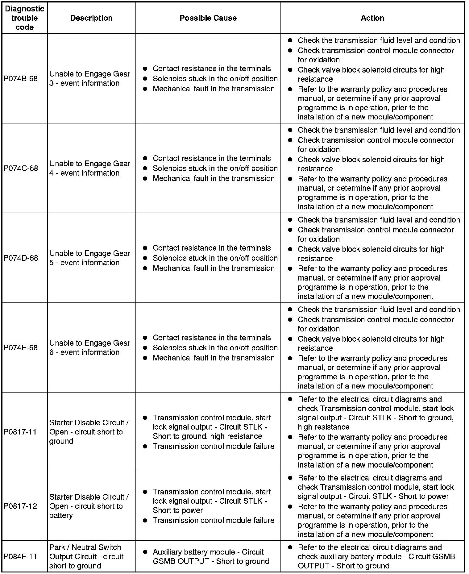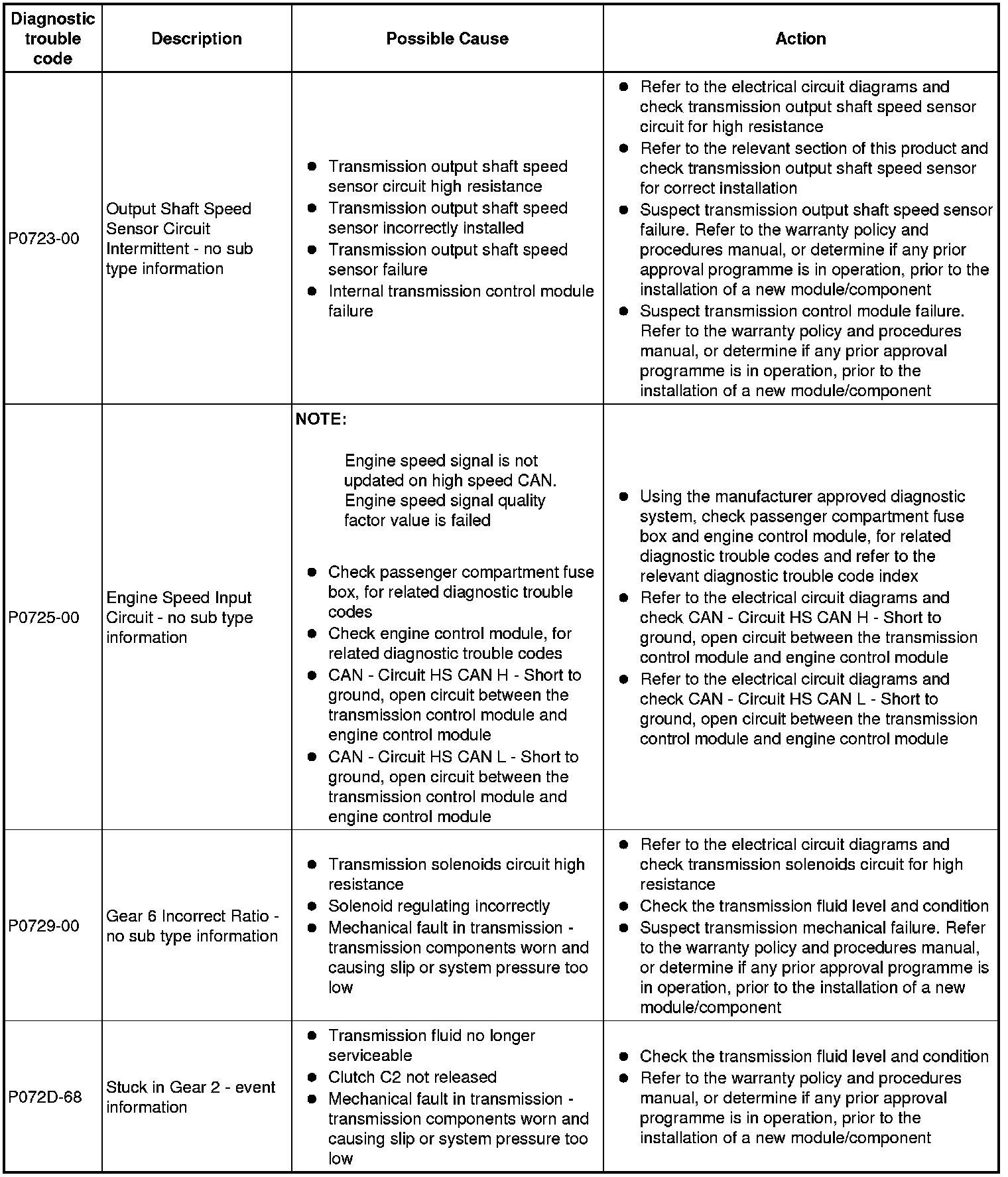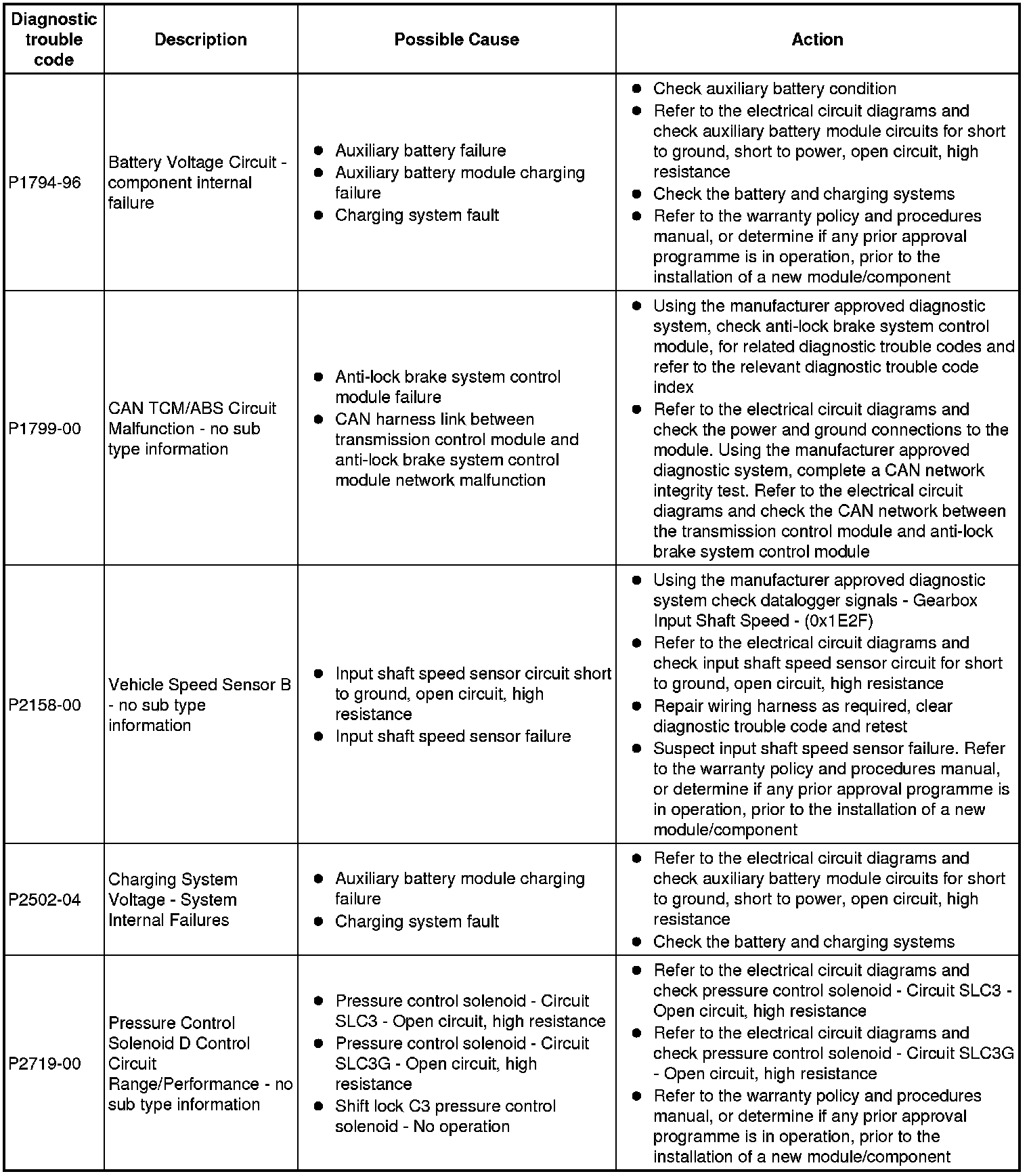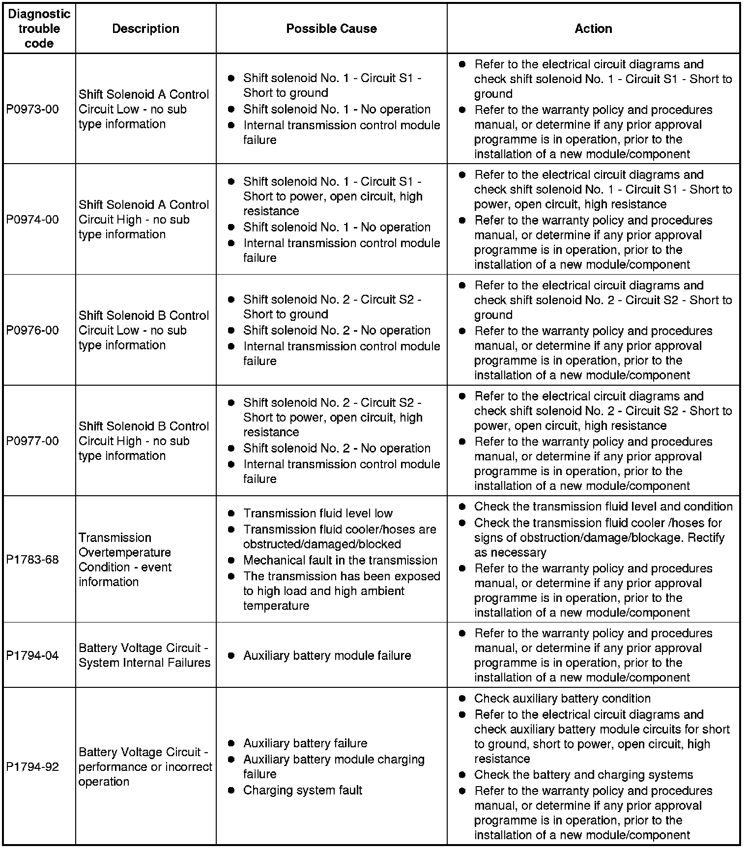 Generic scan tools may not read the codes listed, or may read only 5-digit codes. Match the 5 digits from the scan tool to the first 5 digits of the 7-digit code listed to identify the fault (the last 2 digits give extra information read by the manufacturer-approved diagnostic system)