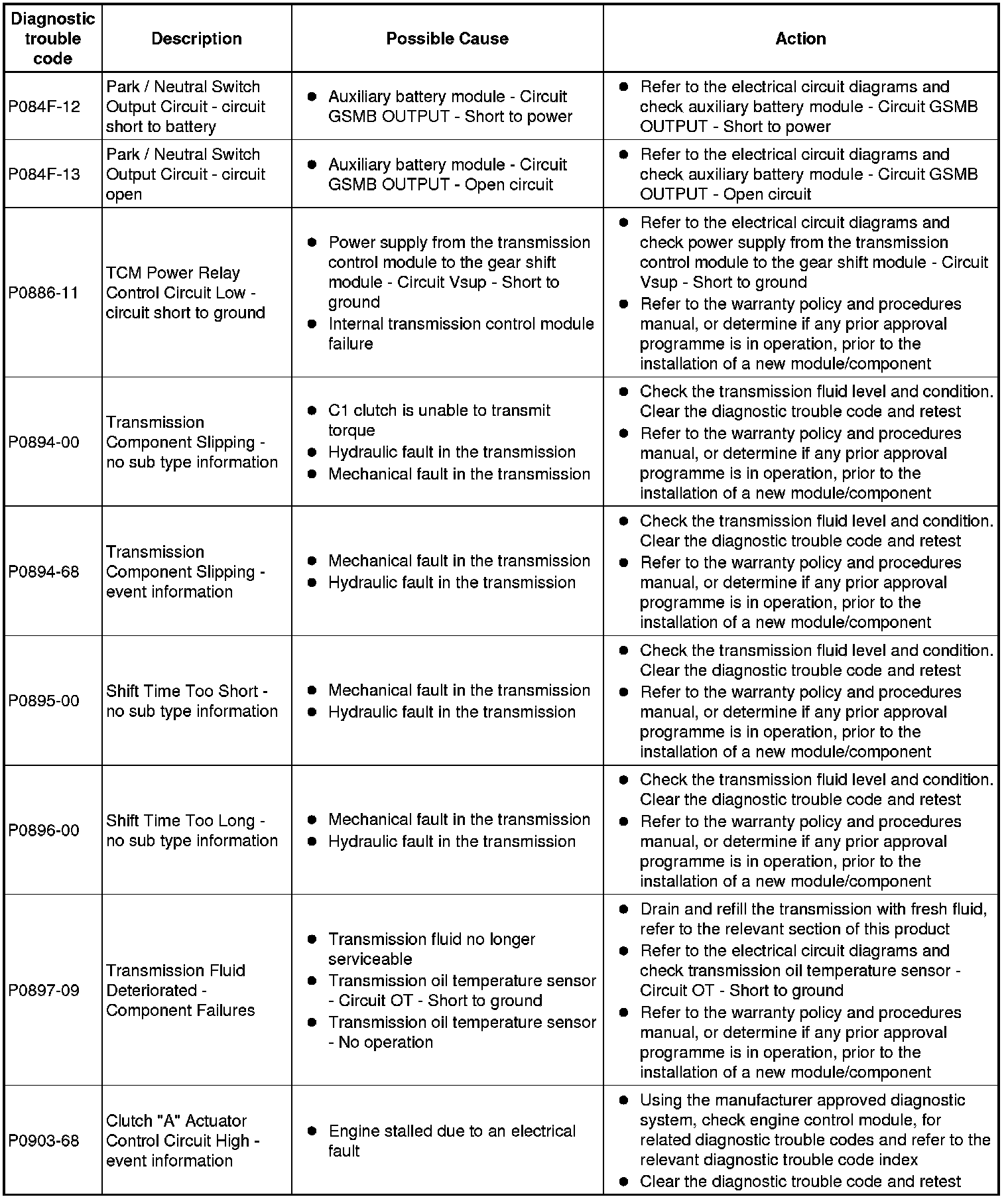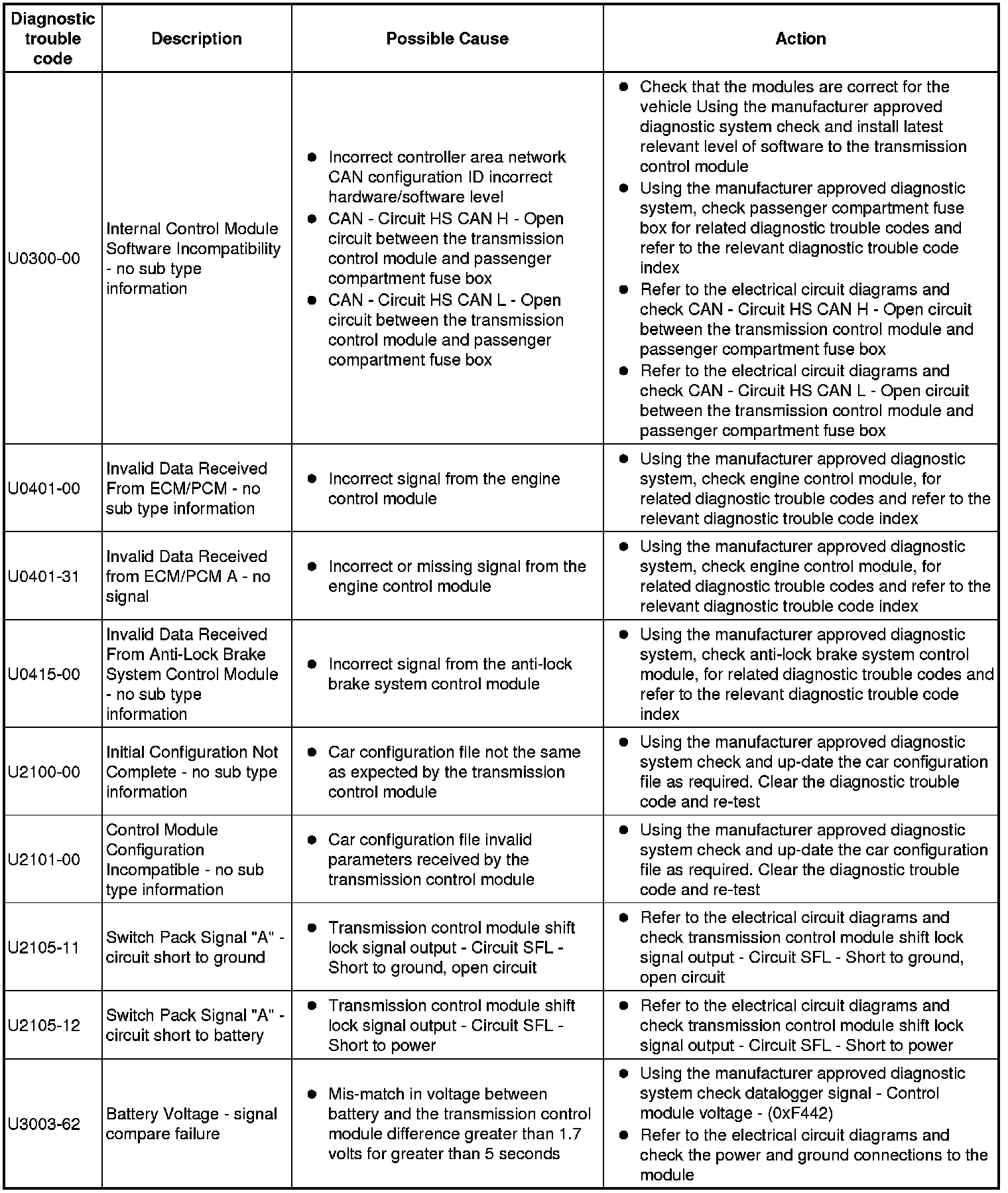 The table below lists all diagnostic trouble codes (DTCs) that could be logged on the digital audio broadcast module, for additional diagnosis and testing information refer to the relevant diagnosis and testing section. For additional information, refer to Diagnostics Testing and Inspection