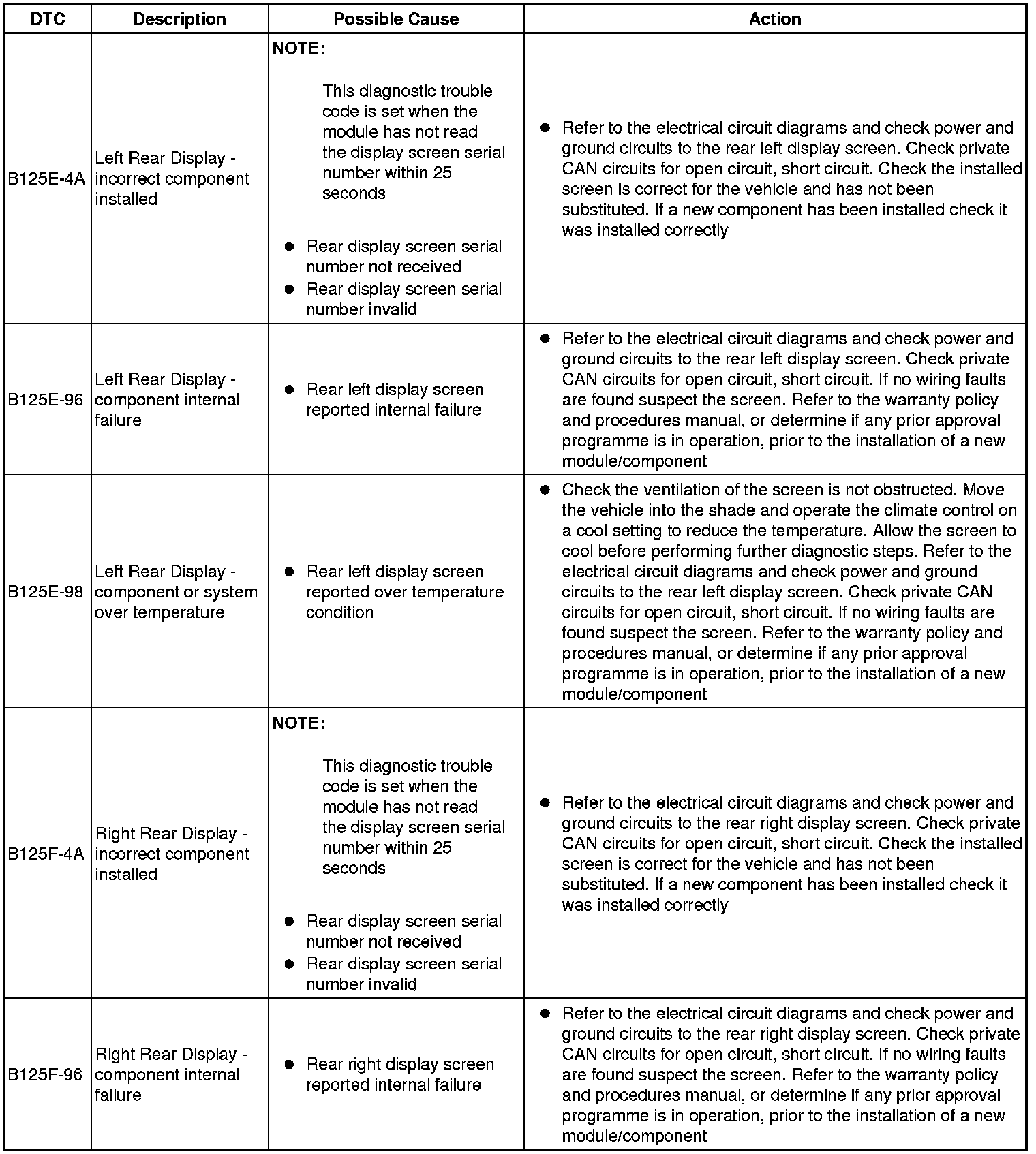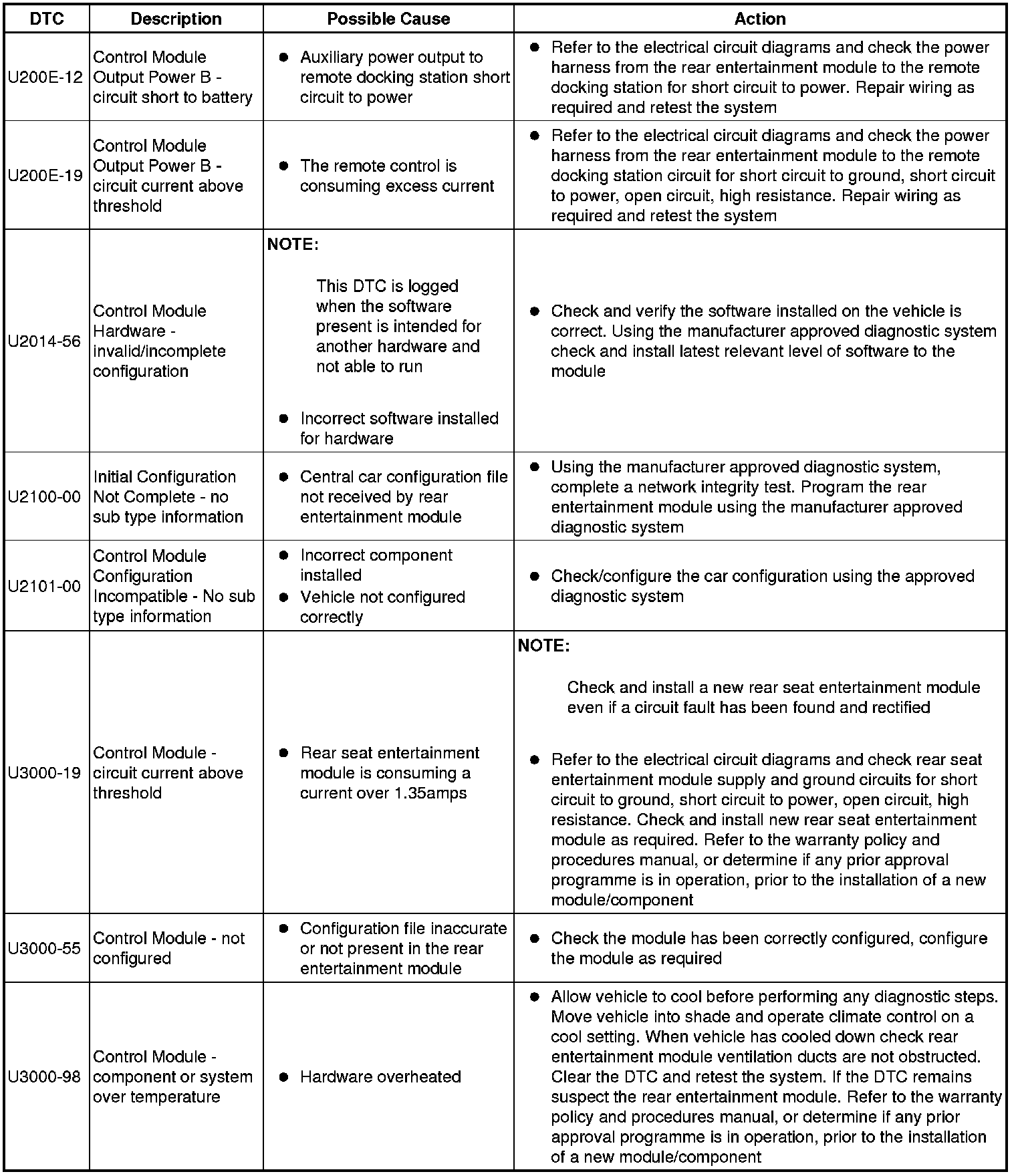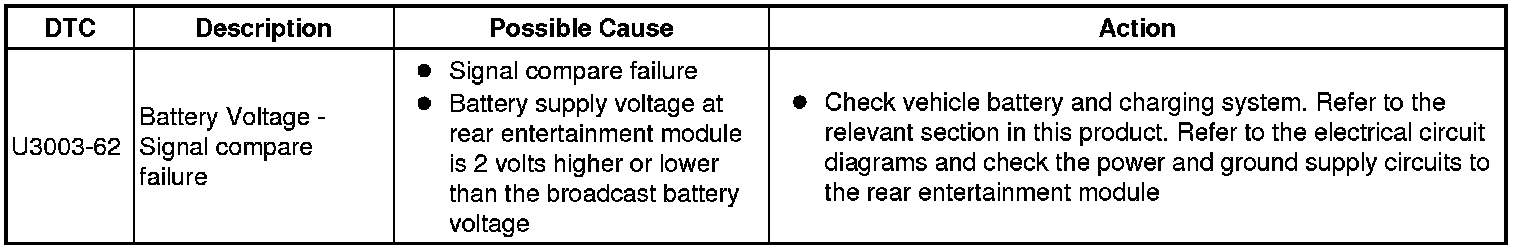 The table below lists all Diagnostic Trouble Codes (DTCs) that could be logged in the Rear Entertainment Module, for additional Diagnosis and Testing information refer to the relevant Diagnosis and Testing Section. For additional information, refer to Information and Entertainment System Testing and Inspection