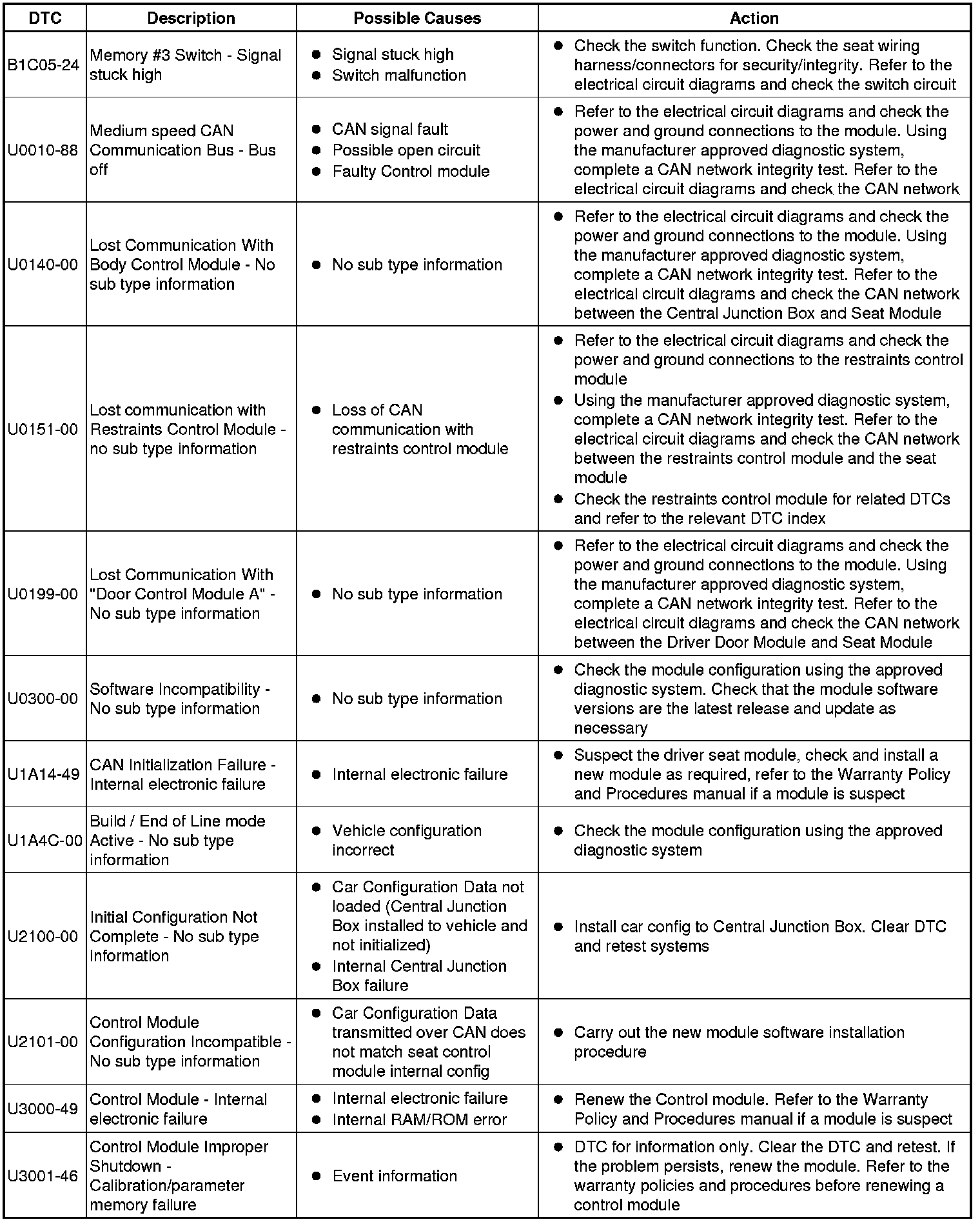 The table below lists all Diagnostic Trouble Codes (DTCs) that could be logged in the Driver/Passenger Seat Module, for additional Diagnosis and Testing information refer to the relevant Diagnosis and Testing Section. For additional information, refer to Seats Testing and Inspection