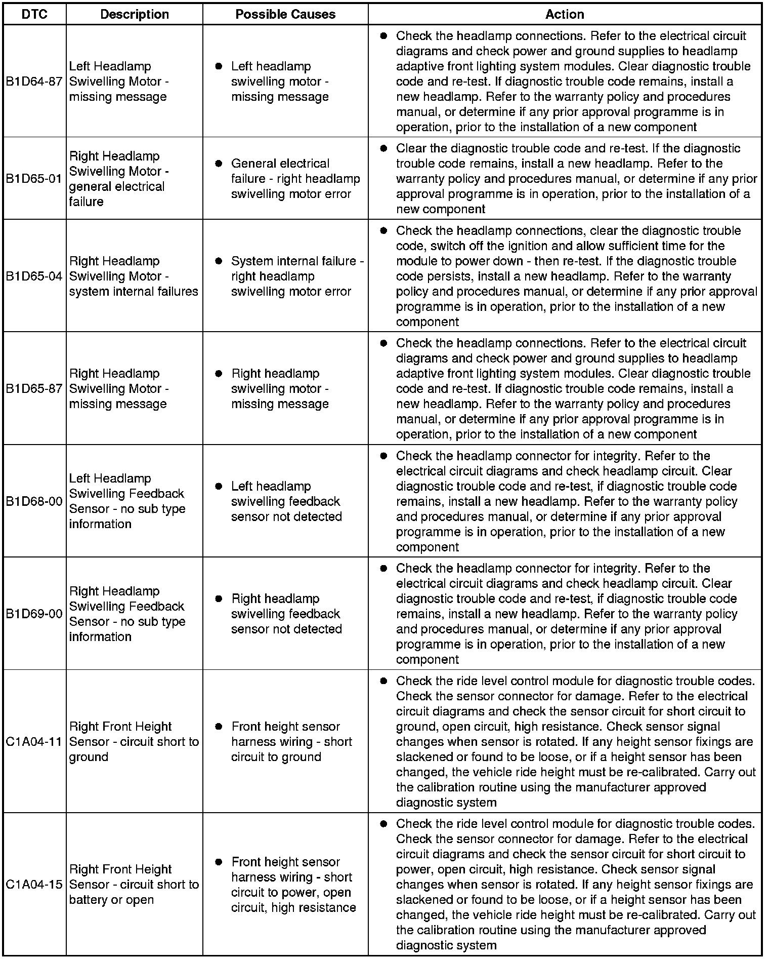 The table below lists all diagnostic trouble codes (DTCs) that could be logged in the headlamp control module, for additional diagnosis and testing information refer to the relevant diagnosis and testing section. For additional information, refer to Headlamps