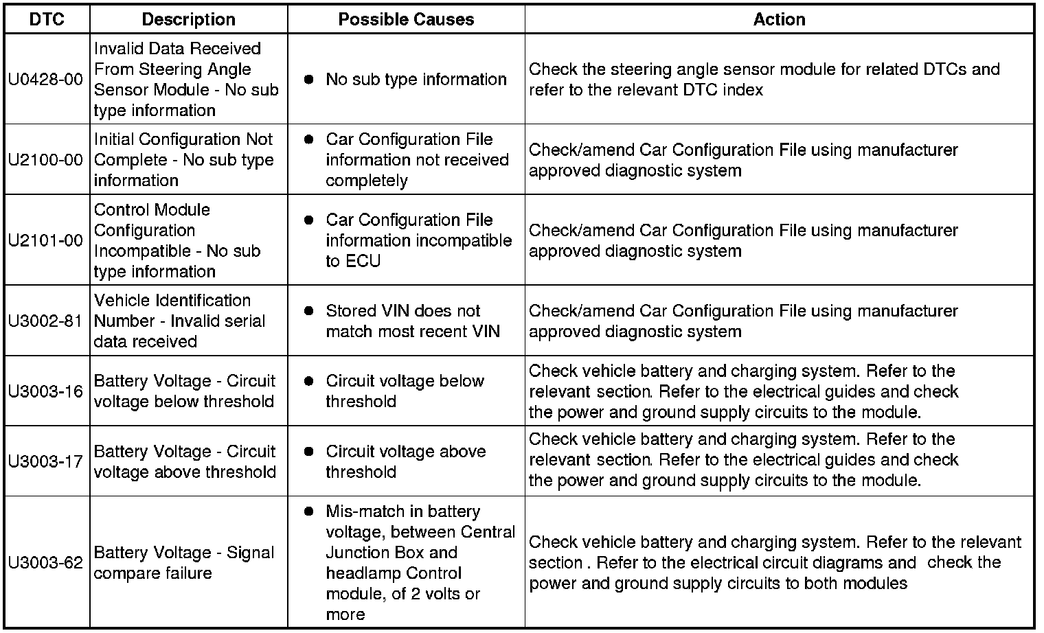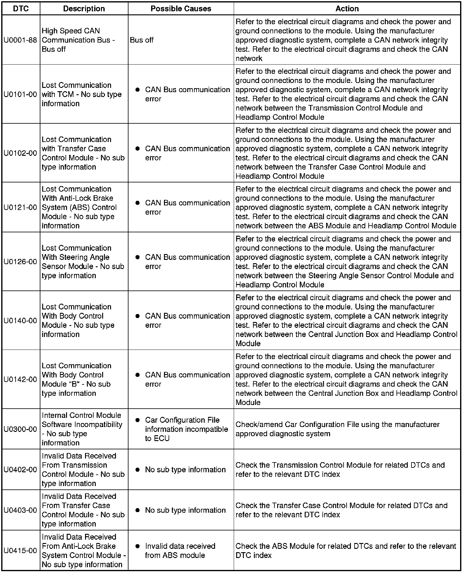 The table below lists all Diagnostic Trouble Codes (DTCs) that could be logged in the Headlamp Control Module, for additional Diagnosis and Testing information refer to the relevant Diagnosis and Testing Section. For additional information, refer to Headlamps Testing and Inspection