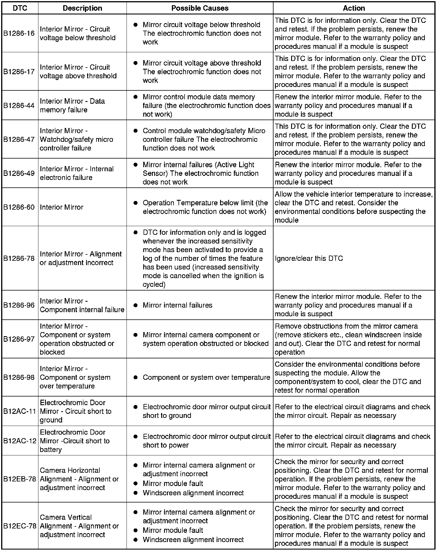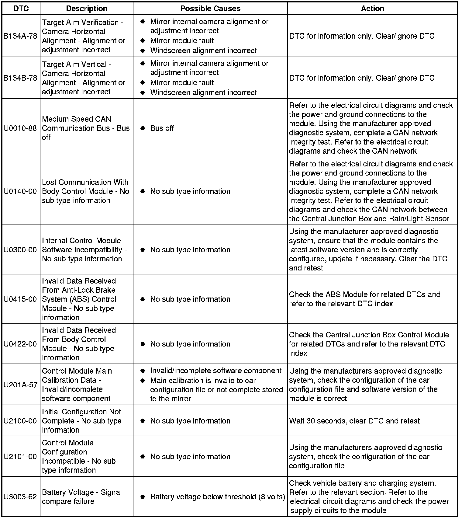 The table below lists all Diagnostic Trouble Codes (DTCs) that could be logged in the Headlamp Control Module B, for additional Diagnosis and Testing information refer to the relevant Diagnosis and Testing Section. For additional information, refer to Autolamps Testing and Inspection