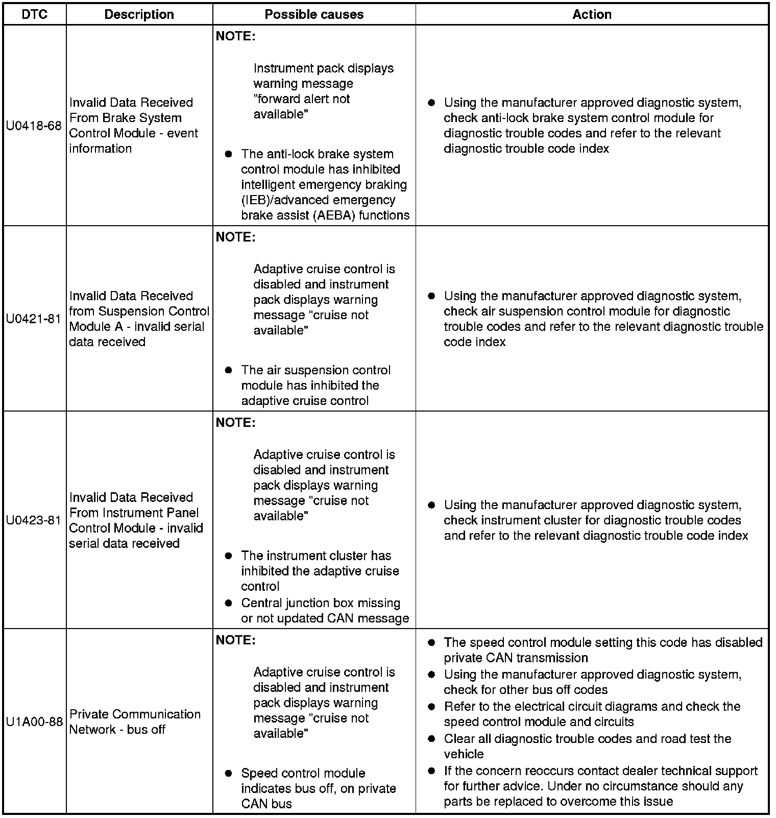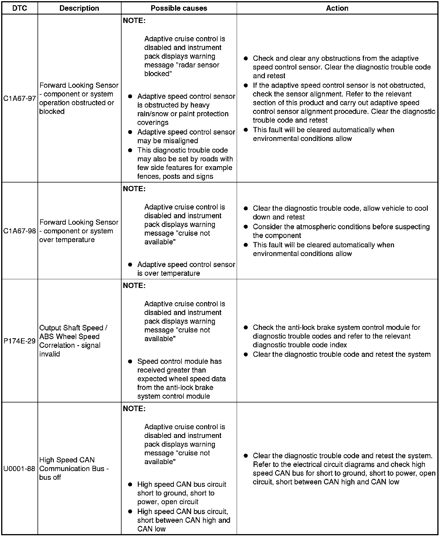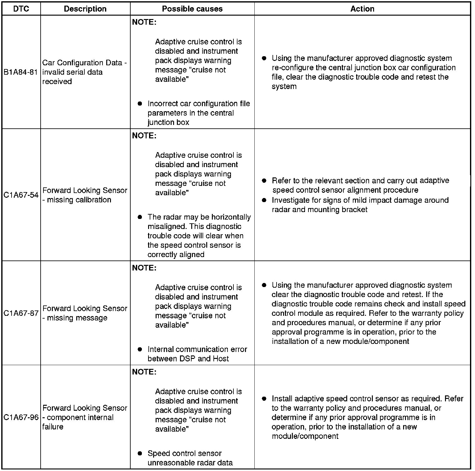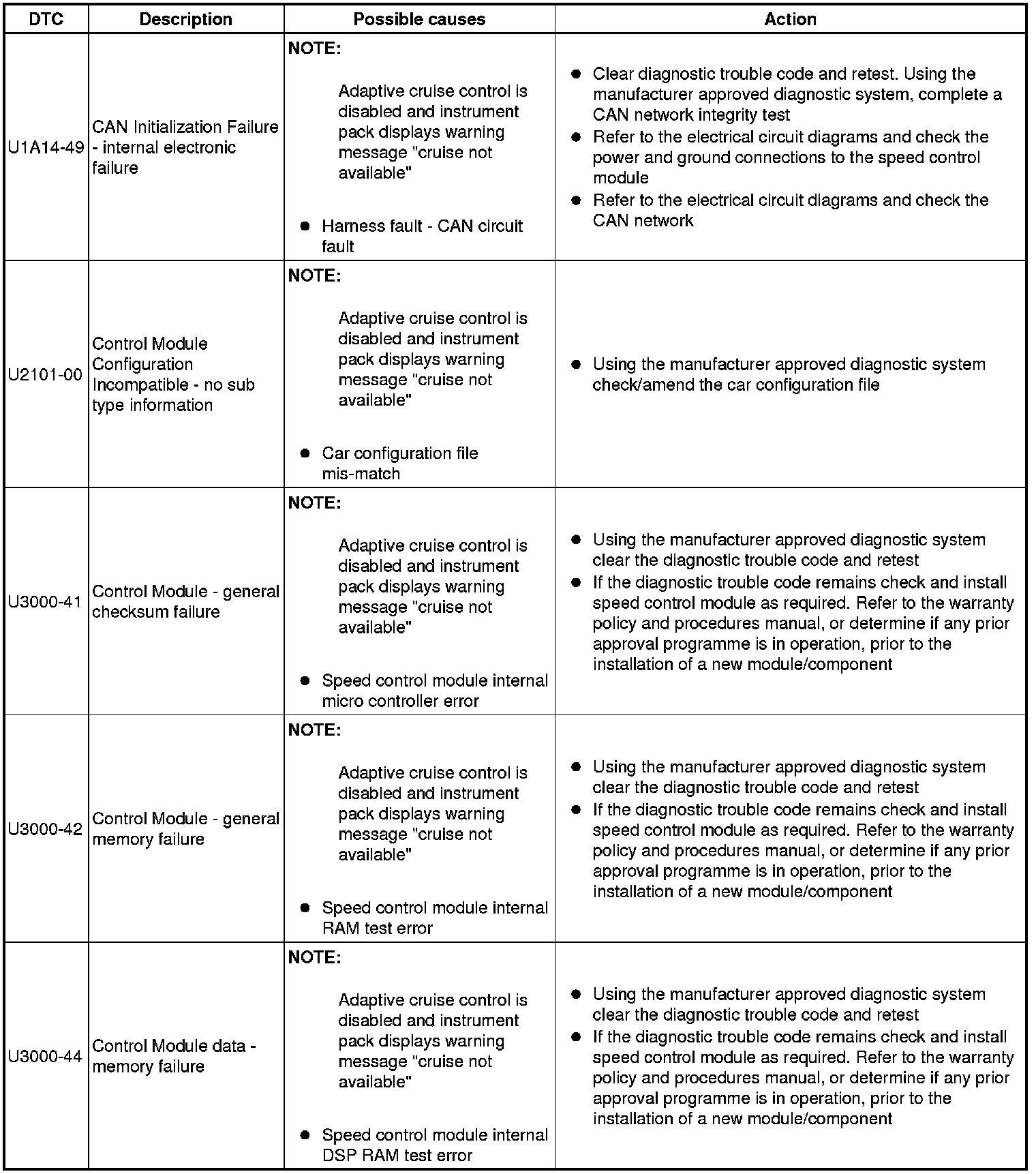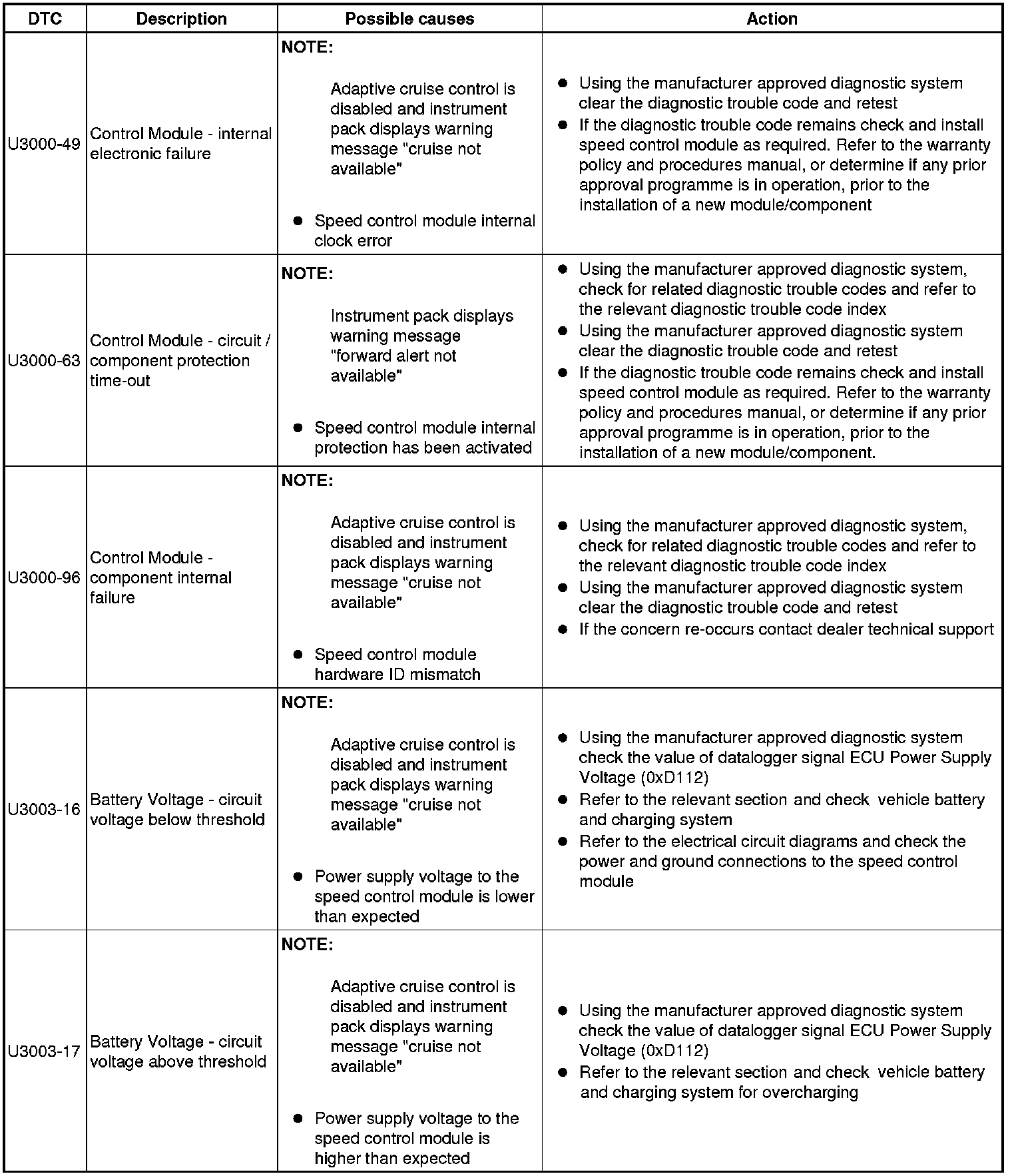 The table below lists all Diagnostic Trouble Codes (DTCs) that could be logged in the Cruise Control Module, for additional Diagnosis and Testing information refer to the relevant Diagnosis and Testing Section.
