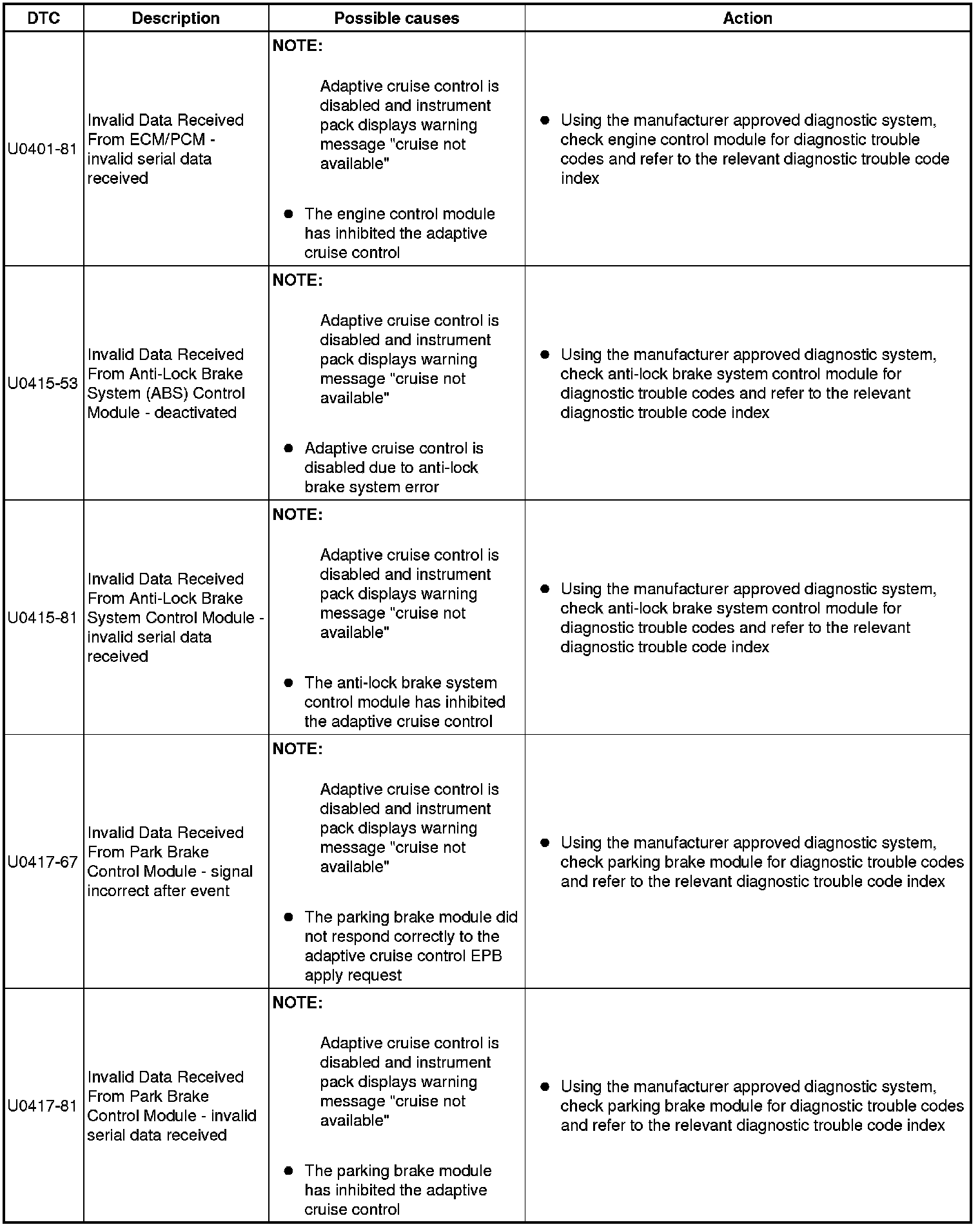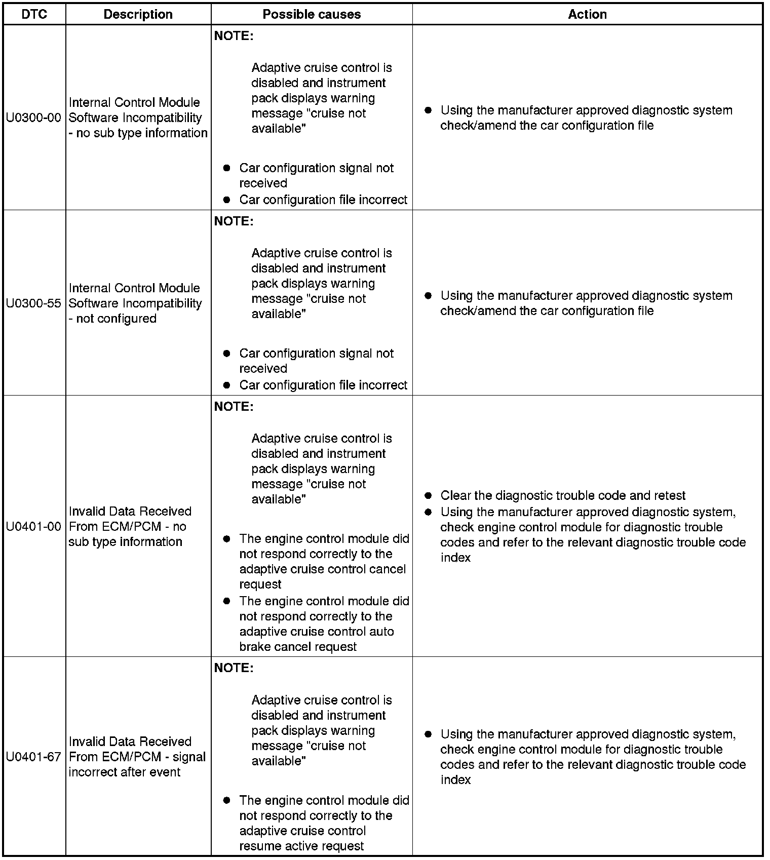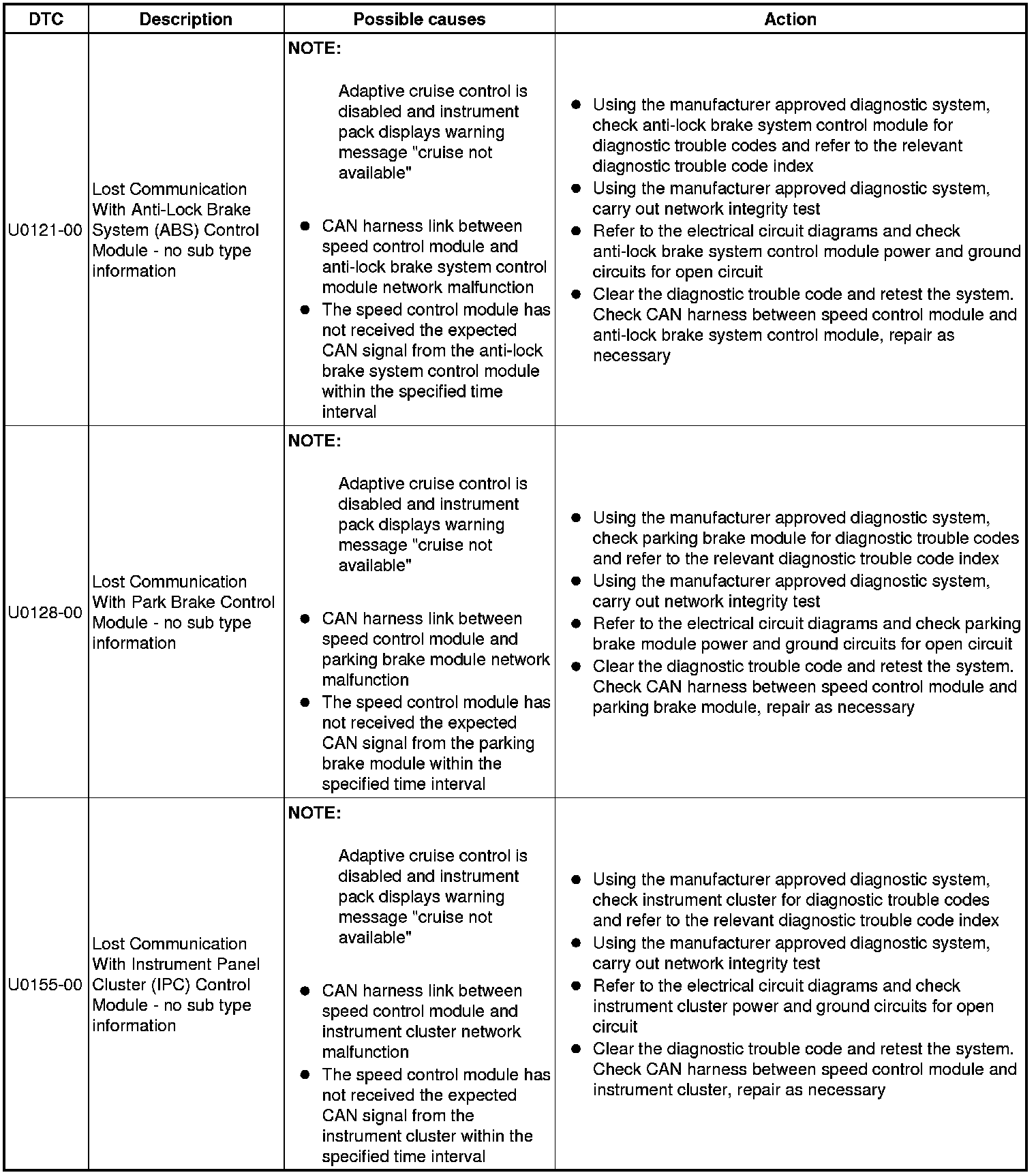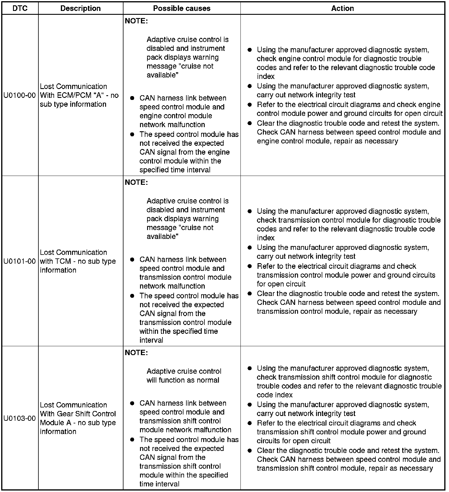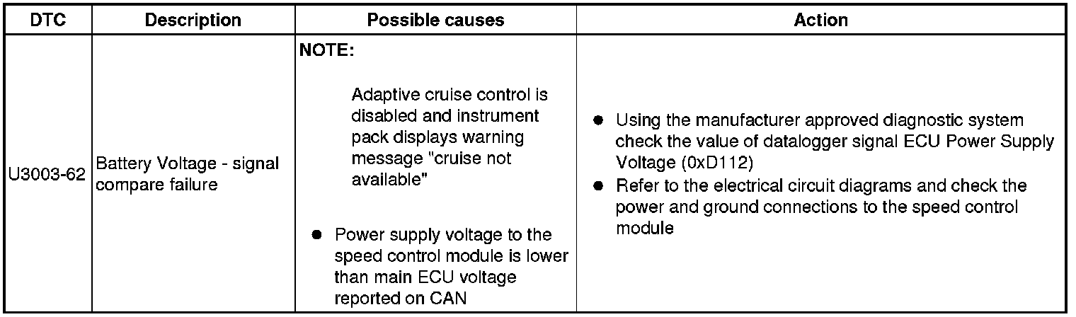 The table below lists all Diagnostic Trouble Codes (DTCs) that could be logged in the Cruise Control Module, for additional Diagnosis and Testing information refer to the relevant Diagnosis and Testing Section.