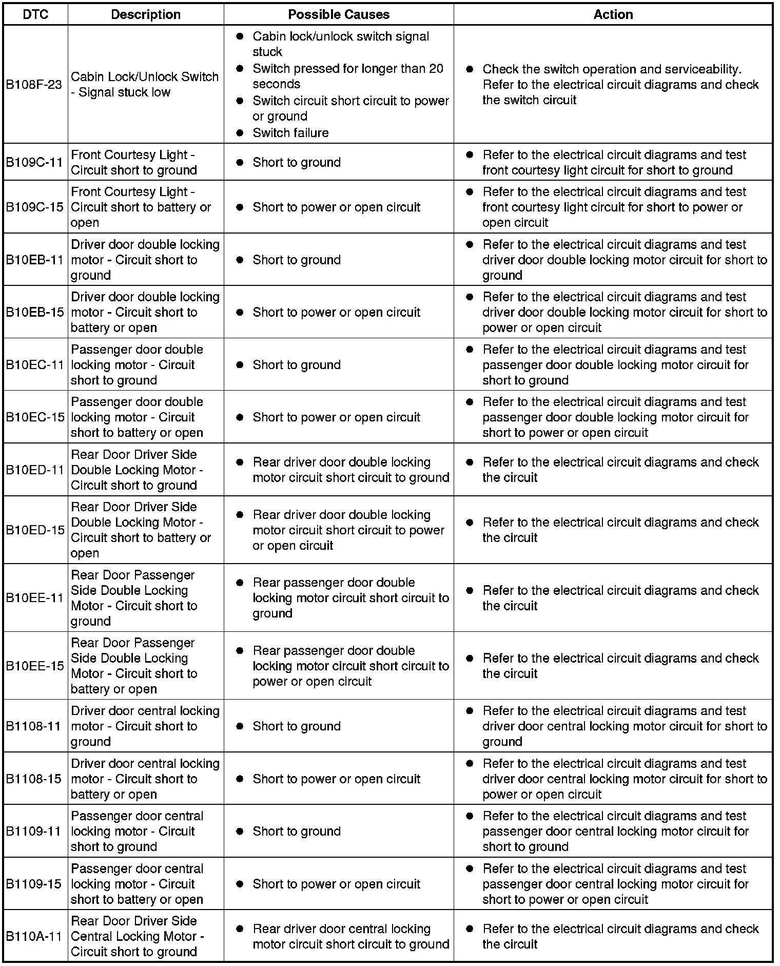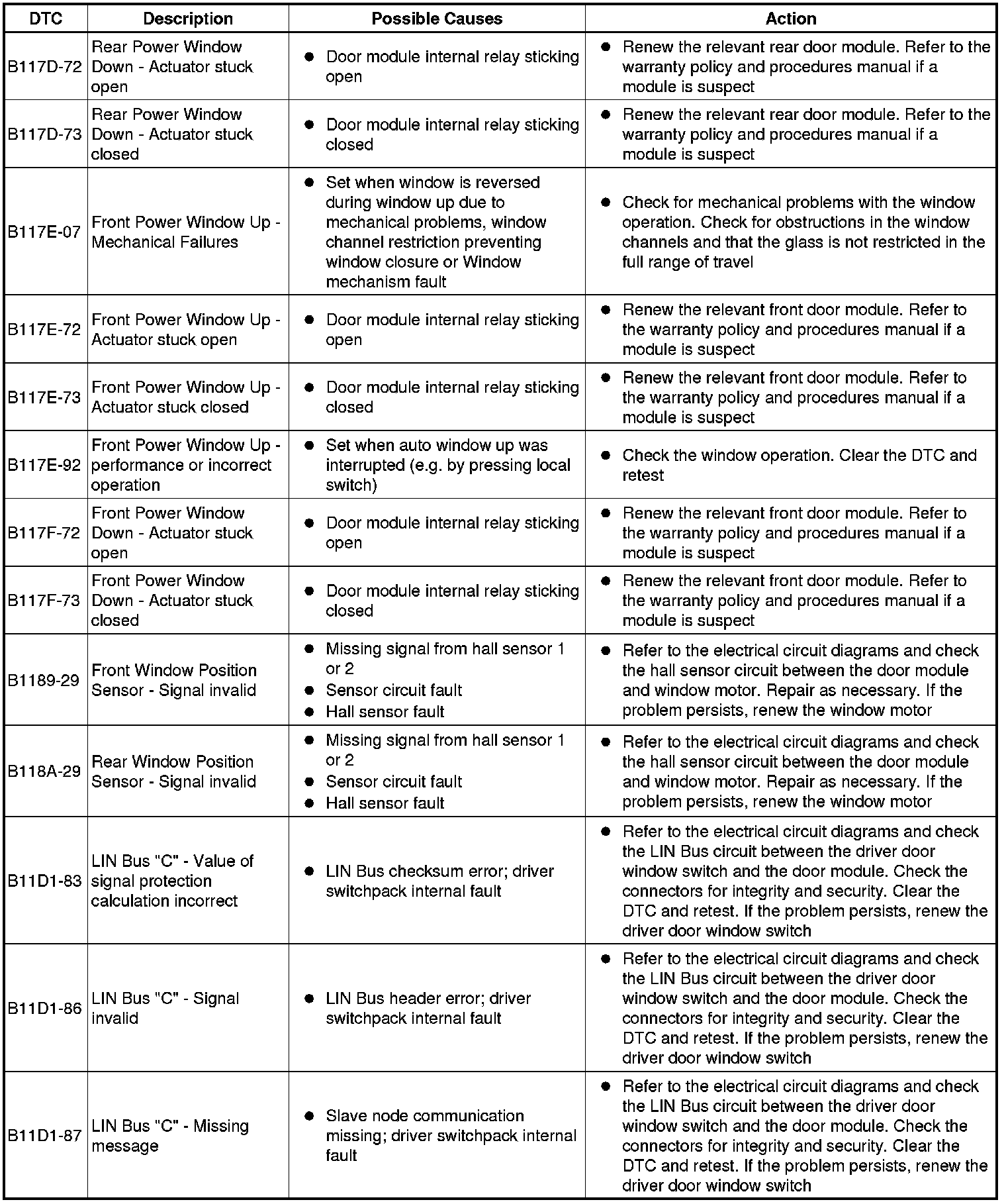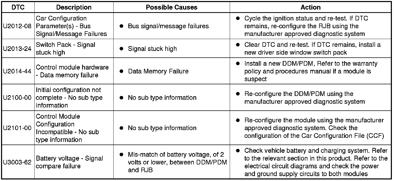 The table below lists all Diagnostic Trouble Codes (DTCs) that could be logged in the Driver/Passenger Door Modules, for additional Diagnosis and Testing information refer to the relevant Diagnosis and Testing Section. For additional information, refer to Driver Door Module (DDM) Initial Inspection and Diagnostic Overview