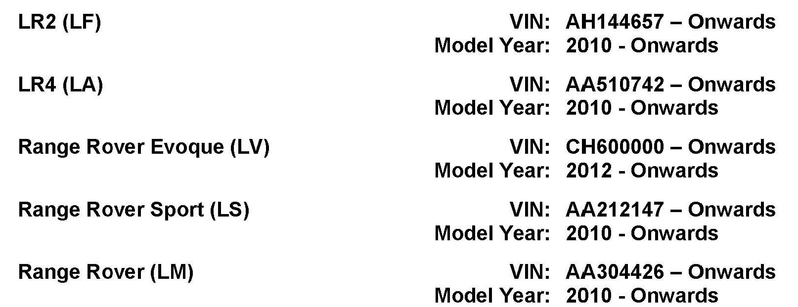 AFFECTED VEHICLE RANGE: