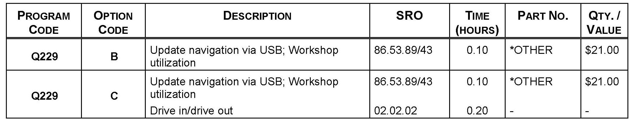 Warranty claims must be submitted quoting Program Code 'Q229' together with the relevant Option Code from the table. The SRO and part information listed have been included for information only. The Option Code(s) that allows for the drive in / drive out allowance can only be claimed if the vehicle is brought back into the workshop for this action alone to be undertaken.