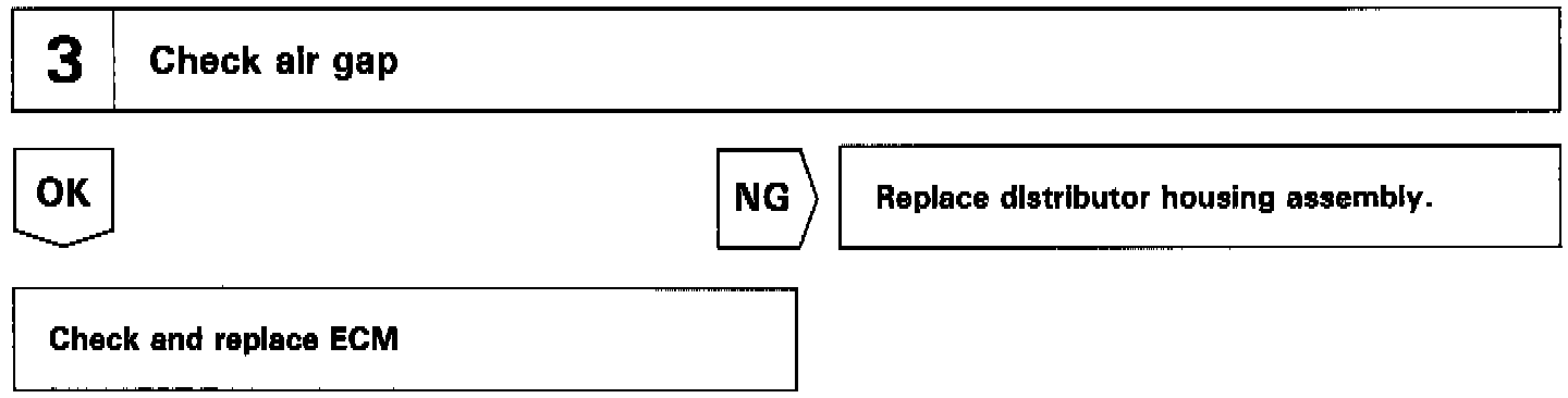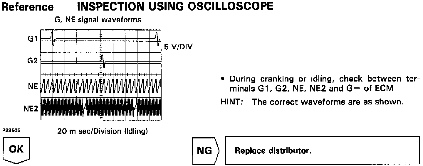 The camshaft position sensors (G1 and G2 signals) consist of a signal plate and a pick up coil. The G1, G2 signal plates each have one tooth on the outer circumference and are built into the distributor. When the camshaft rotates, the protrusion on the signal plate and the air gap on the pick up coil change, causing fluctuations in the magnetic field and generating an electromotive force in the pick up coil. The ECM detects the standard crankshaft angle based on the G1, G2 signals, detects the actual crankshaft angle and engine speed by the NE signals, and detects misfire by NE2 signals.