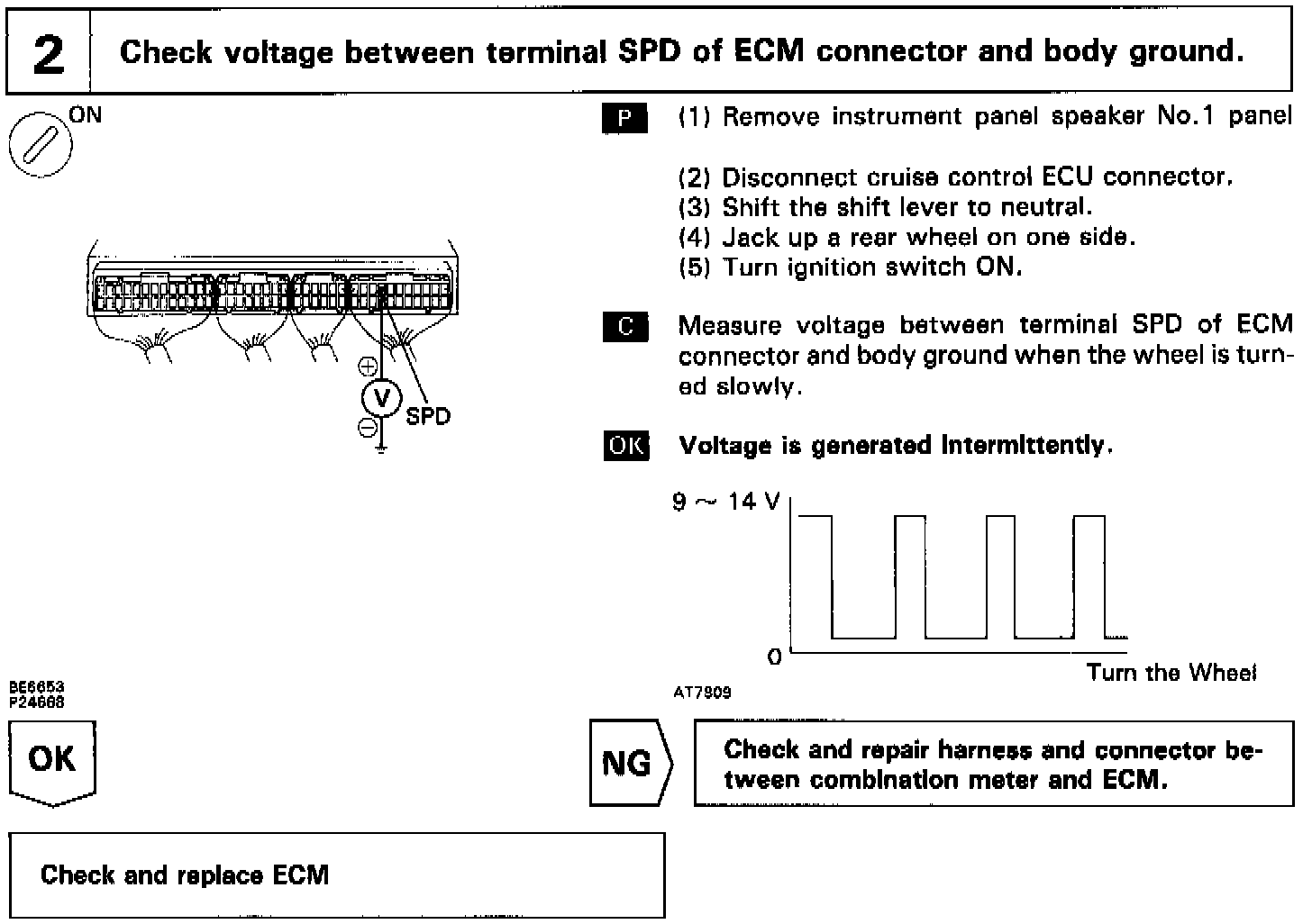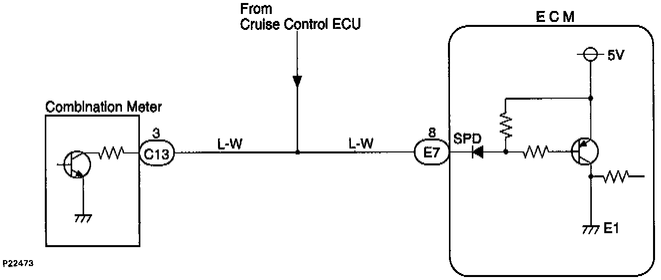 The vehicle speed sensor outputs a 4-pulse signal for every revolution of the rotor shaft, which is rotated by the transmission output shaft via the driven gear. After this signal is converted into a more precise rectangular waveform by the waveform shaping circuit inside the combination meter, it is then transmitted to the ECM. The ECM determines the vehicle speed based on the frequency of these pulse signals.